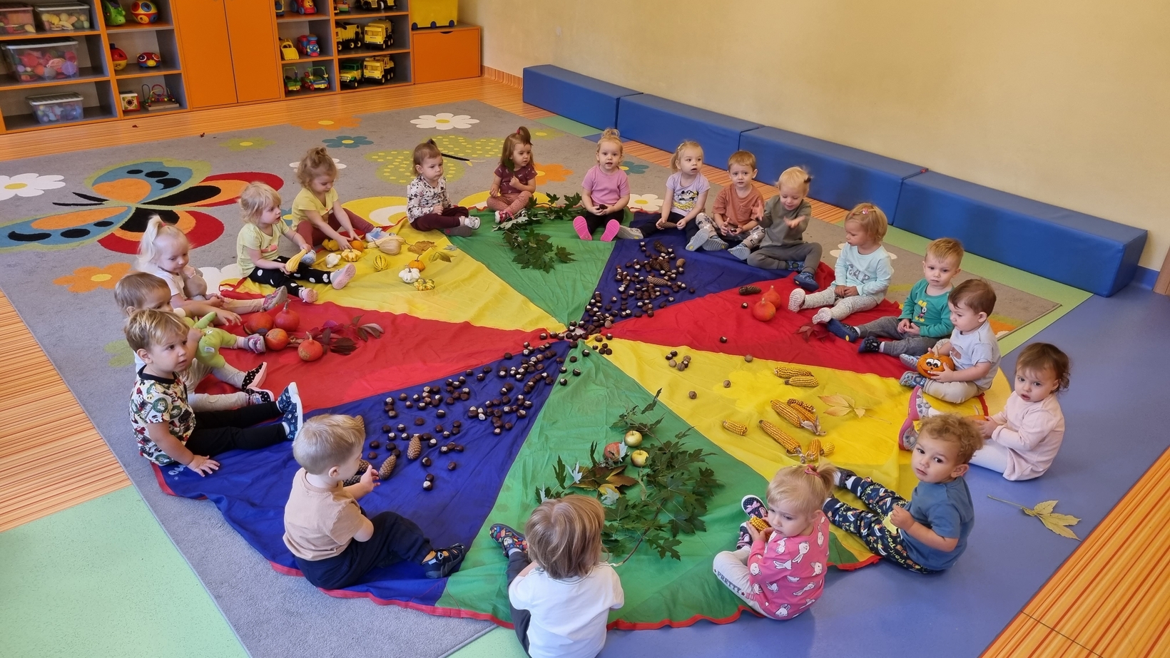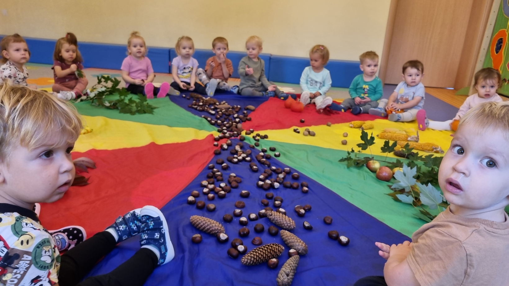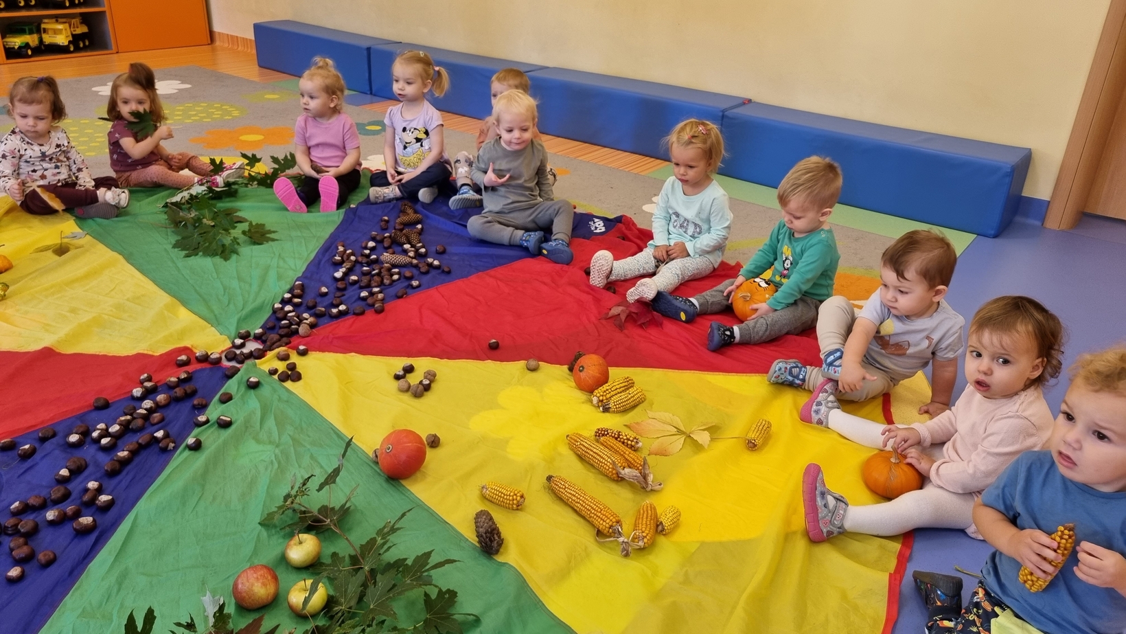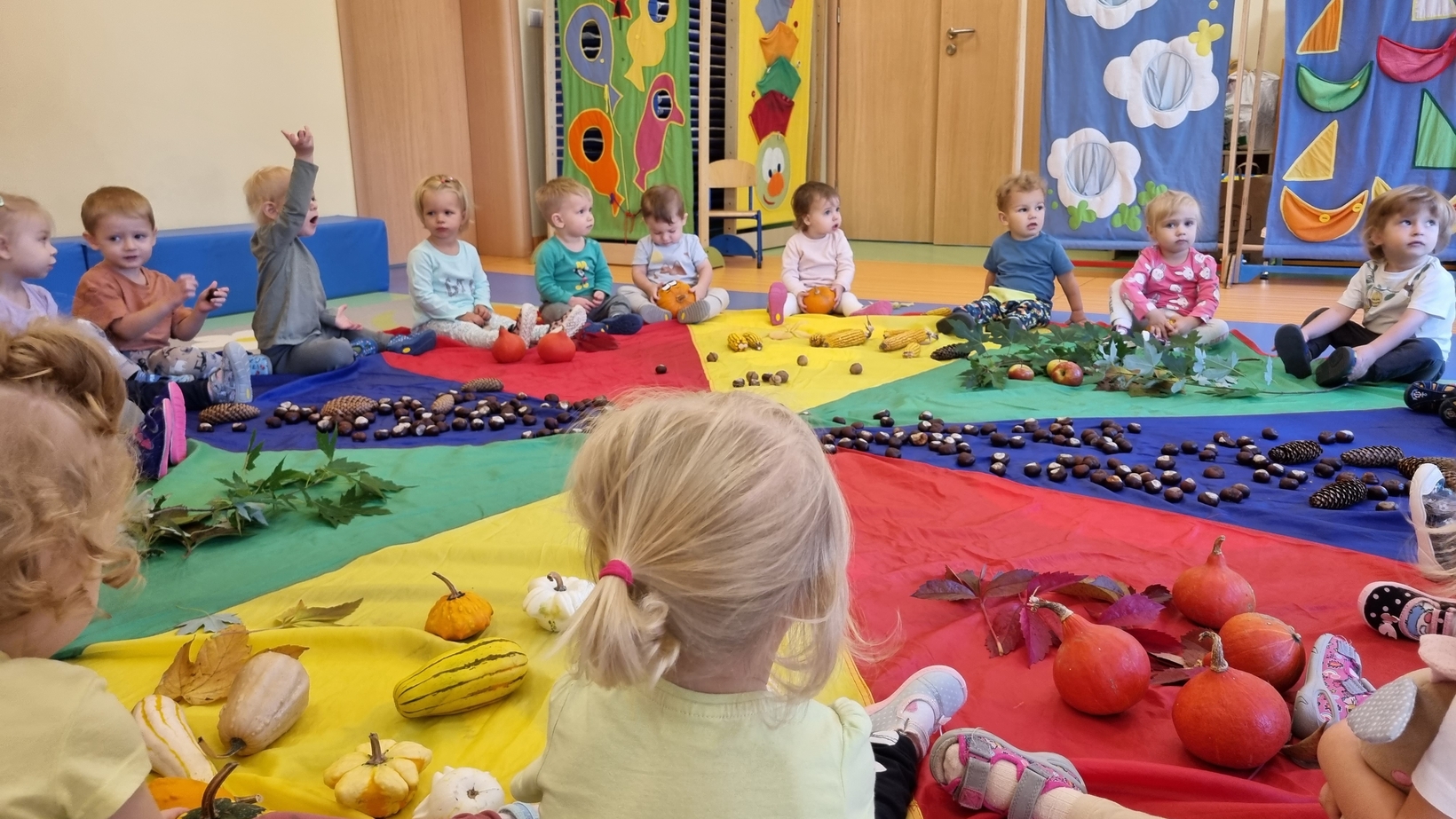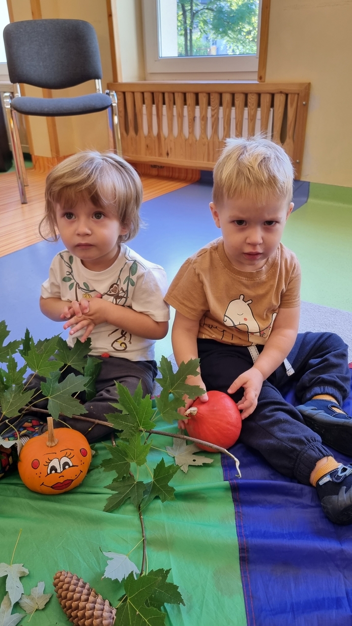 Dzisiaj do "Muchomorków" zawitała Pani Jesień zostawiając swoje dary. A zostawiła ich naprawdę duuuużo... kasztany, żołędzie, orzechy, szyszki i dynie. Wszystkie przedmioty dzieci zbadały przy pomocy zmysłu wzroku, dotyku i węchu. Do naszych zajęć wykorzystaliśmy także chustę animacyjną, na której układaliśmy dary jesieni segregujac je odpowiednio według koloru.