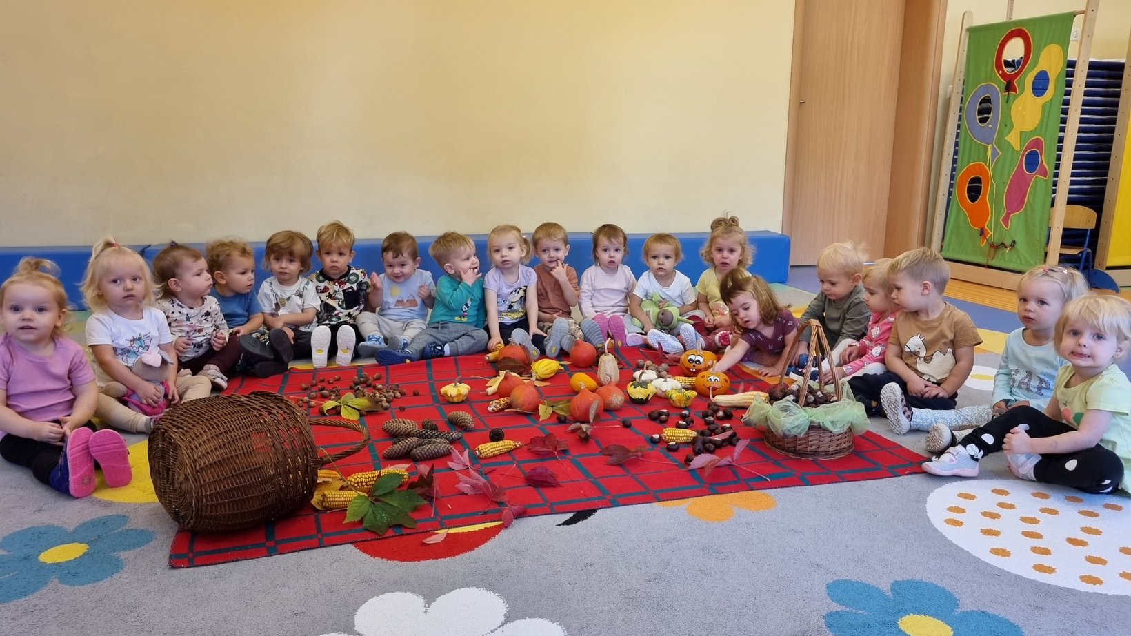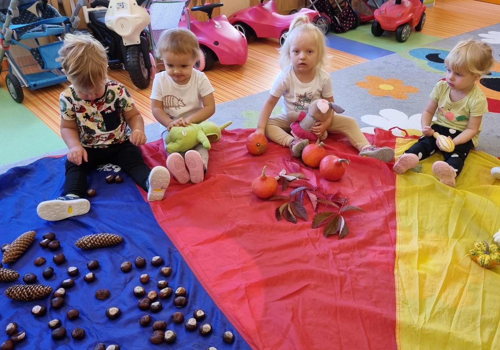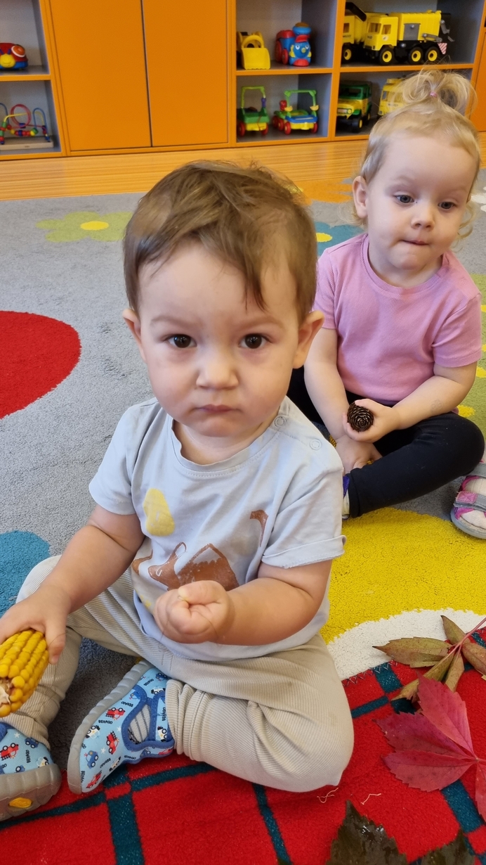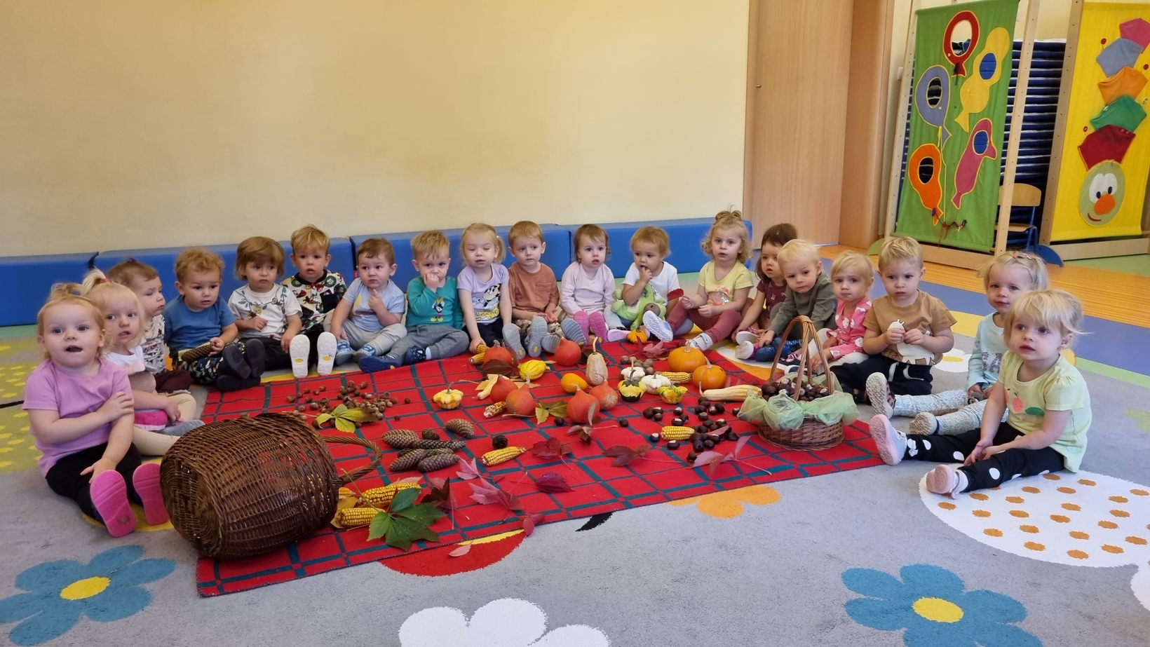 Dzisiaj do "Muchomorków" zawitała Pani Jesień zostawiając swoje dary. A zostawiła ich naprawdę duuuużo... kasztany, żołędzie, orzechy, szyszki i dynie. Wszystkie przedmioty dzieci zbadały przy pomocy zmysłu wzroku, dotyku i węchu. Do naszych zajęć wykorzystaliśmy także chustę animacyjną, na której układaliśmy dary jesieni segregujac je odpowiednio według koloru.