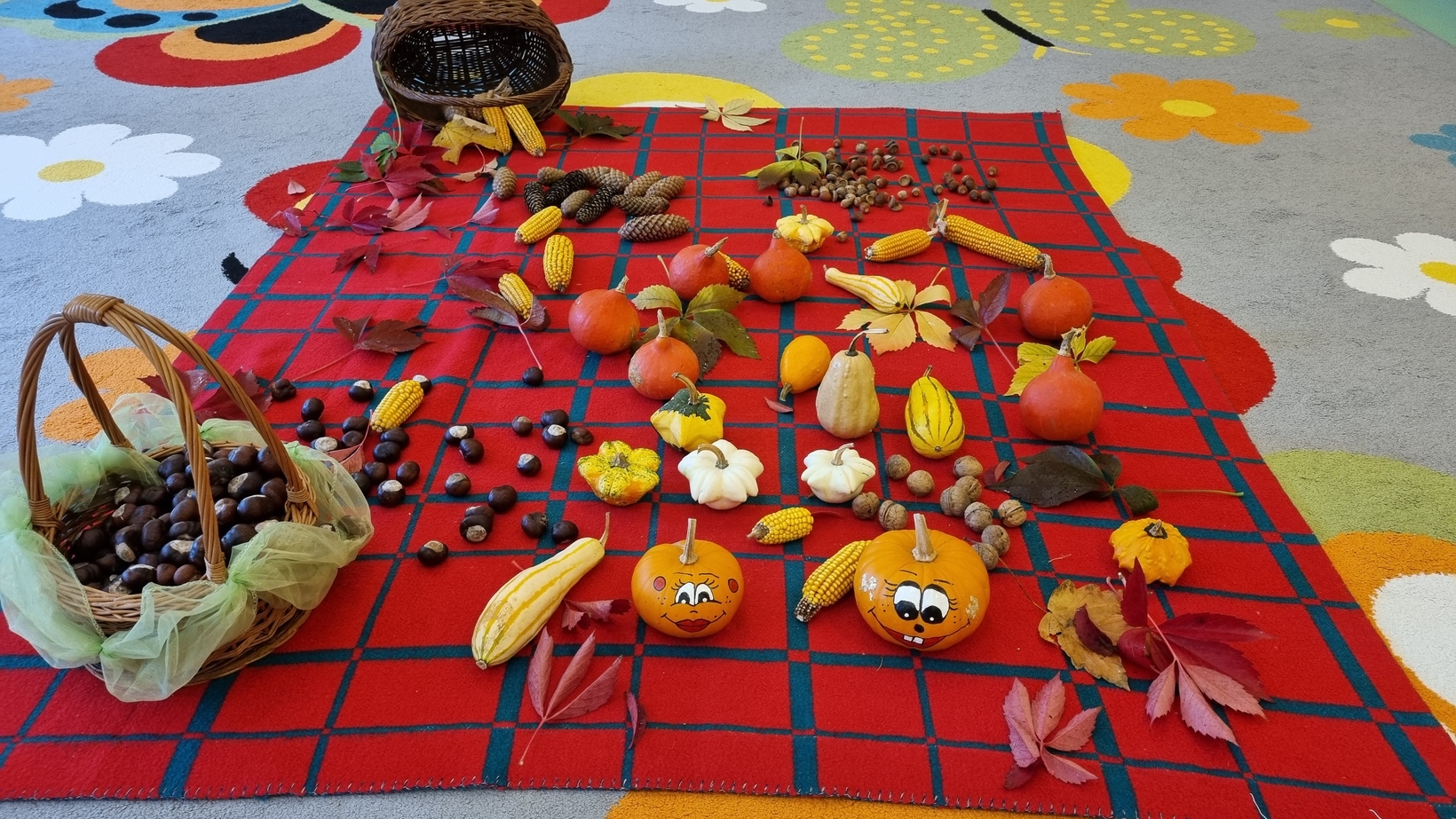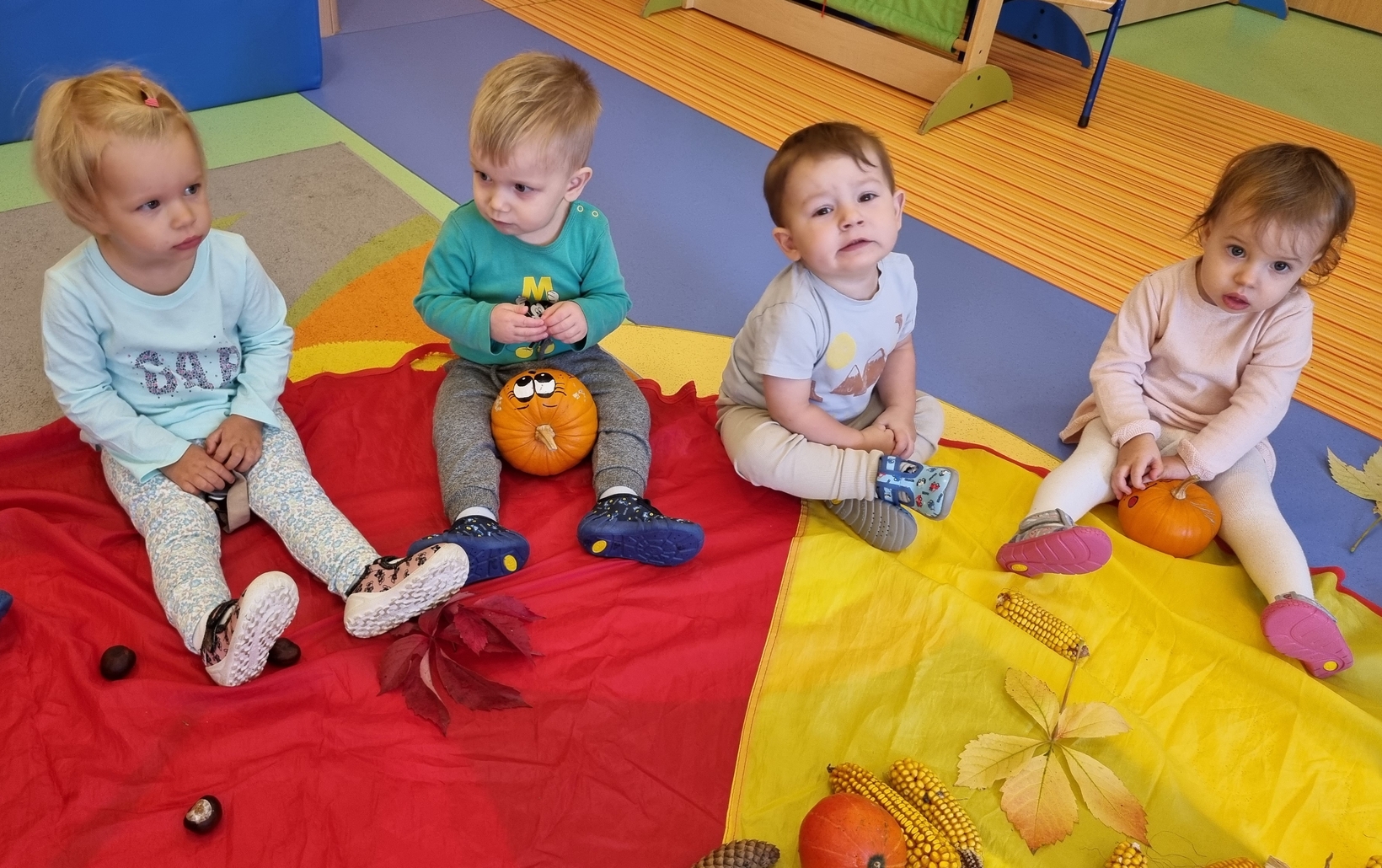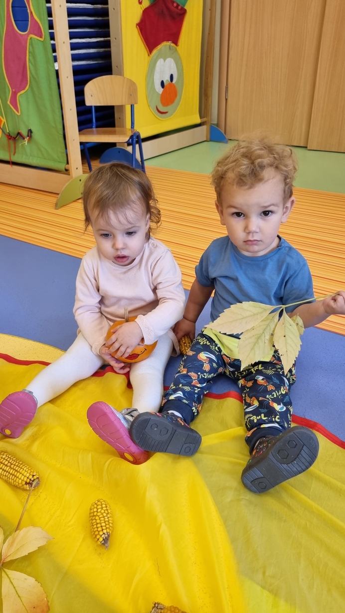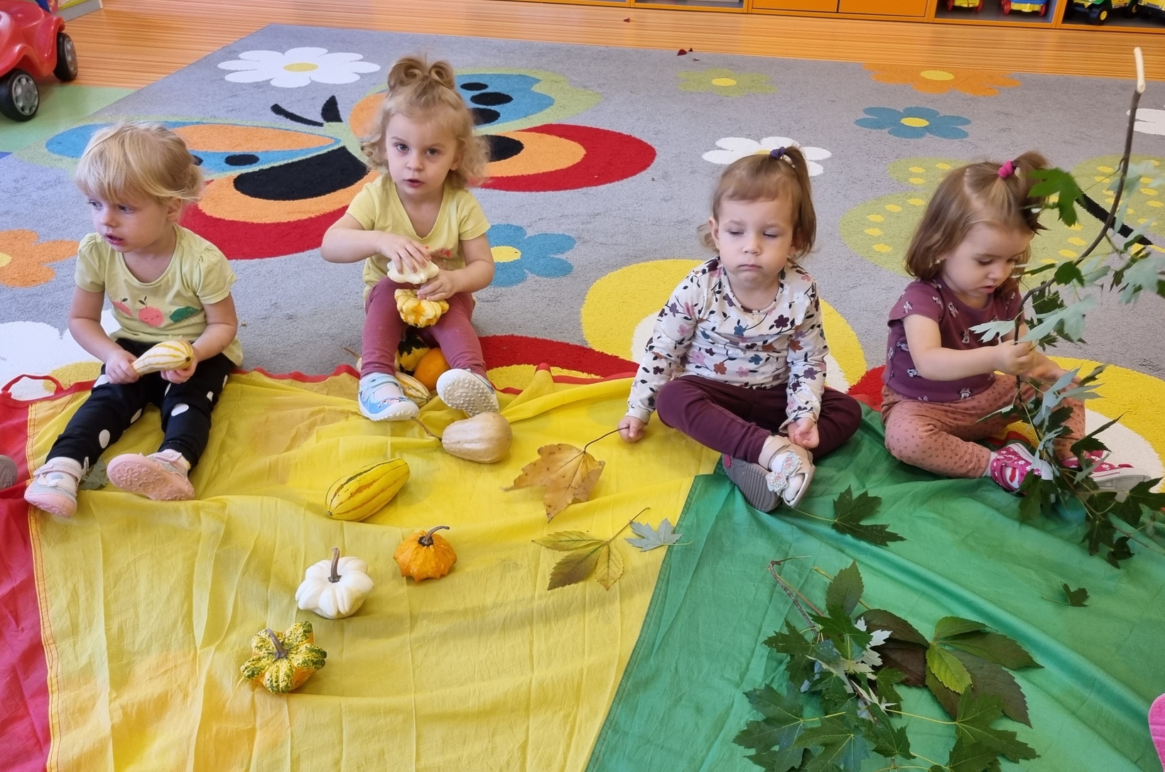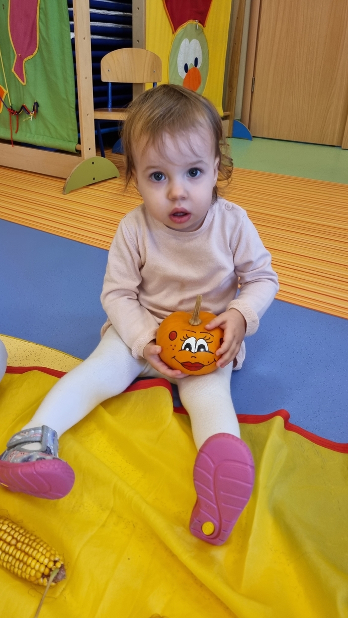 Dzisiaj do "Muchomorków" zawitała Pani Jesień zostawiając swoje dary. A zostawiła ich naprawdę duuuużo... kasztany, żołędzie, orzechy, szyszki i dynie. Wszystkie przedmioty dzieci zbadały przy pomocy zmysłu wzroku, dotyku i węchu. Do naszych zajęć wykorzystaliśmy także chustę animacyjną, na której układaliśmy dary jesieni segregujac je odpowiednio według koloru.