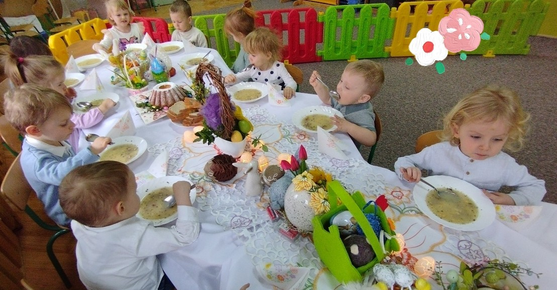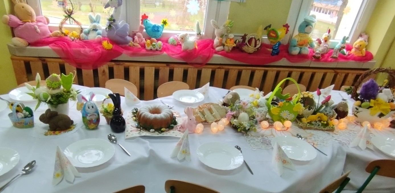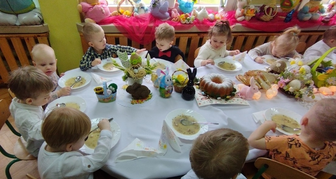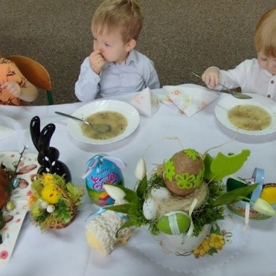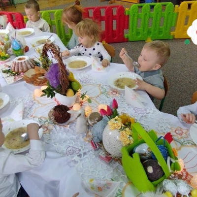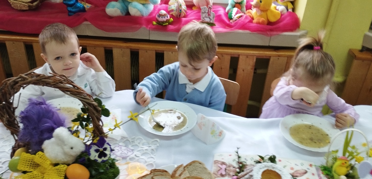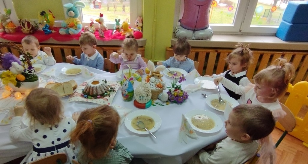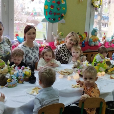 Dzieci podczas śniadania wielkanocnego z panią kierownik i opiekunkami .