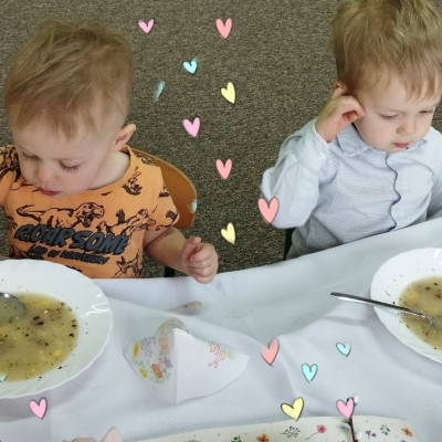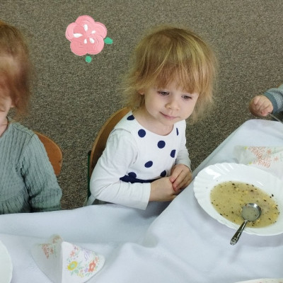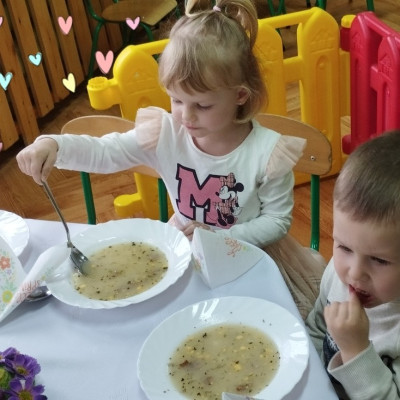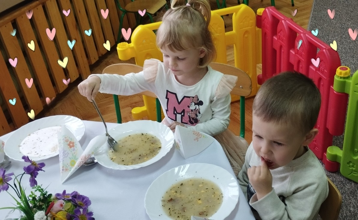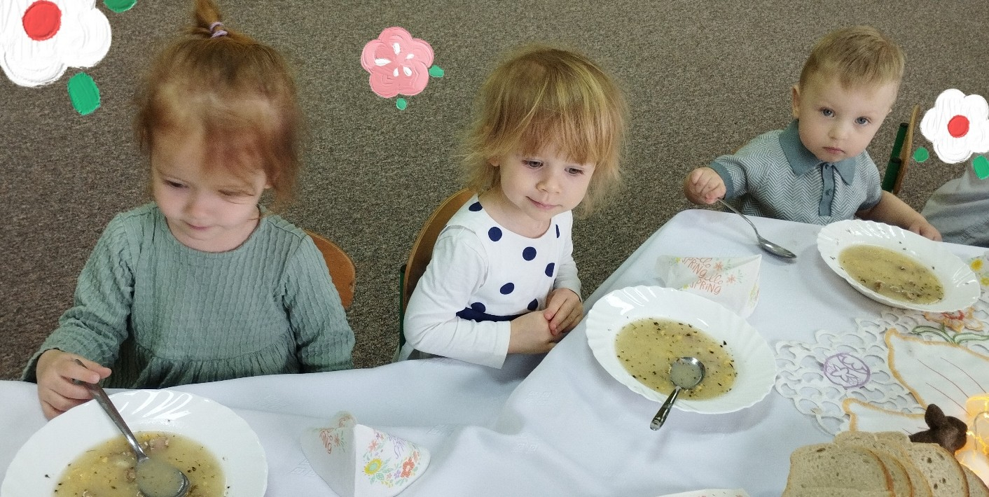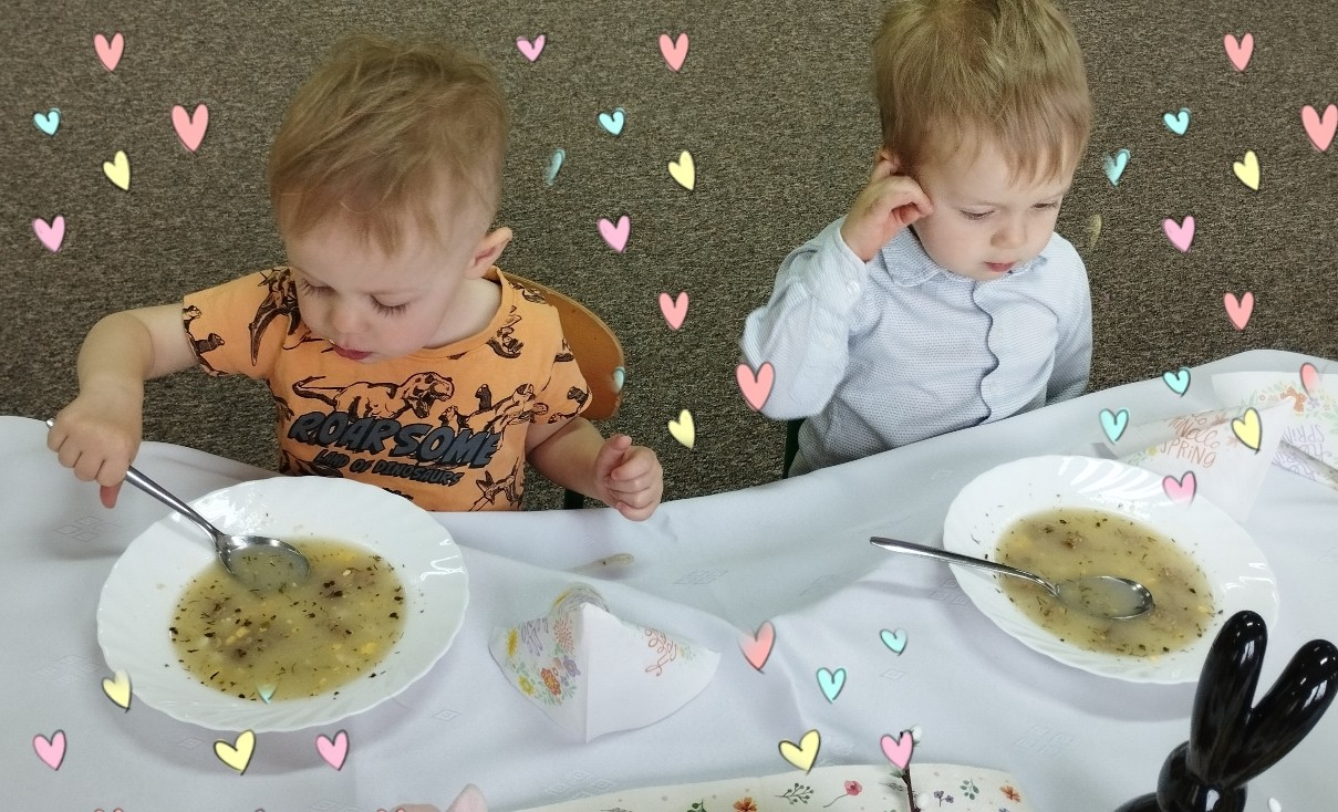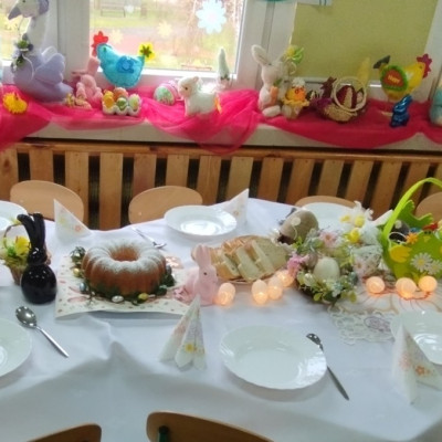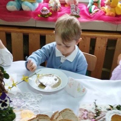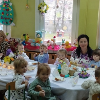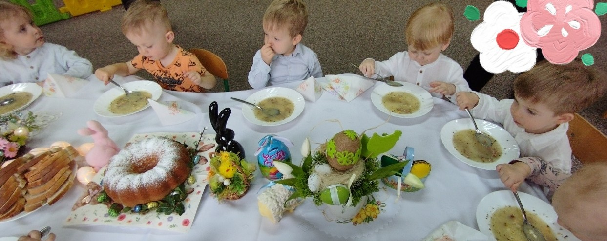 Dzieci podczas śniadania wielkanocnego z panią kierownik i opiekunkami .