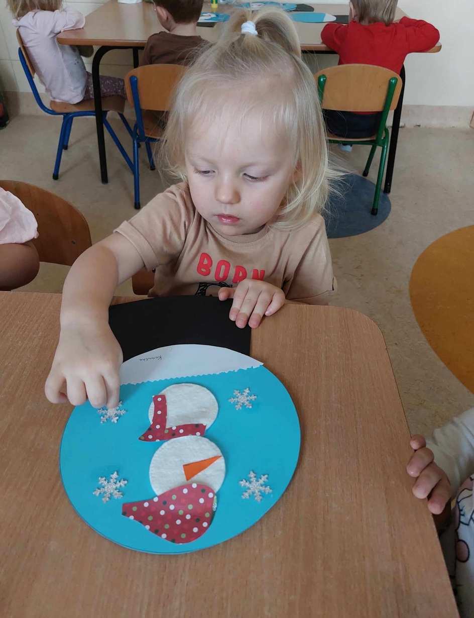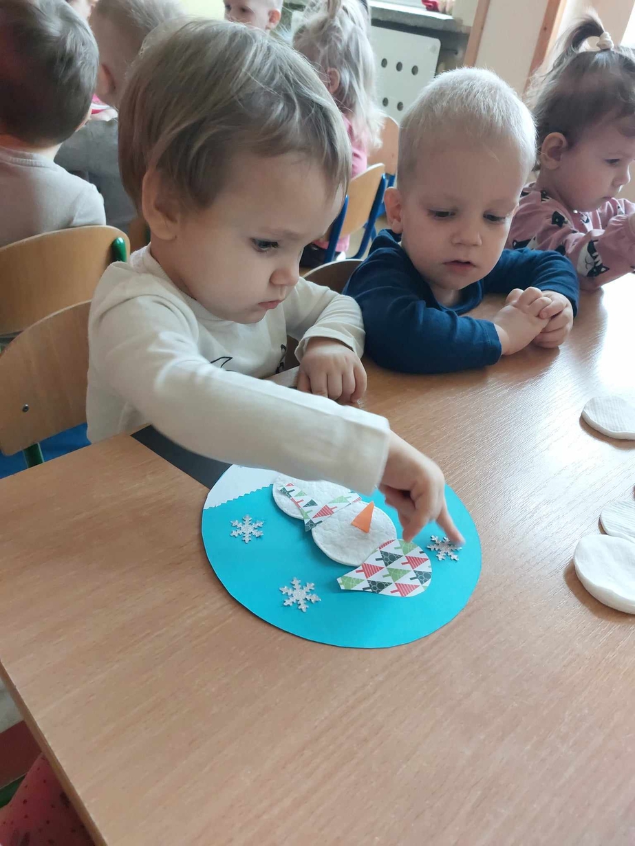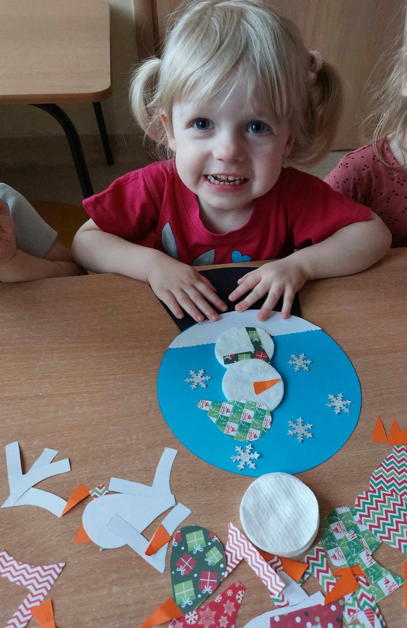 W związku z tym dzieci z grupy Muchomorków wykonały prace plastyczna -"Bałwanek"-wykorzystując do tego płatki kosmetyczne,kolorowy papier i pompony.