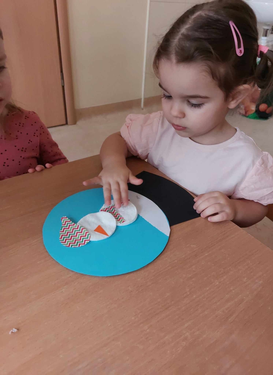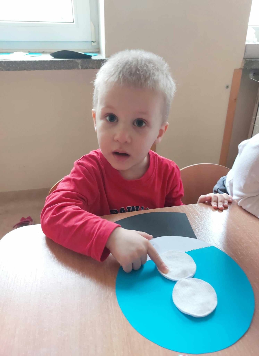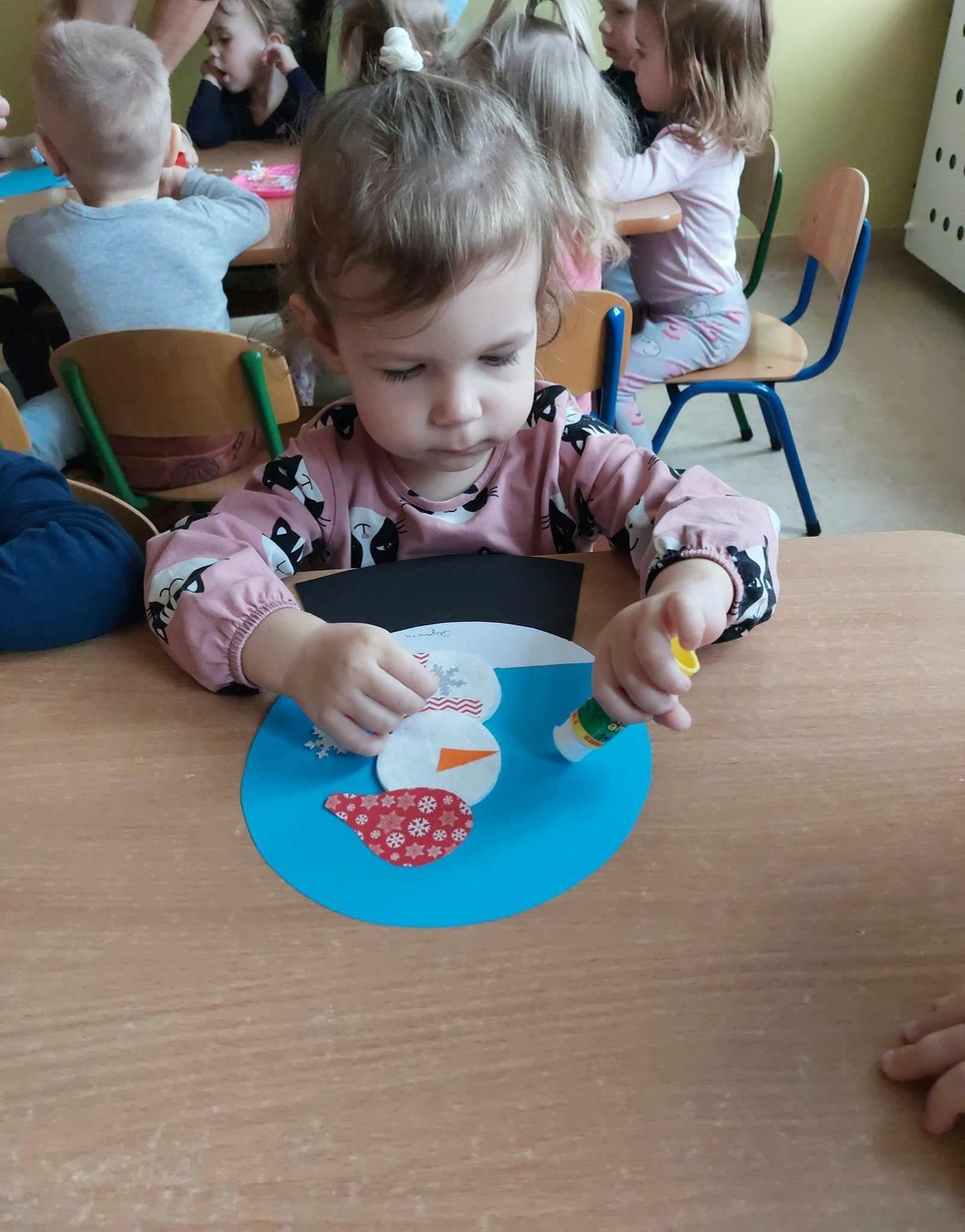 W związku z tym dzieci z grupy Muchomorków wykonały prace plastyczna -"Bałwanek"-wykorzystując do tego płatki kosmetyczne,kolorowy papier i pompony.