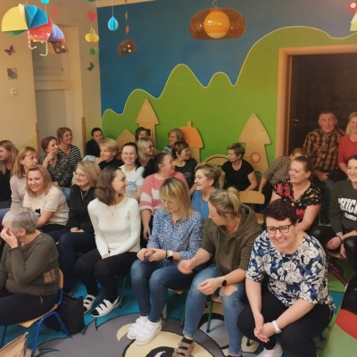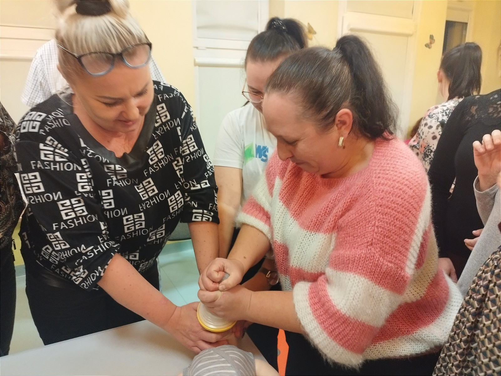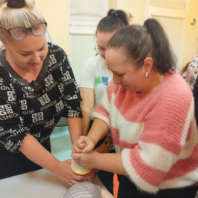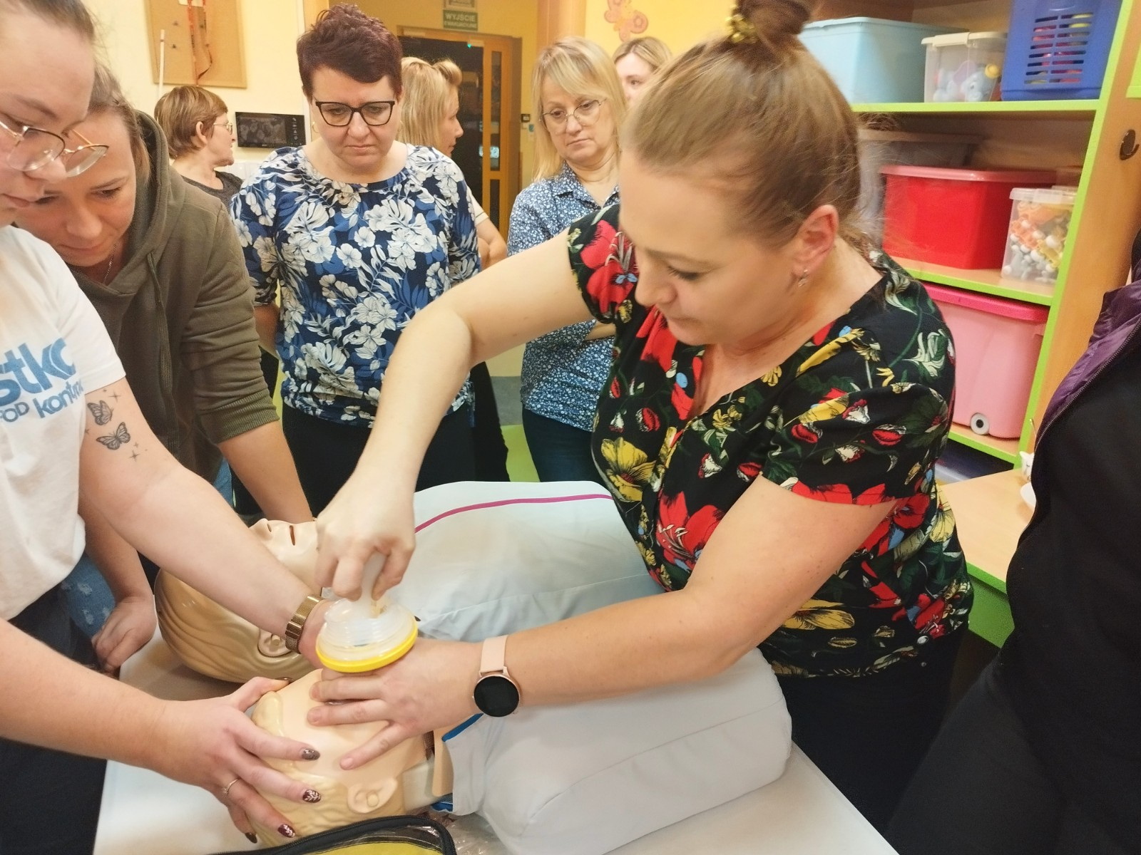 Zdjęcie przedstawia personel Zespołu Żłobków Miejskich podczas kursu z pierwszej pomocy