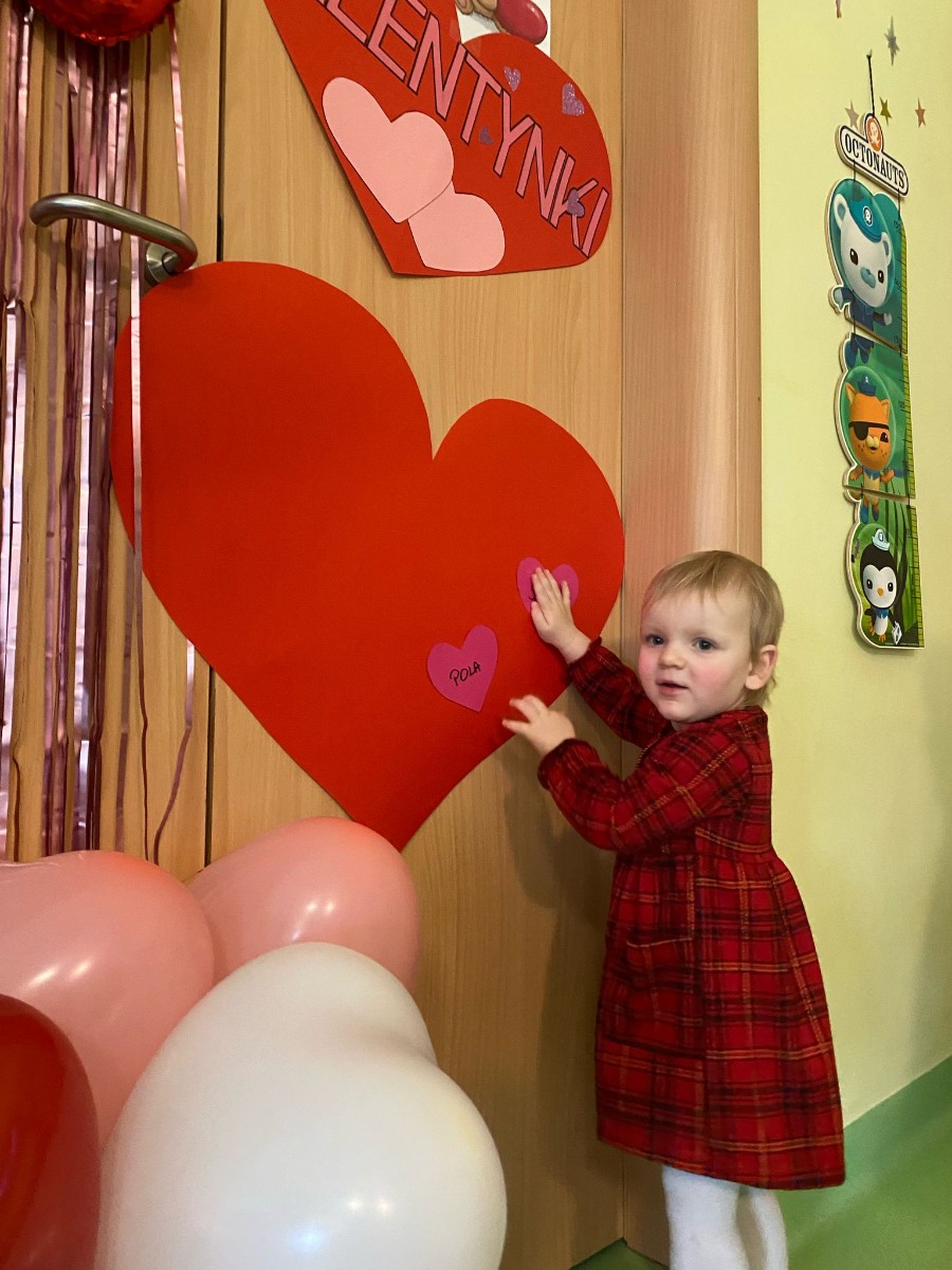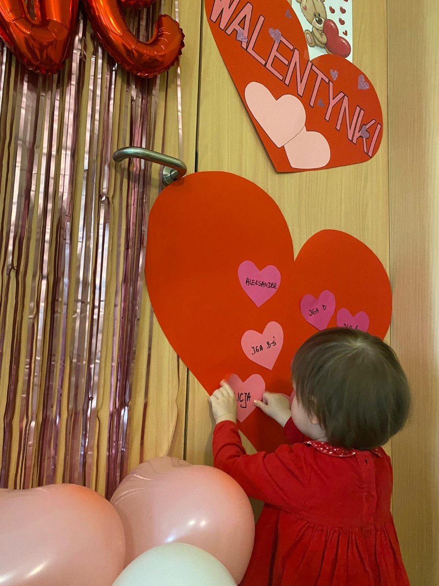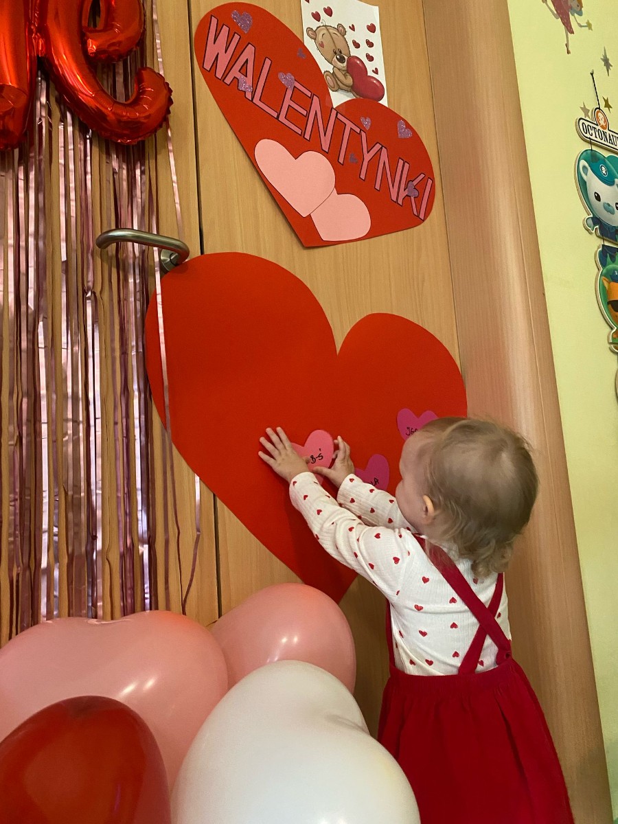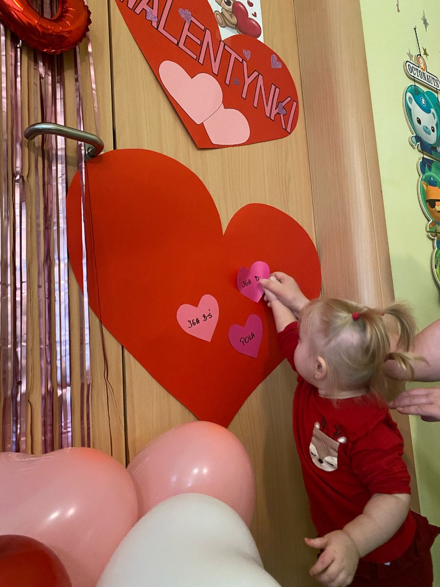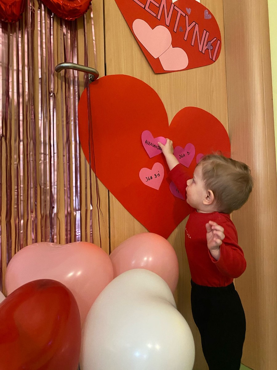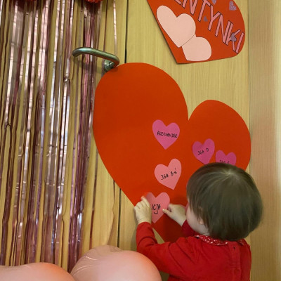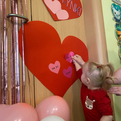 Wszystkie nasze pociechy przyszły ubrane na czerwono, dzieci pozowały do zdjęć oraz brały udział w zabawie podczas, której przyklejały serduszka ze swoim imieniem na dużym czerwonym sercu.