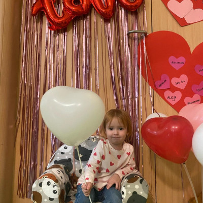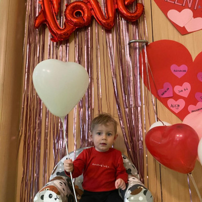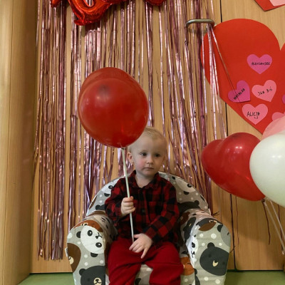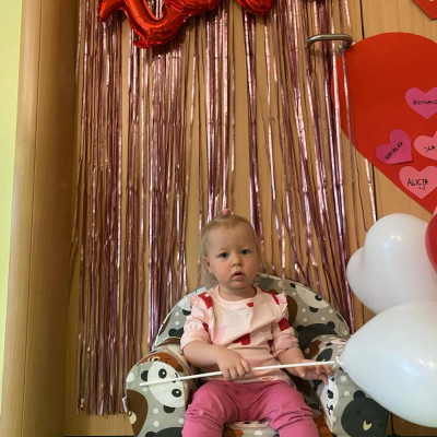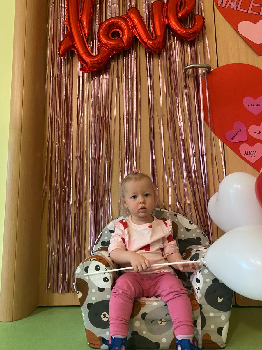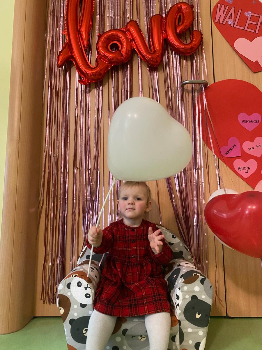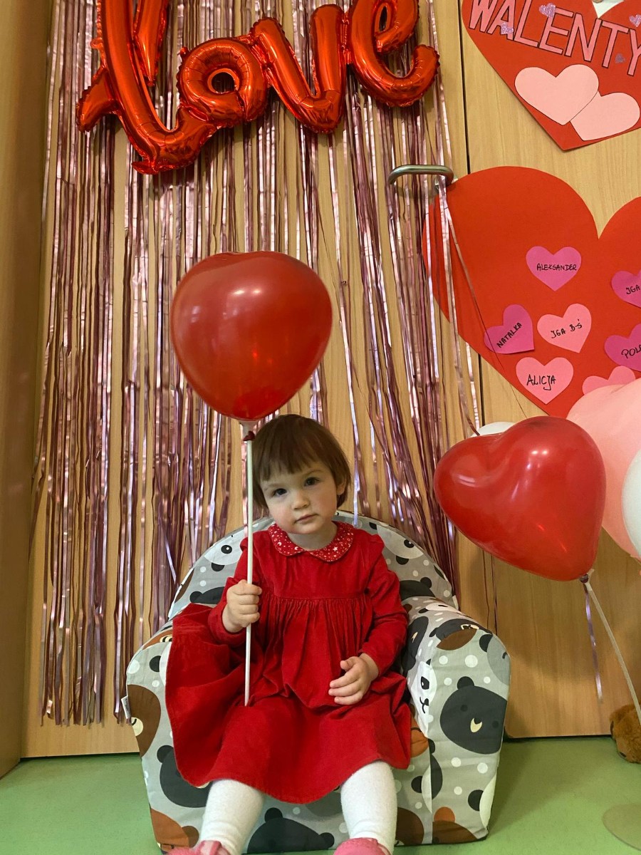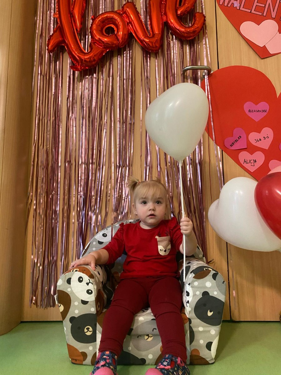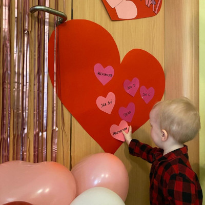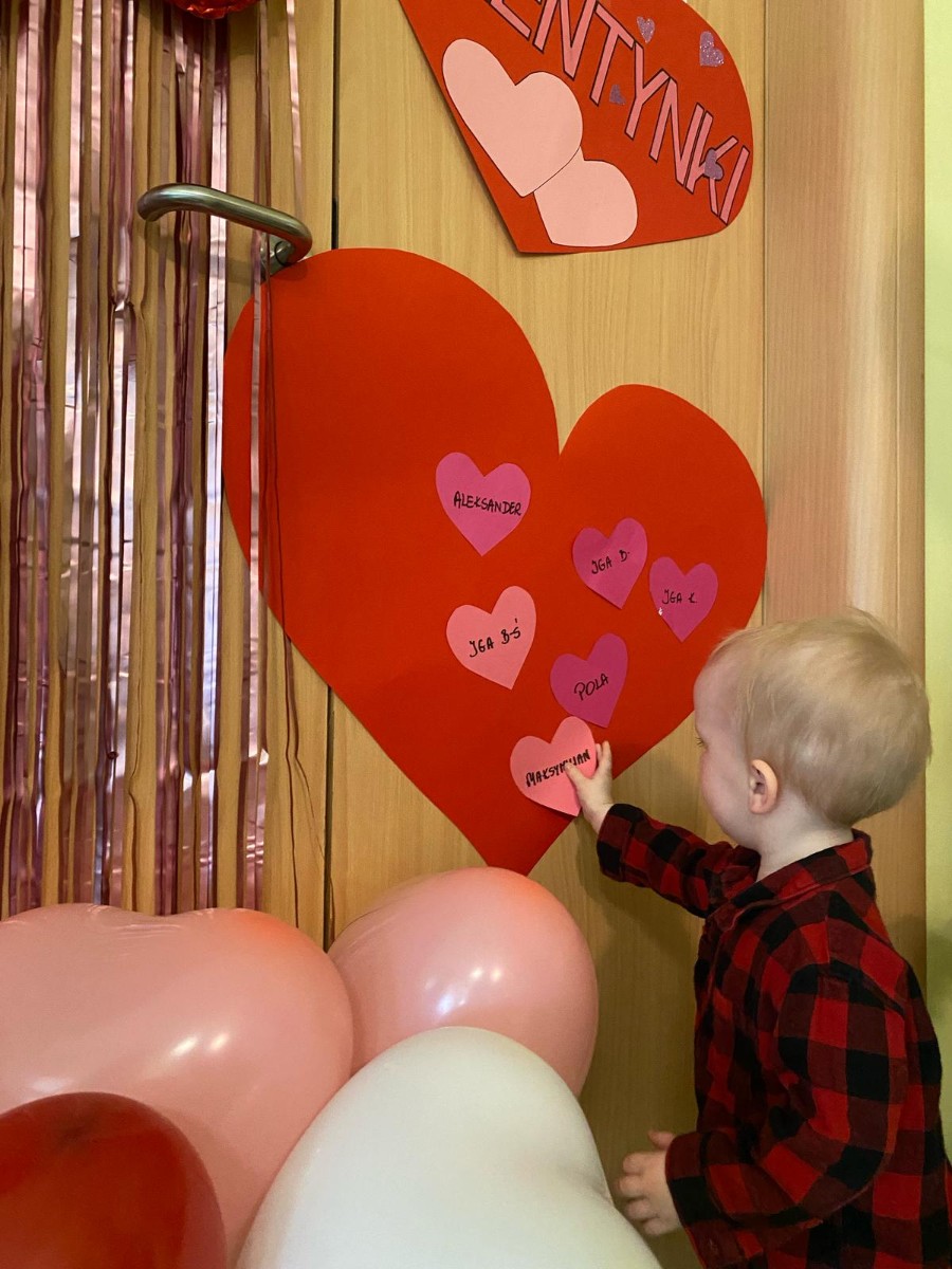 Wszystkie nasze pociechy przyszły ubrane na czerwono, dzieci pozowały do zdjęć oraz brały udział w zabawie podczas, której przyklejały serduszka ze swoim imieniem na dużym czerwonym sercu.
