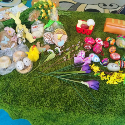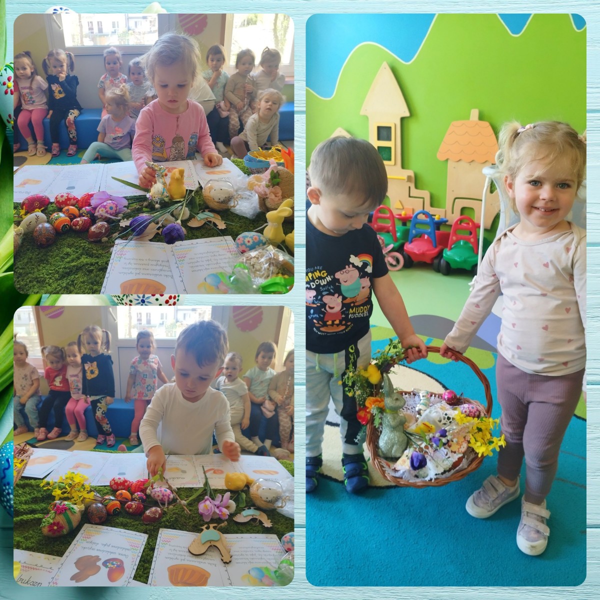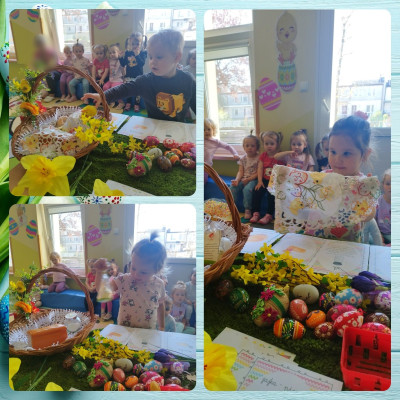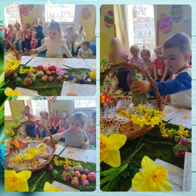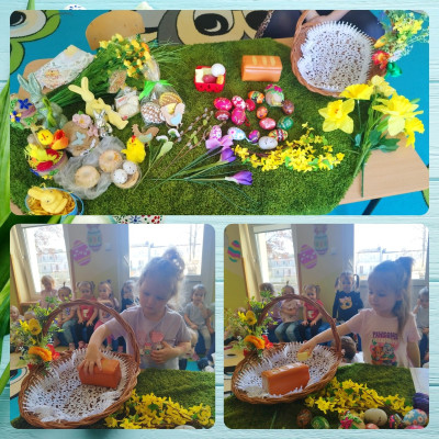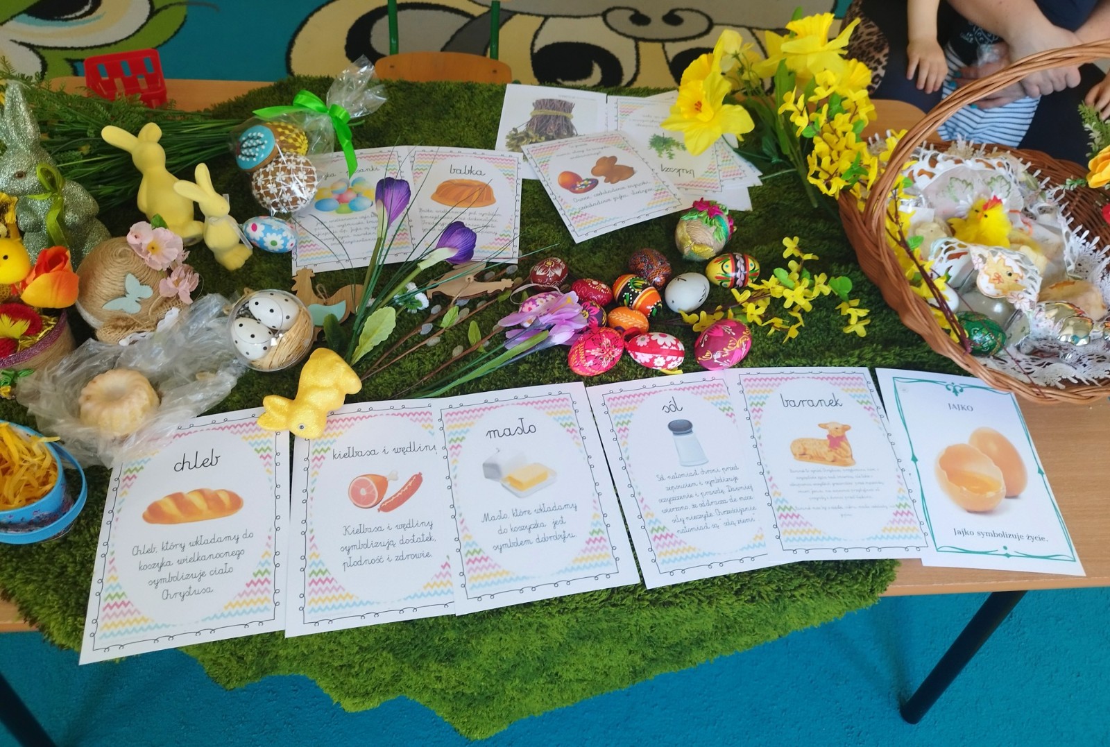 Podczas zajęć tematycznych dowiedzieli się jak przygotować koszyczek ze święconką. Każdy niezbędny element z koszyczka (chleb, jajka, baranek, sól, pisanki, chrzan itd) został dokładnie omówiony i zapakowany.