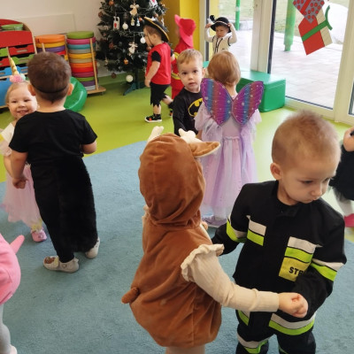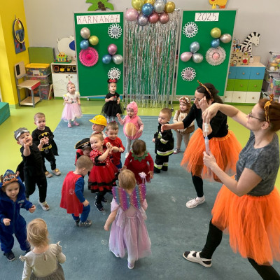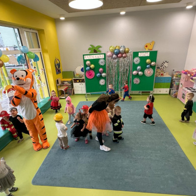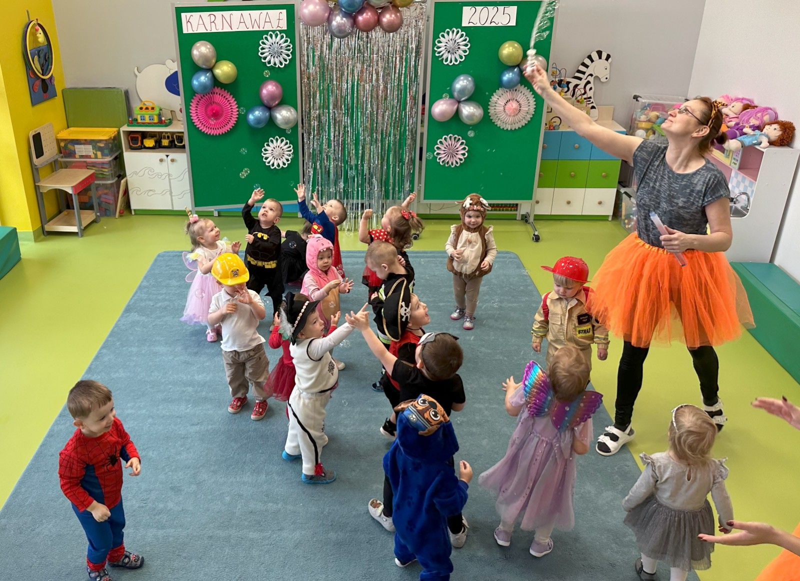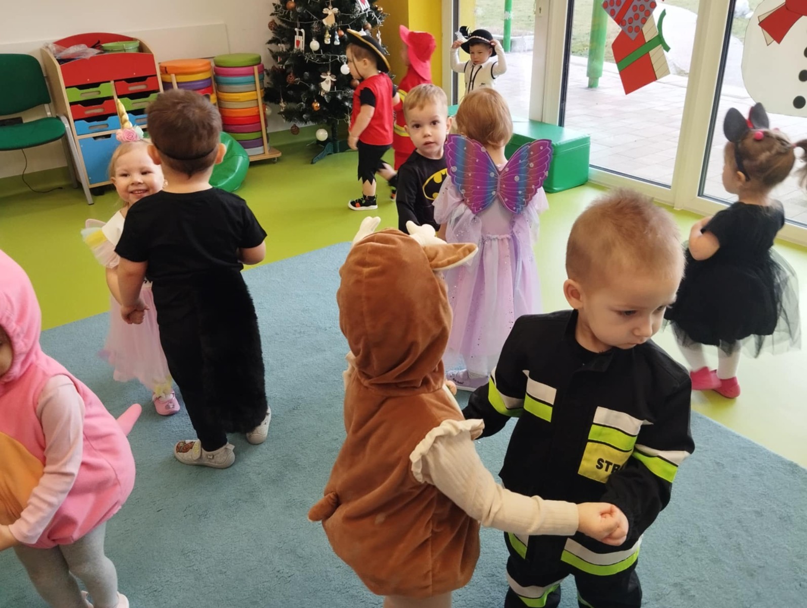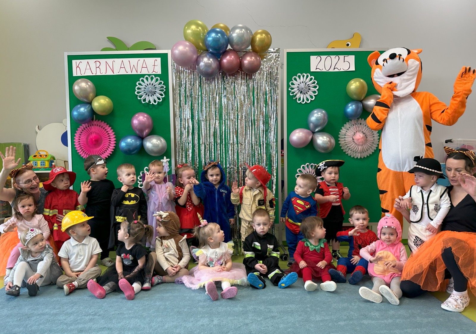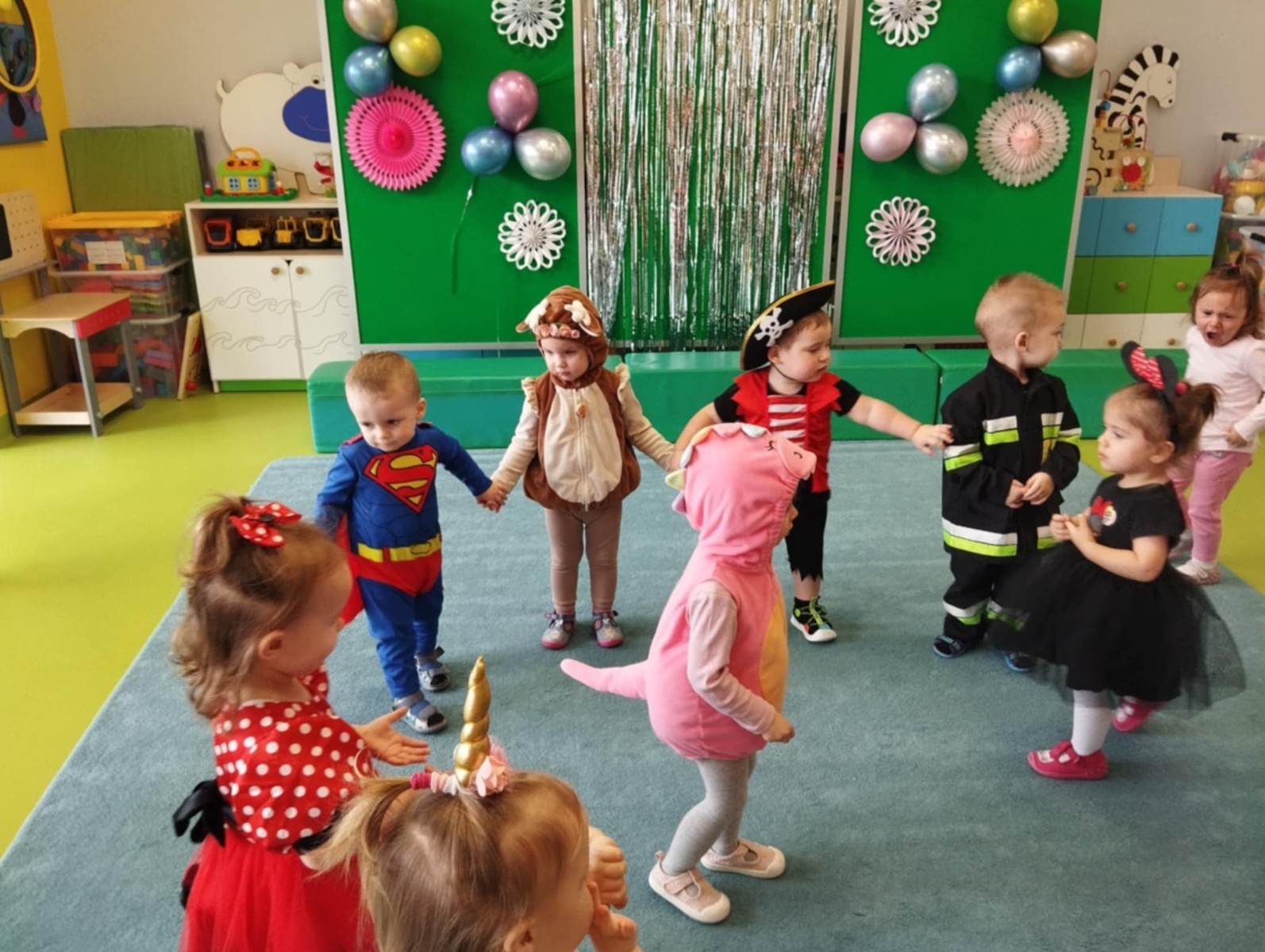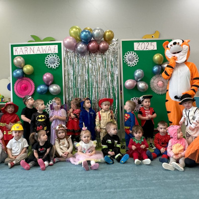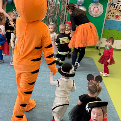 W piątek w naszej grupie odbył się prawdziwy Bal Karnawałowy! Dla wielu Tygrysków był to pierwszy bal przebierańców w życiu! Wszystkie dzieci przybyły tego dnia do żłobka we wspaniałych karnawałowych strojach. Dzieci podczas balu bawiły się przy muzyce, tańczyły w parach i kółeczkach. Nasz żłobek stał się „Bajkową Krainą”, w której można było spotkać między innymi królewny, wróżki, rycerzy, piratów, policjantów oraz wiele innych baśniowych postaci. Nie zabrakło nawet Tygryska, który bawił się razem z dziećmi, a na koniec zrobił sobie pamiątkowe zdjęcie grupowe z całą grupą Tygrysków 😊 Przez cały dzień uśmiech nie znikał z twarzy dzieci, a po zabawie przyszedł czas na odpoczynek i mała niespodzianka w postaci drobnych upominków.