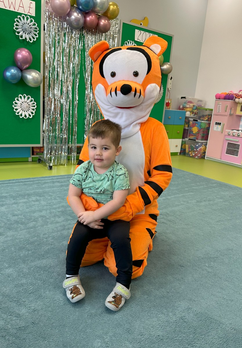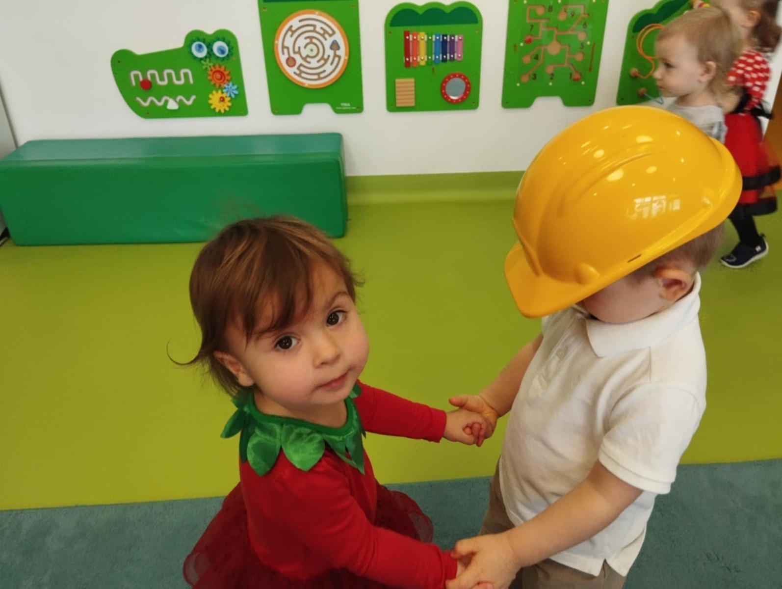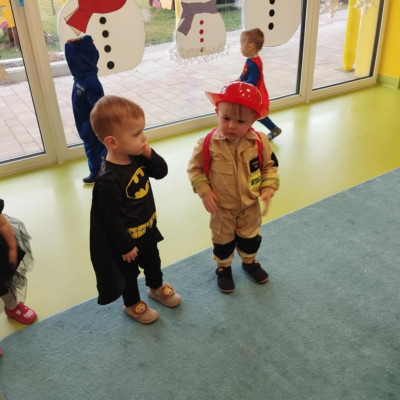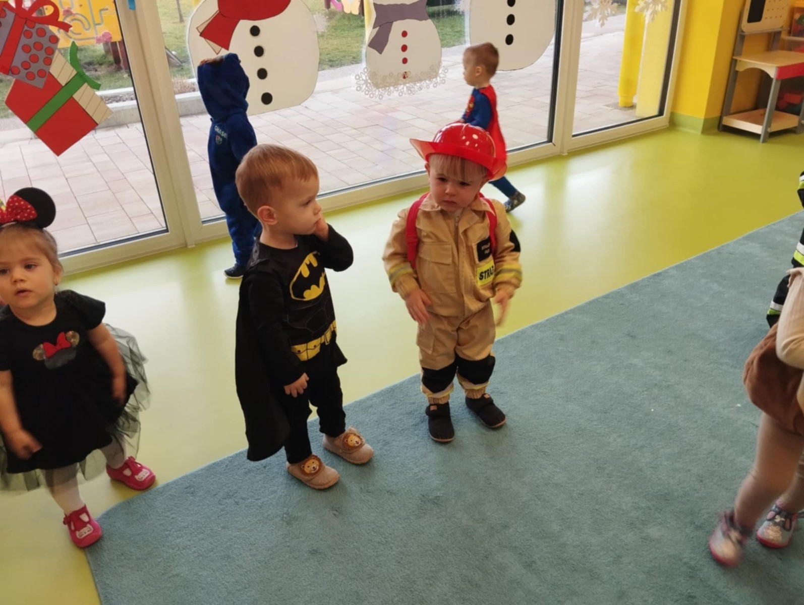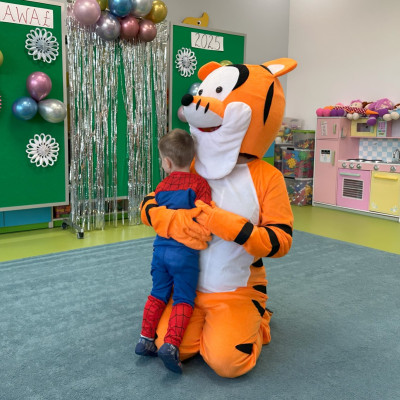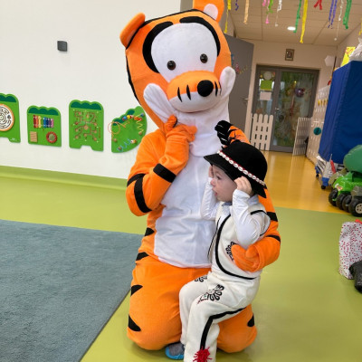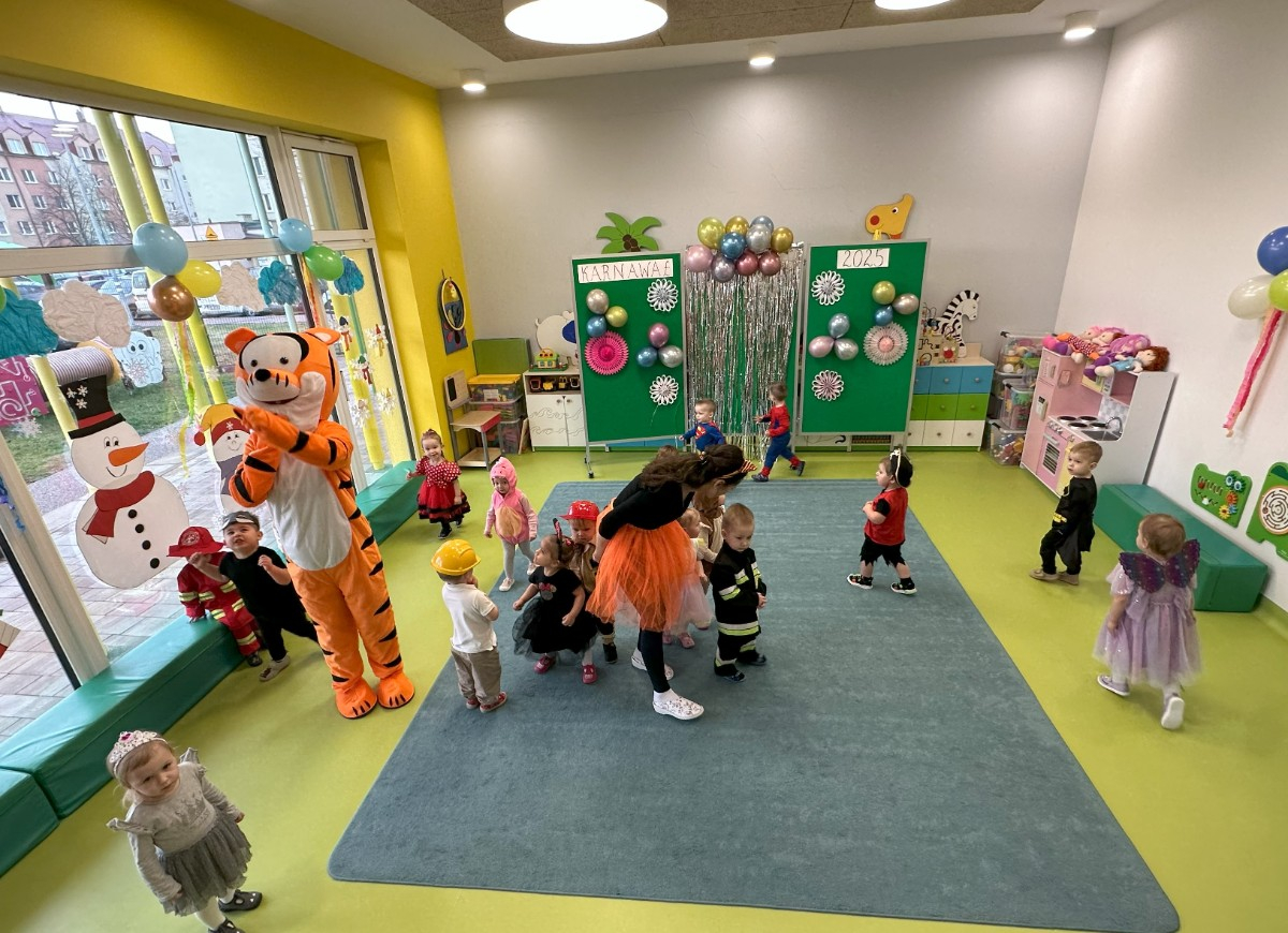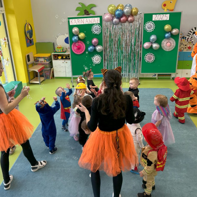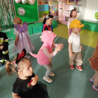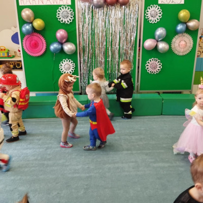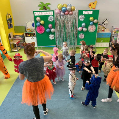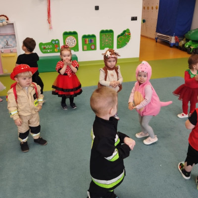 W piątek w naszej grupie odbył się prawdziwy Bal Karnawałowy! Dla wielu Tygrysków był to pierwszy bal przebierańców w życiu! Wszystkie dzieci przybyły tego dnia do żłobka we wspaniałych karnawałowych strojach. Dzieci podczas balu bawiły się przy muzyce, tańczyły w parach i kółeczkach. Nasz żłobek stał się „Bajkową Krainą”, w której można było spotkać między innymi królewny, wróżki, rycerzy, piratów, policjantów oraz wiele innych baśniowych postaci. Nie zabrakło nawet Tygryska, który bawił się razem z dziećmi, a na koniec zrobił sobie pamiątkowe zdjęcie grupowe z całą grupą Tygrysków 😊 Przez cały dzień uśmiech nie znikał z twarzy dzieci, a po zabawie przyszedł czas na odpoczynek i mała niespodzianka w postaci drobnych upominków.
