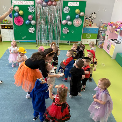 Zdjęcie przedstawia dzieci bawiące się na balu karnawałowym