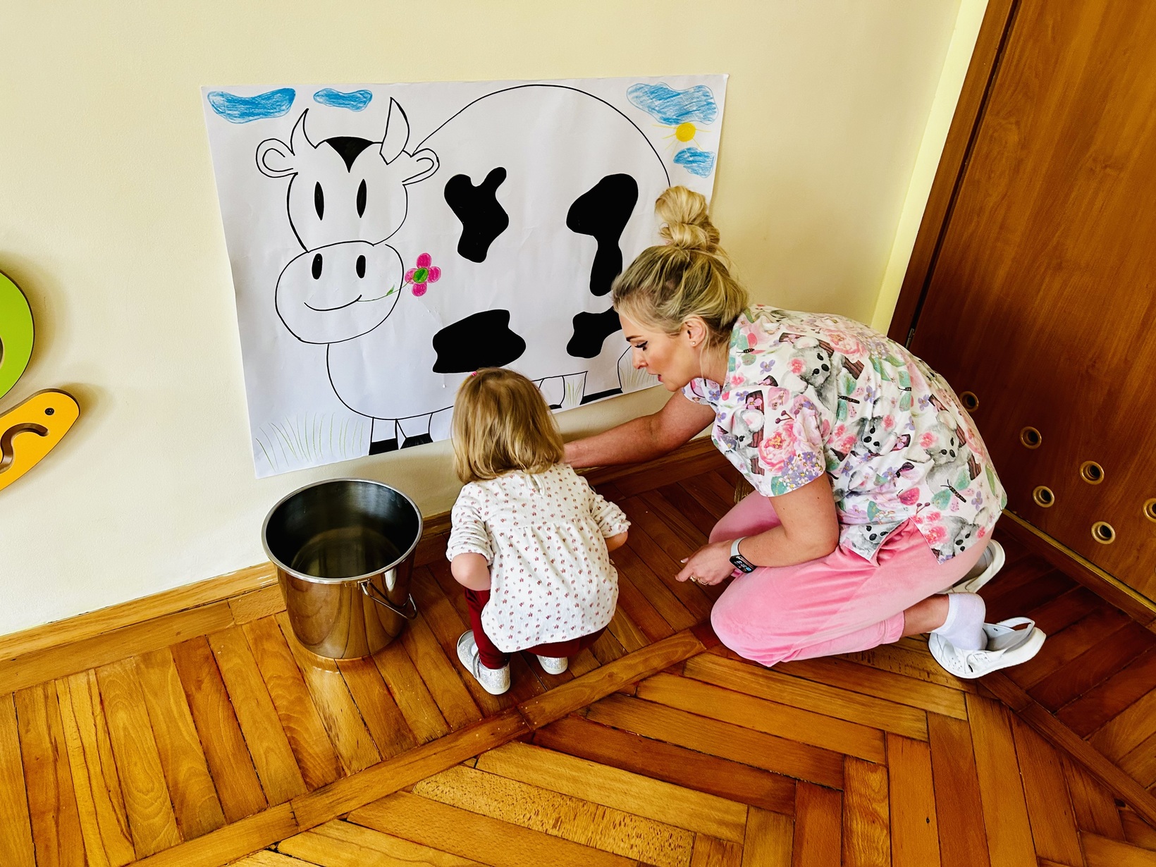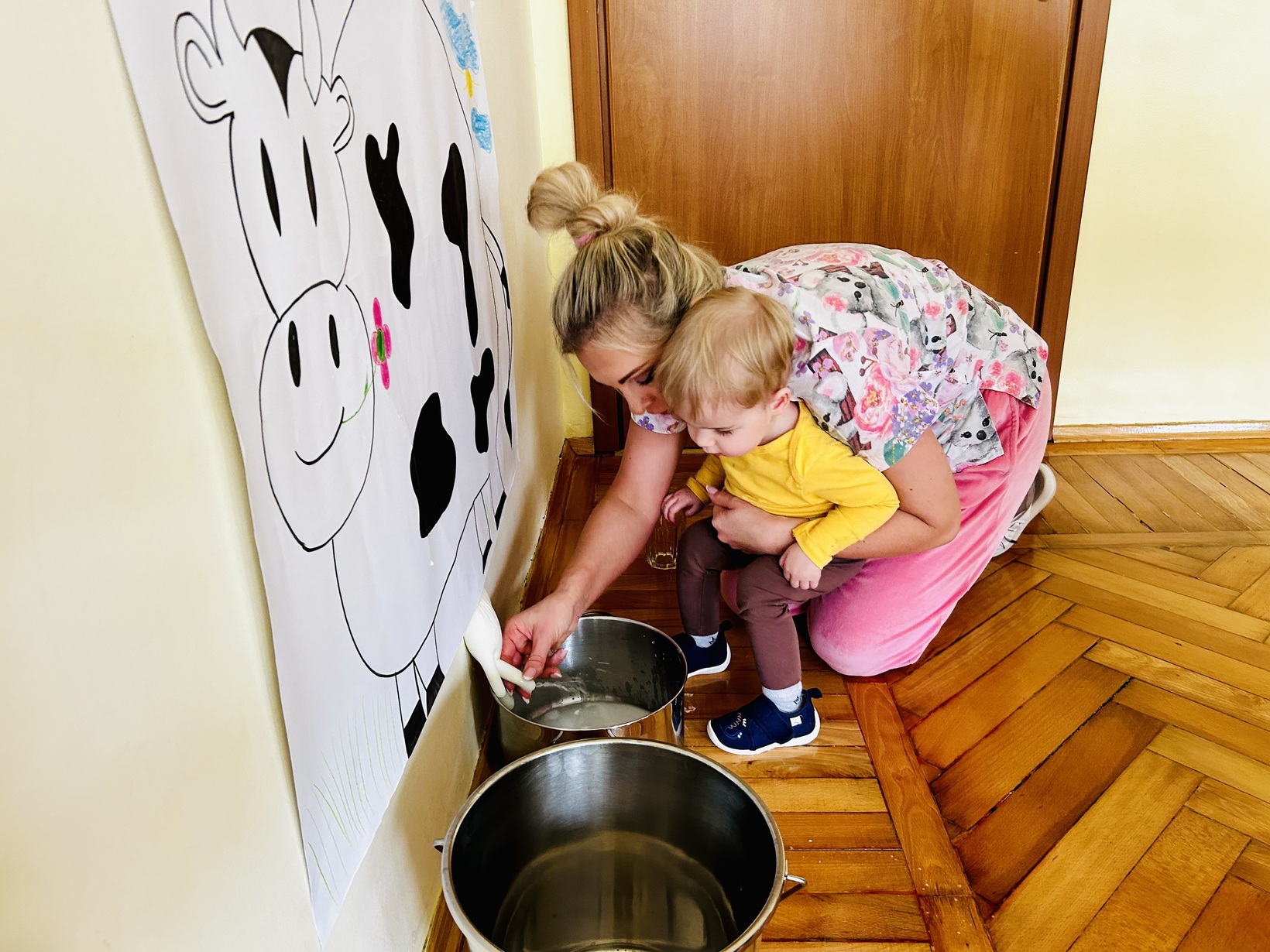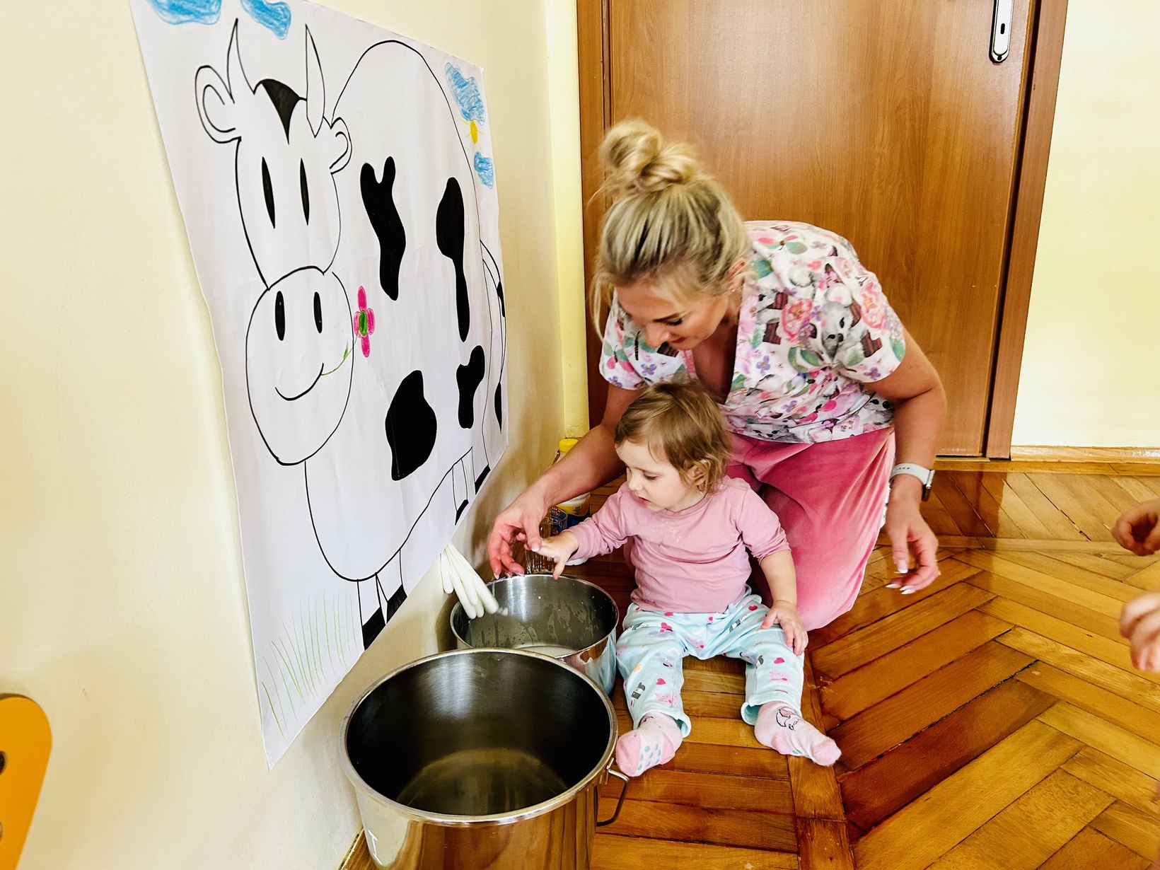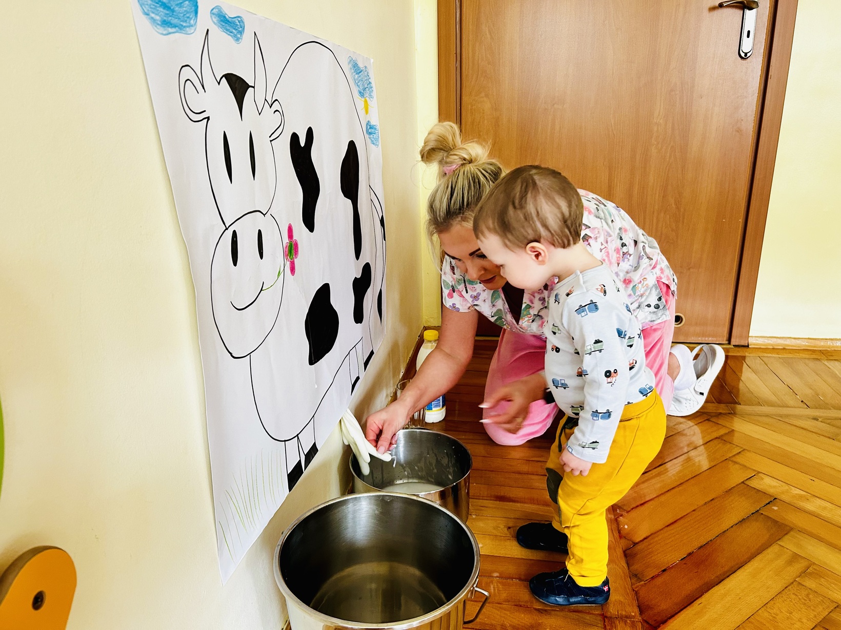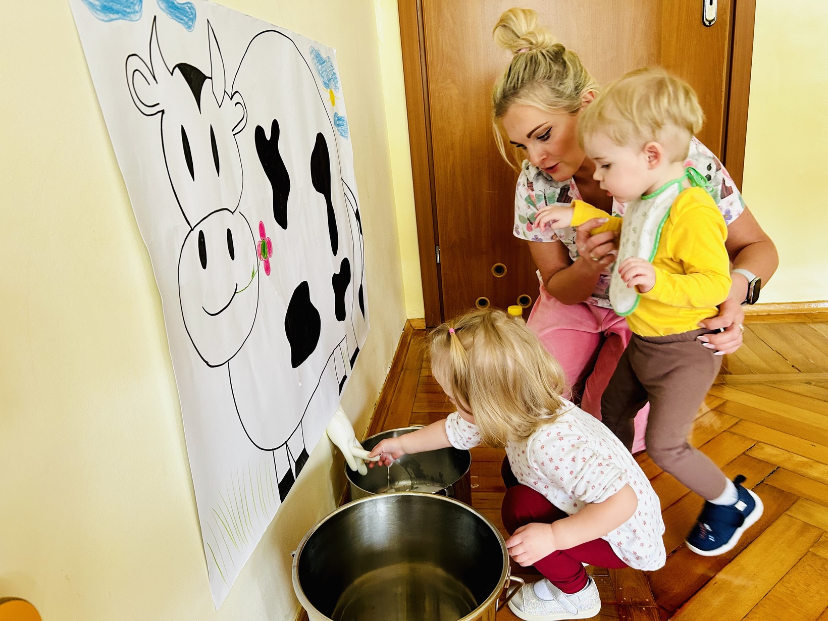 Ogromną frajdę sprawiło dzieciom dojenie krowy Muci (wykonanej z papieru i lateksowej rękawicy)