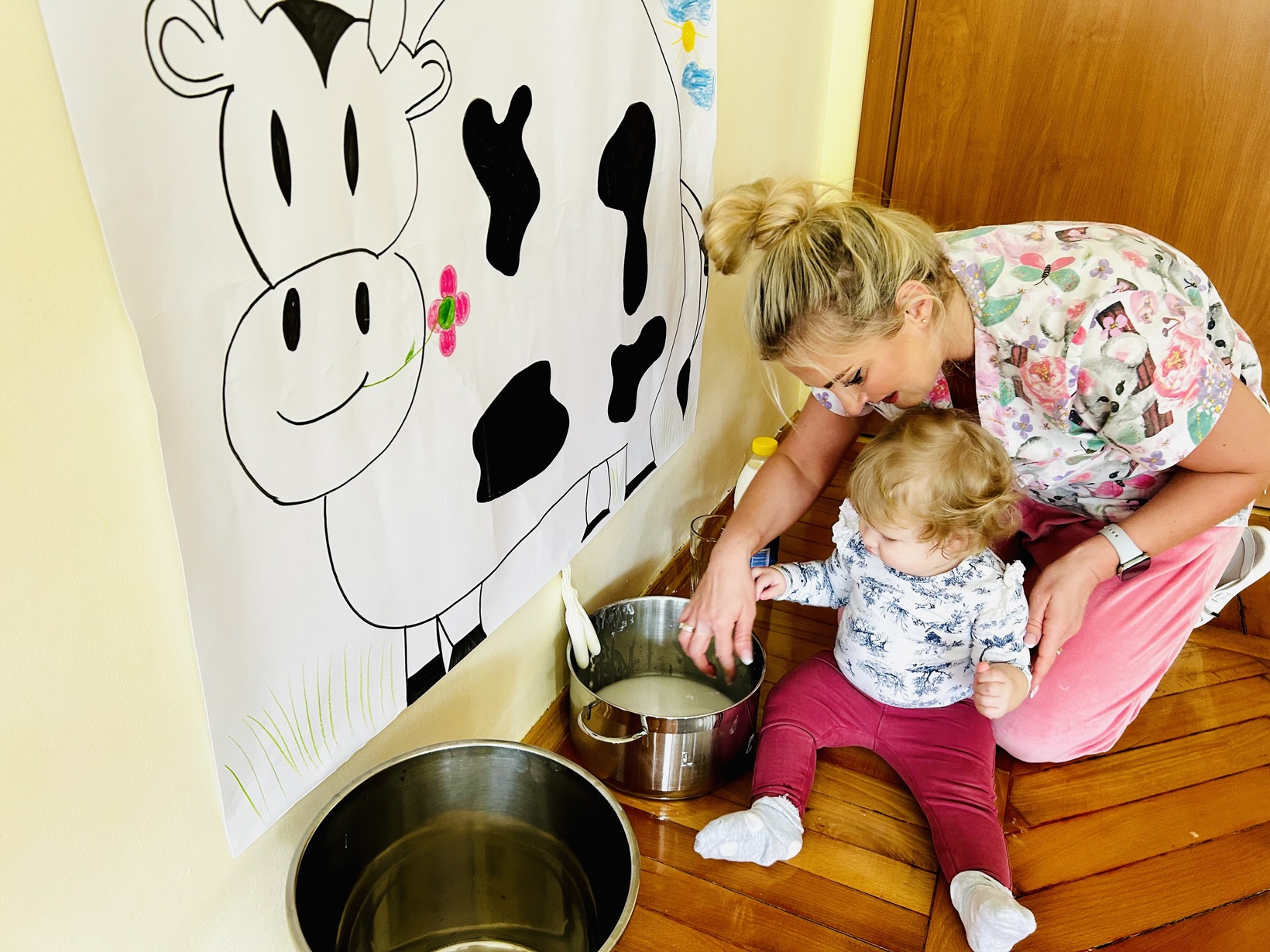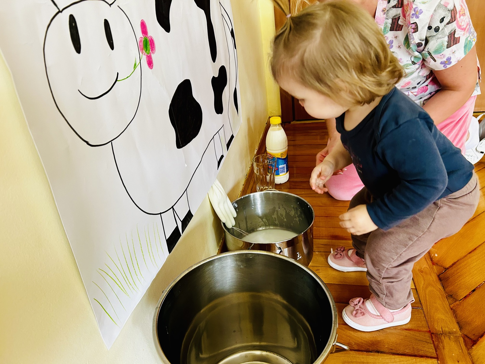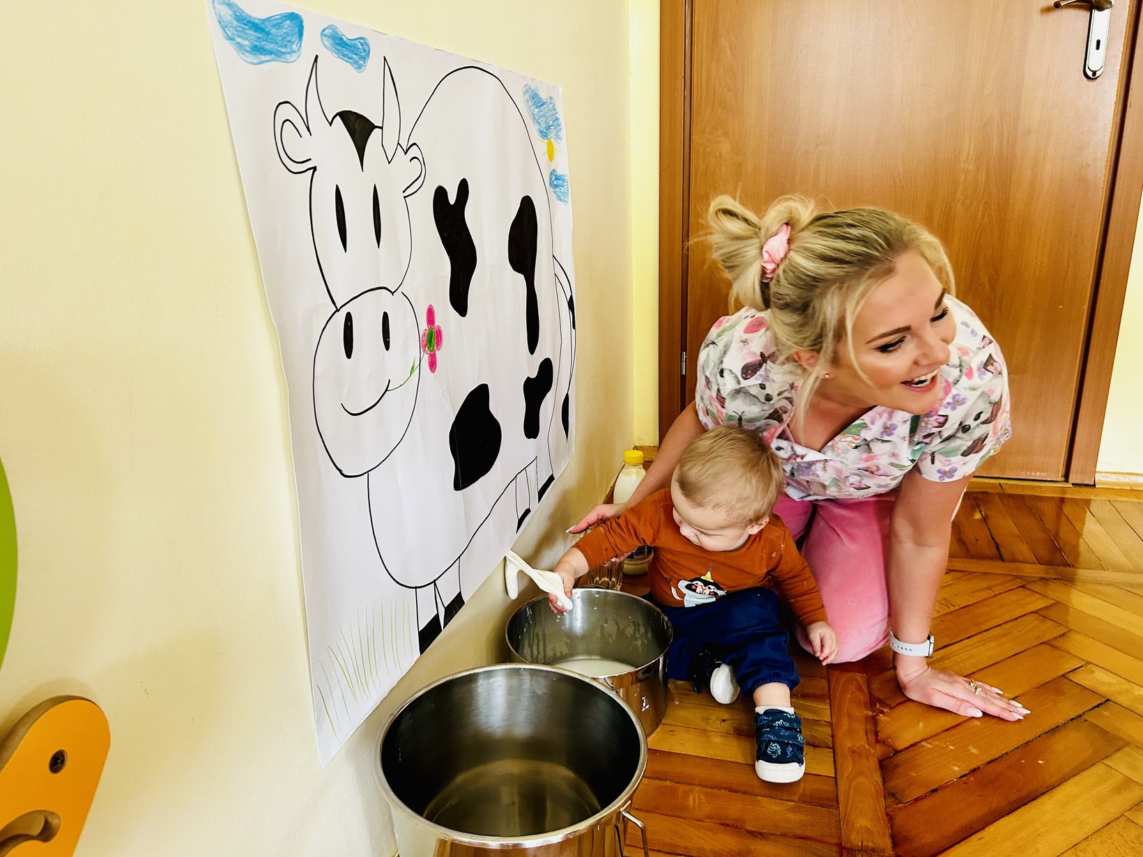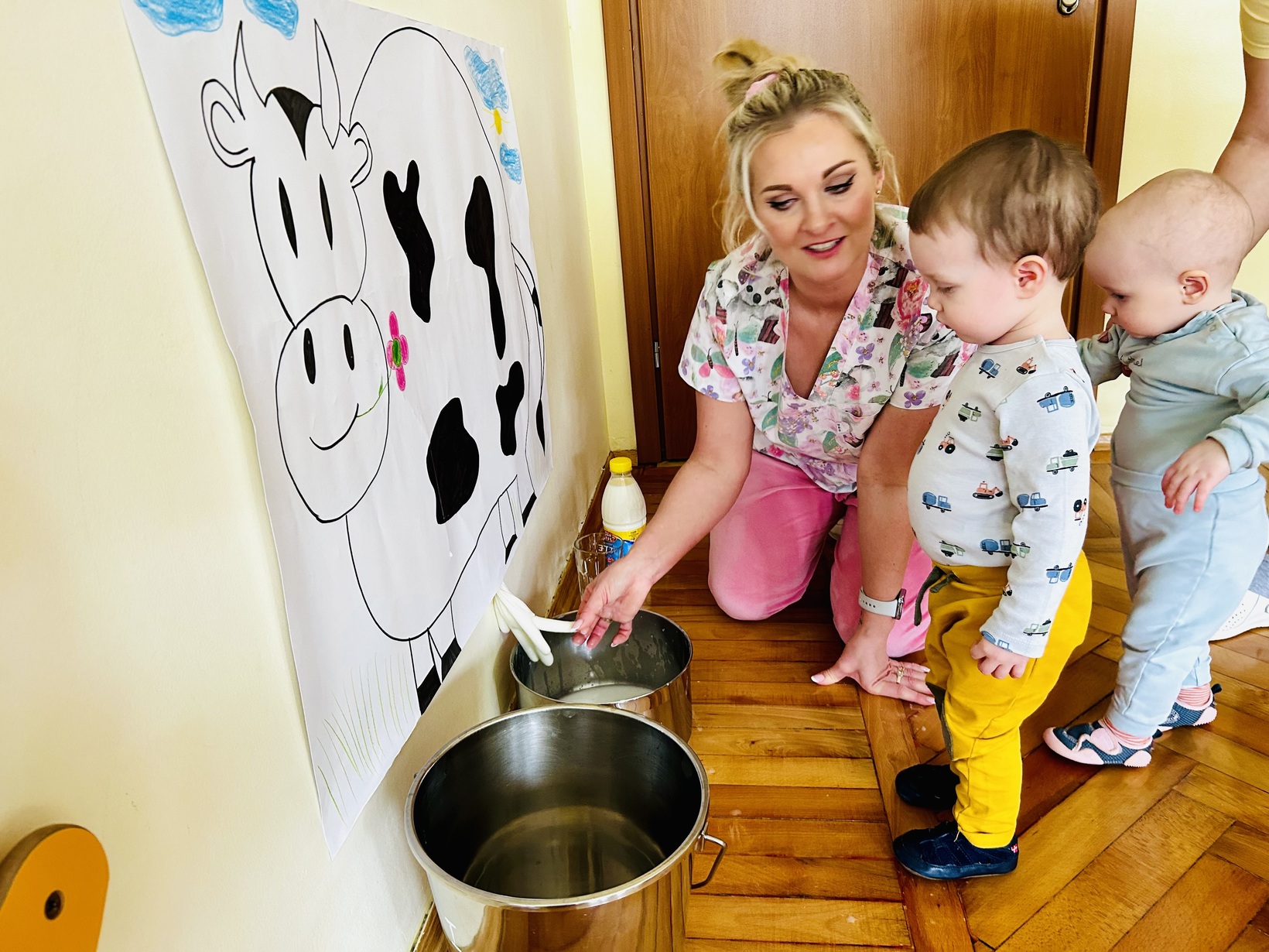 Ogromną frajdę sprawiło dzieciom dojenie krowy Muci (wykonanej z papieru i lateksowej rękawicy)