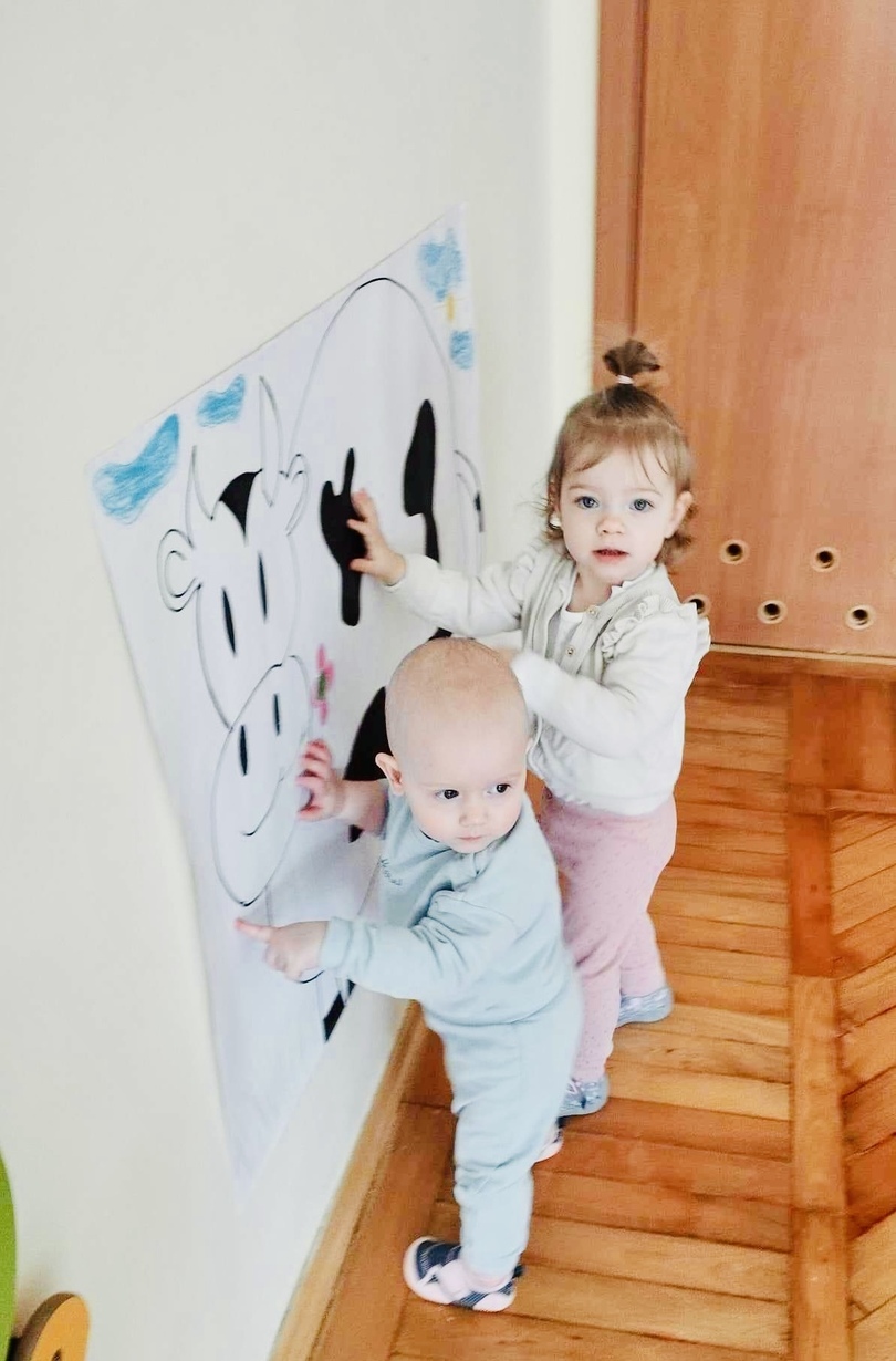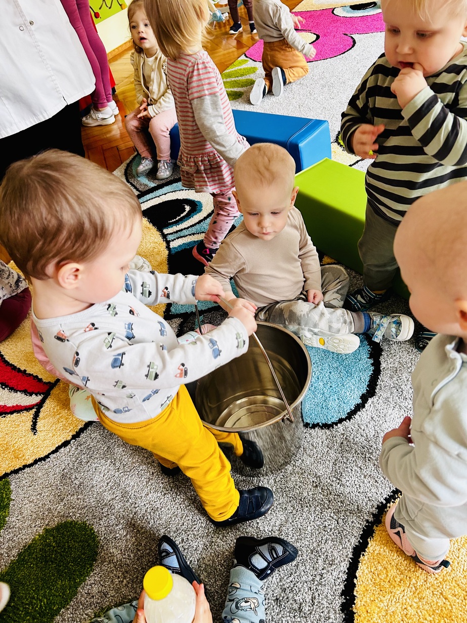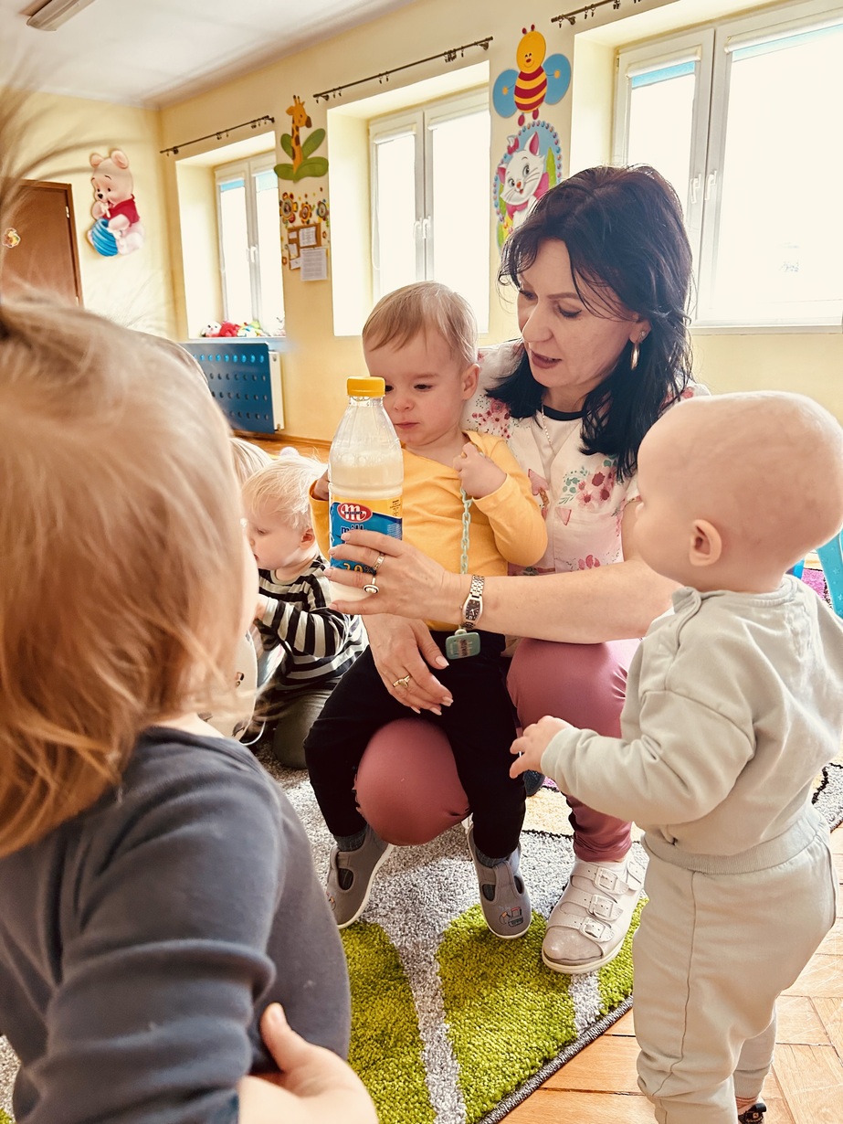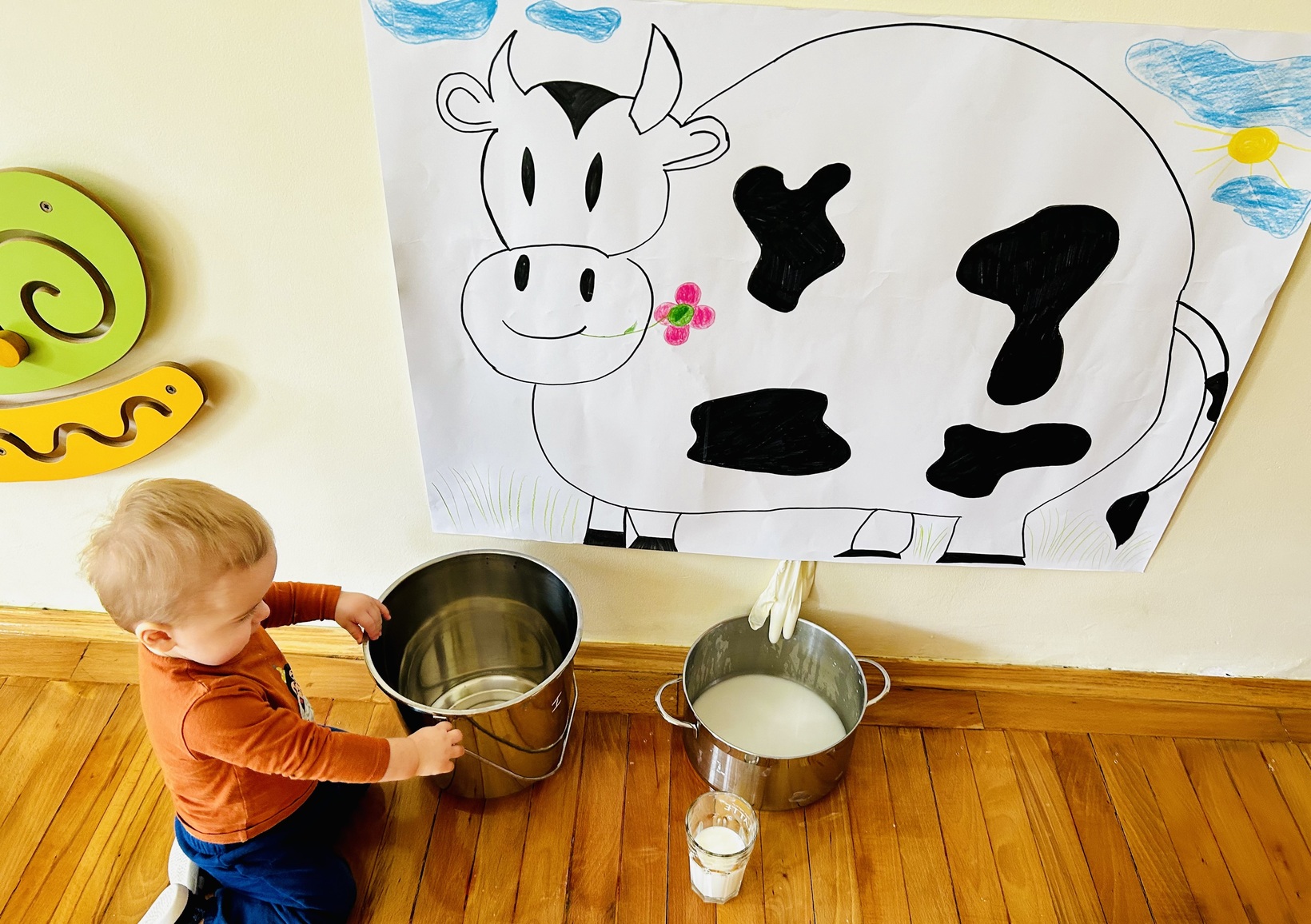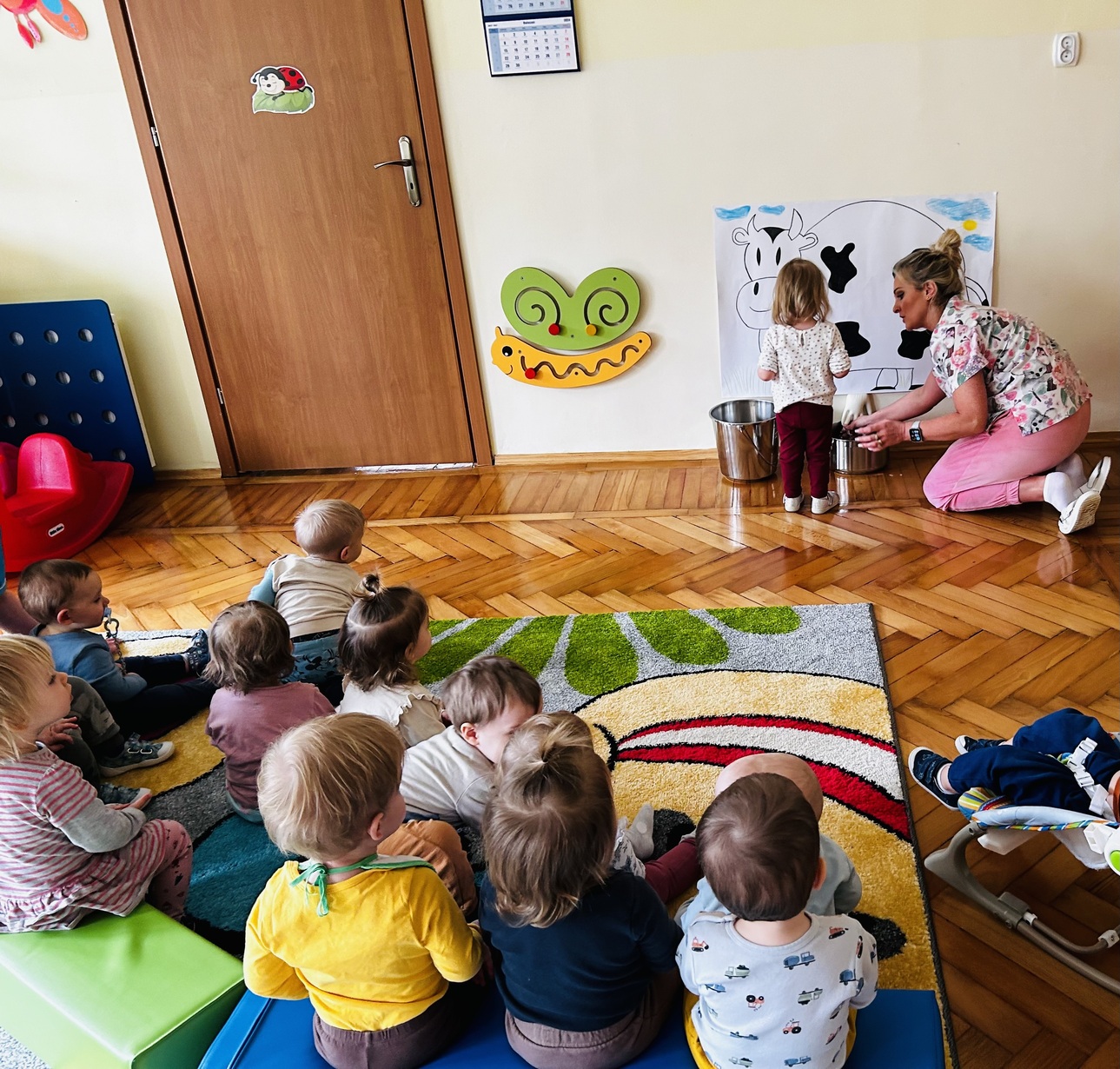 Ogromną frajdę sprawiło dzieciom dojenie krowy Muci (wykonanej z papieru i lateksowej rękawicy)