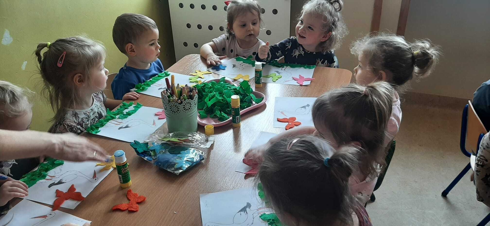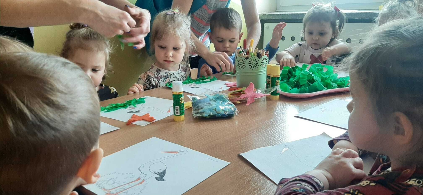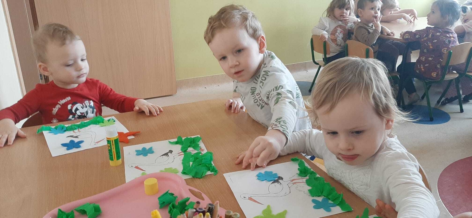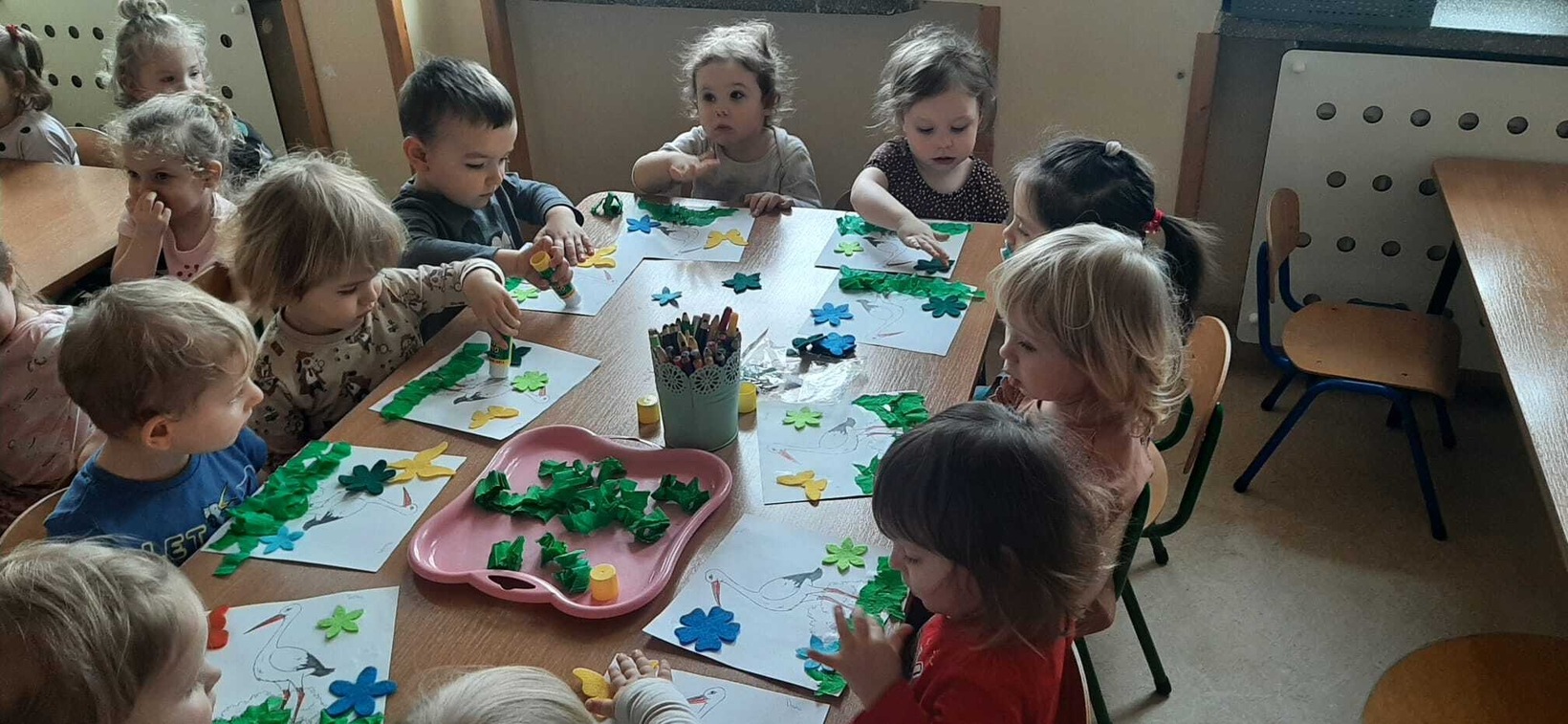 Nadeszła już długo wyczekiwana wiosna ,wszystko budzi się do życia. A jak wszyscy wiemy przylot bocianów jest jednym ze zwiastunów nadchodzącej pory roku.Dlatego nasze muchomorki wykonywały dziś pracę plastyczne ,kolorowały kredkami nogi , dziób i skrzydło bociana oraz naklejaly trawkę,kolorowe motylki i kwiatuszki.