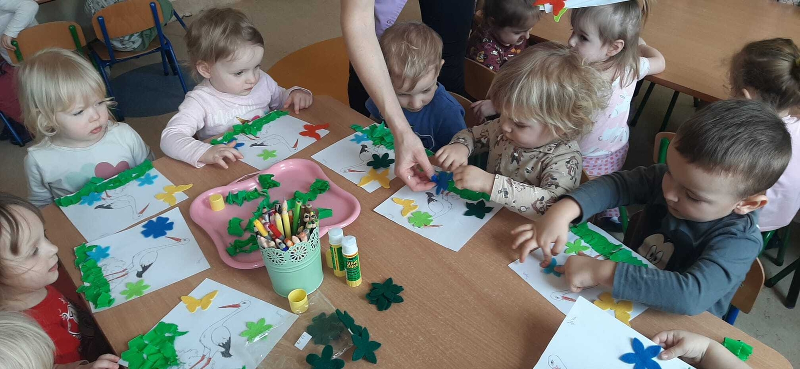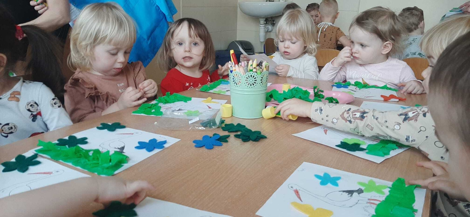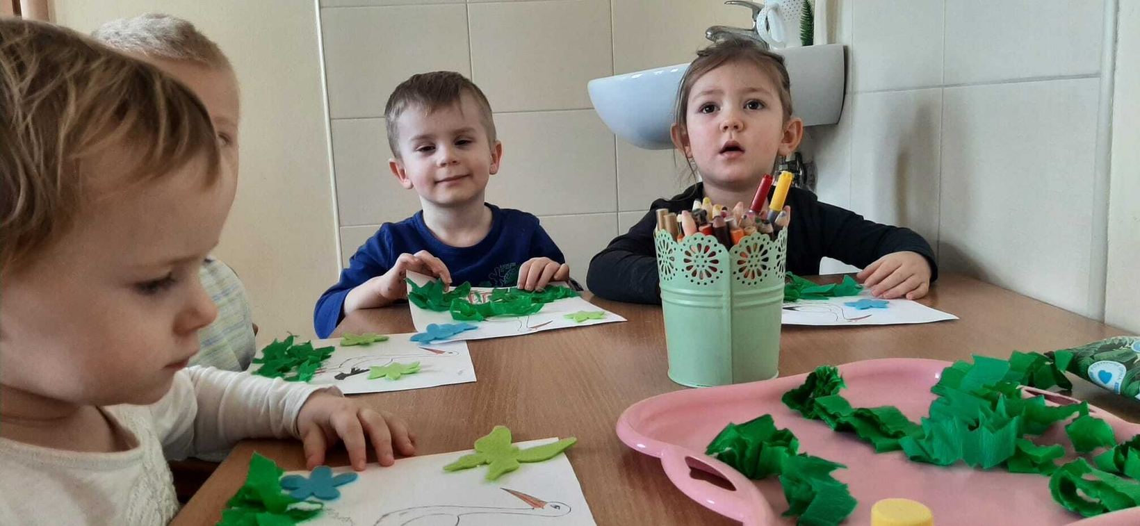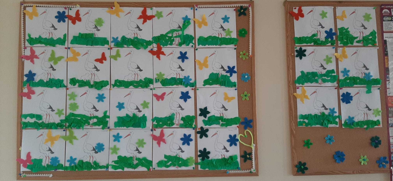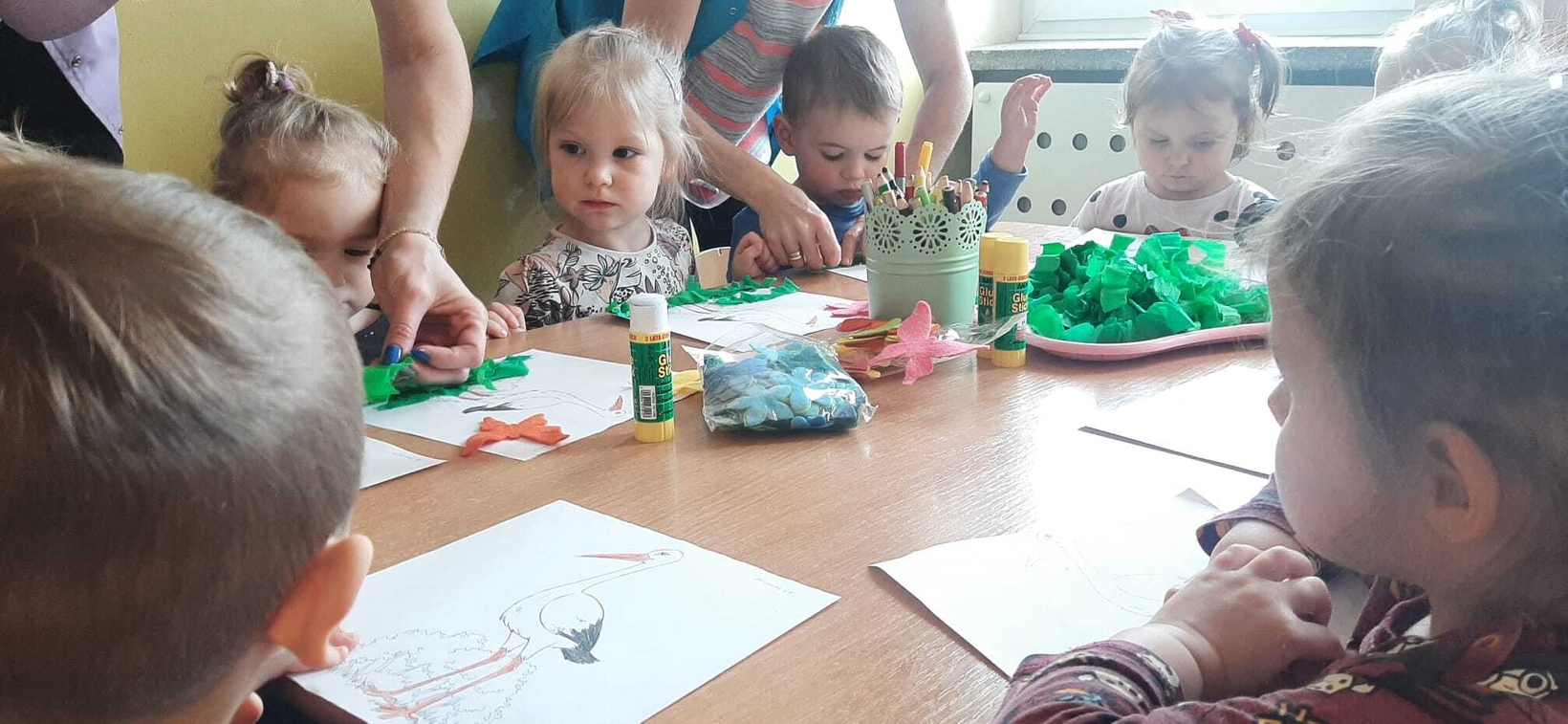 Nadeszła już długo wyczekiwana wiosna ,wszystko budzi się do życia. A jak wszyscy wiemy przylot bocianów jest jednym ze zwiastunów nadchodzącej pory roku.Dlatego nasze muchomorki wykonywały dziś pracę plastyczne ,kolorowały kredkami nogi , dziób i skrzydło bociana oraz naklejaly trawkę,kolorowe motylki i kwiatuszki.