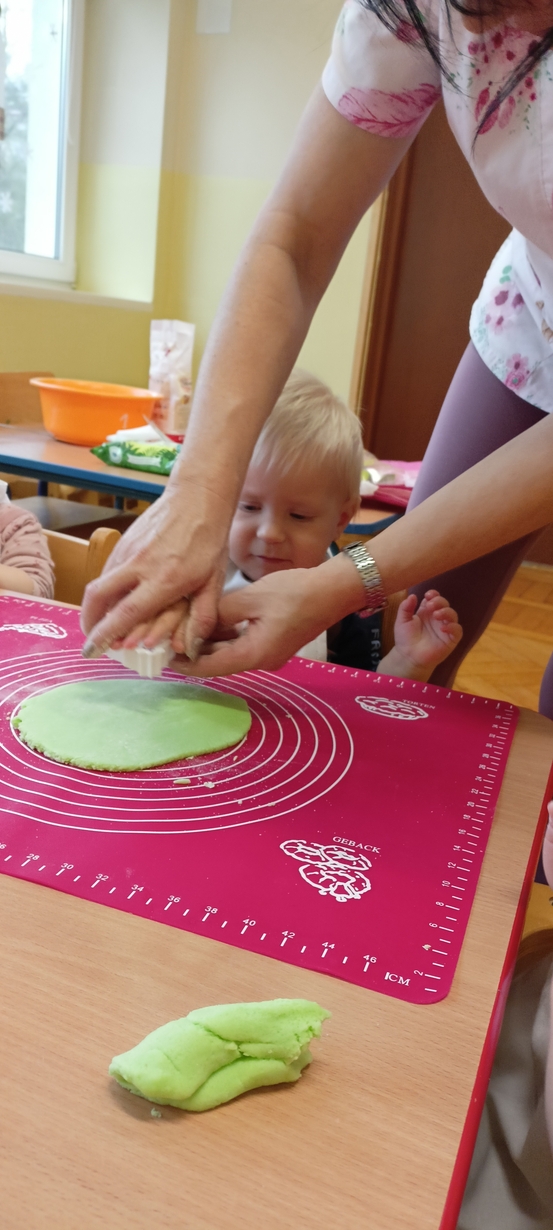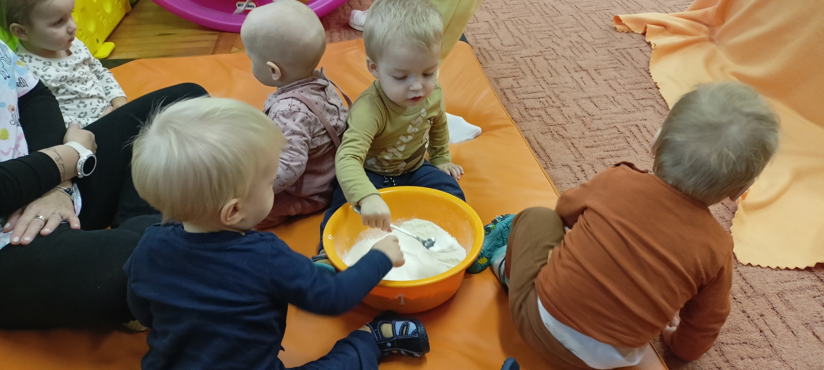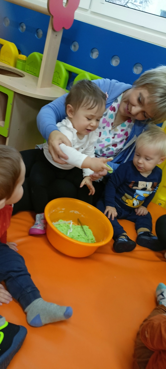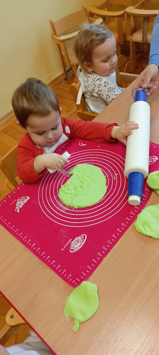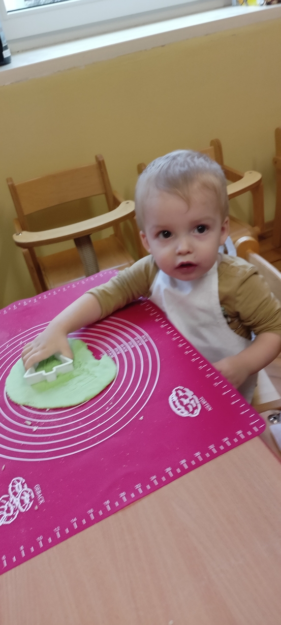 Nasze Biedroneczki tym razem uczestniczyły w tworzeniu masy solnej. Dzieci w raz z ciociami mieszały, ugniatały i lepiły rączkami. Była to doskonała zabawa pobudzająca zmysł dotyku, oraz koordynację wzrokowo-ruchową. Dzisiaj w wersji świątecznej maluszki wykrywały świąteczne choineczki.