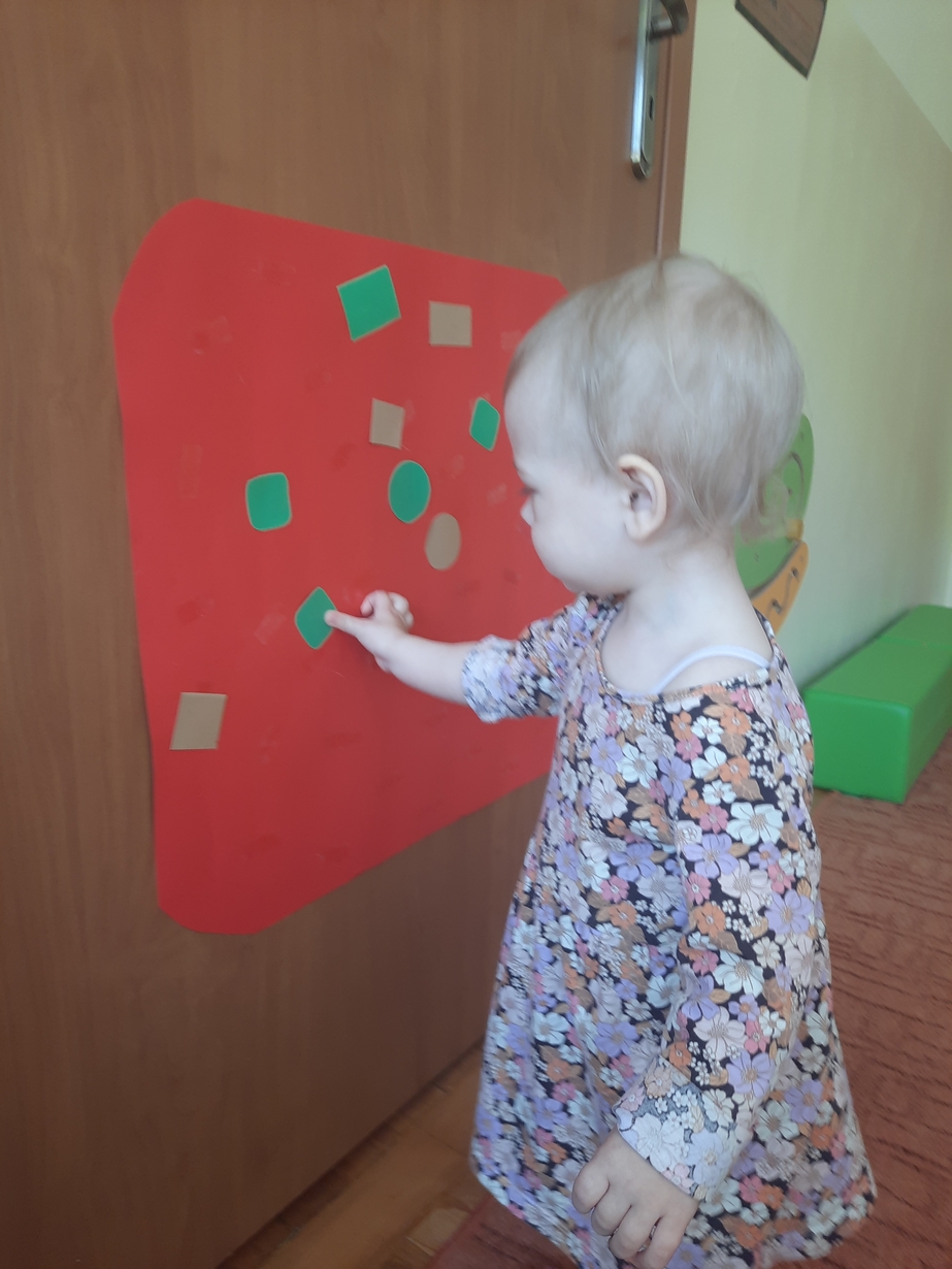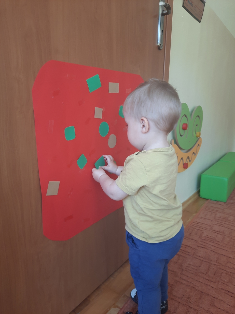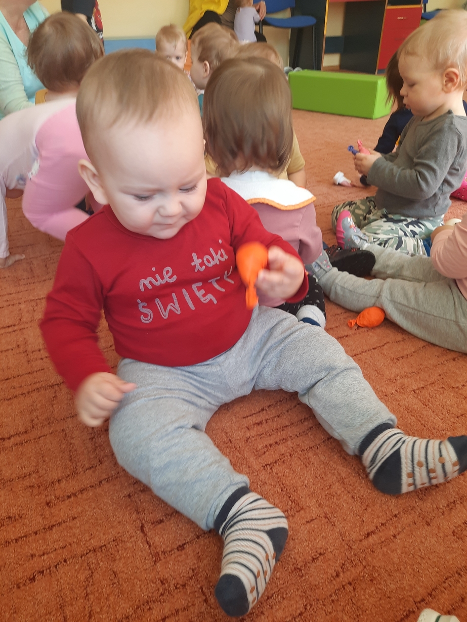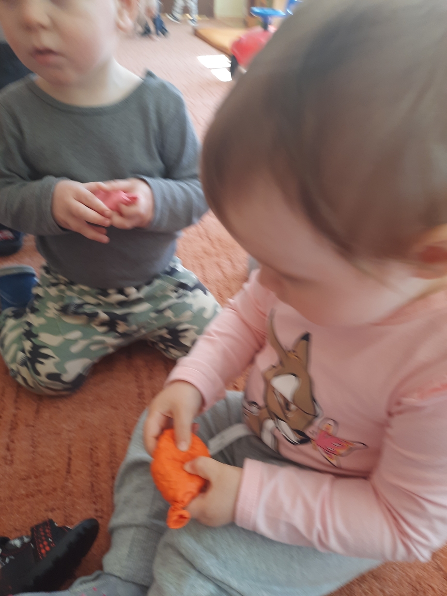 Naśladowały gesty opiekunek do wierszyka ,,Tu sroczka", liczyliśmy wspólnie paluszki, a na koniec dzieci przyklejały na tablicę różne kształty wycięte z papieru, a baloniki wypełnione kuleczkami, mąką, kaszą oraz grochem w rączkach dzieci były dobrym ćwiczeniem zmysłu dotyku. Biedroneczki spisały się na medal?
