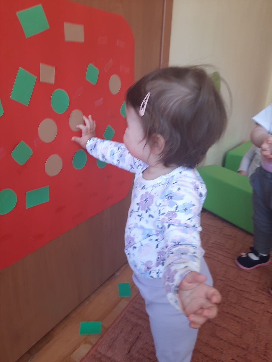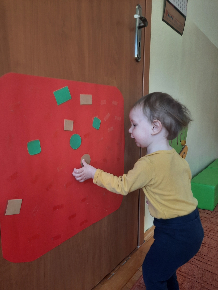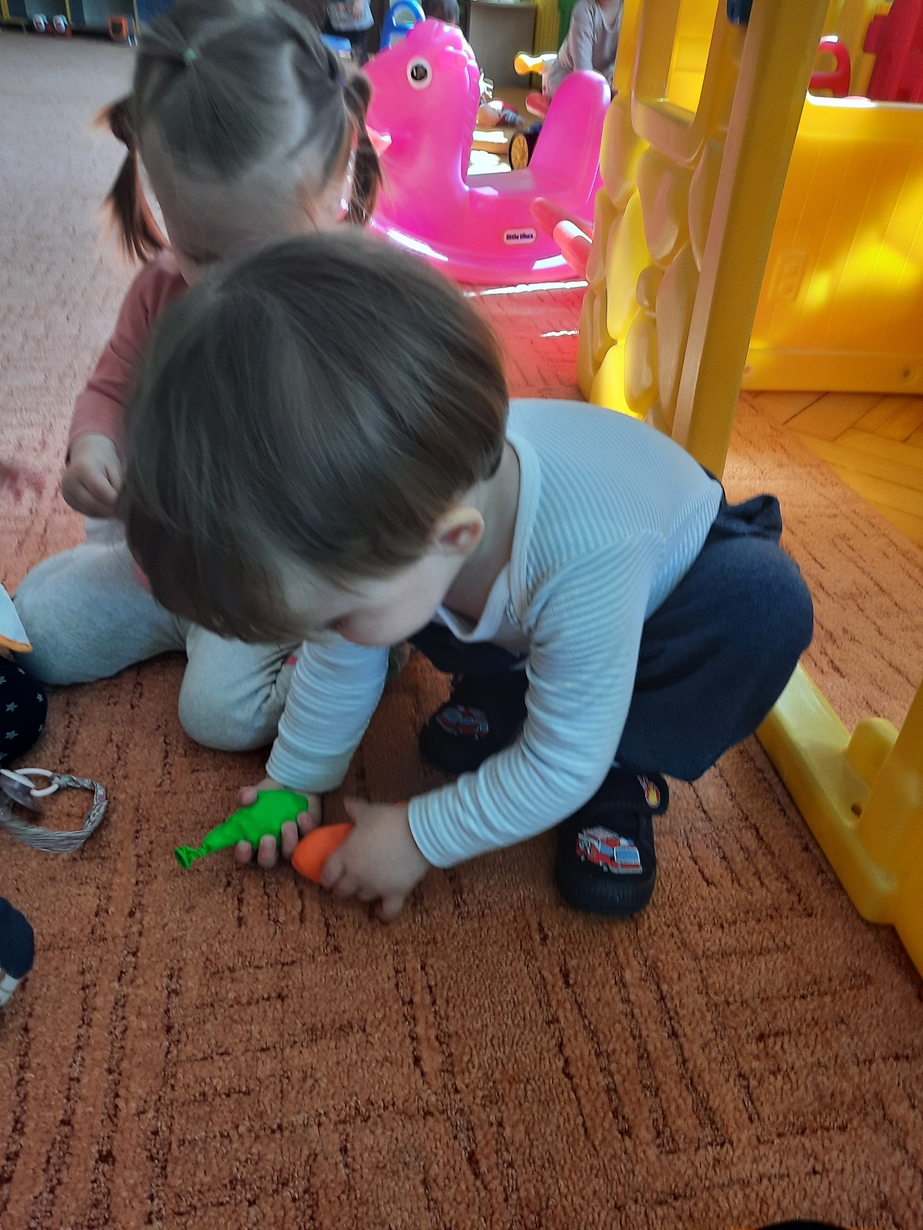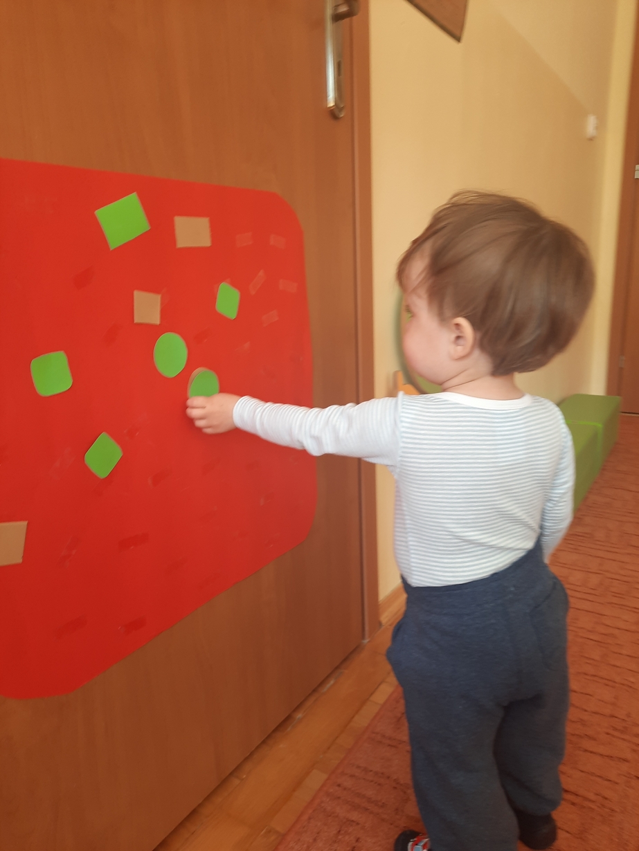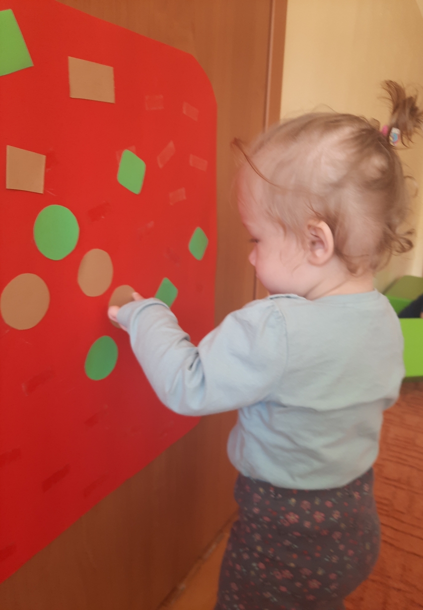 Naśladowały gesty opiekunek do wierszyka ,,Tu sroczka", liczyliśmy wspólnie paluszki, a na koniec dzieci przyklejały na tablicę różne kształty wycięte z papieru, a baloniki wypełnione kuleczkami, mąką, kaszą oraz grochem w rączkach dzieci były dobrym ćwiczeniem zmysłu dotyku. Biedroneczki spisały się na medal?