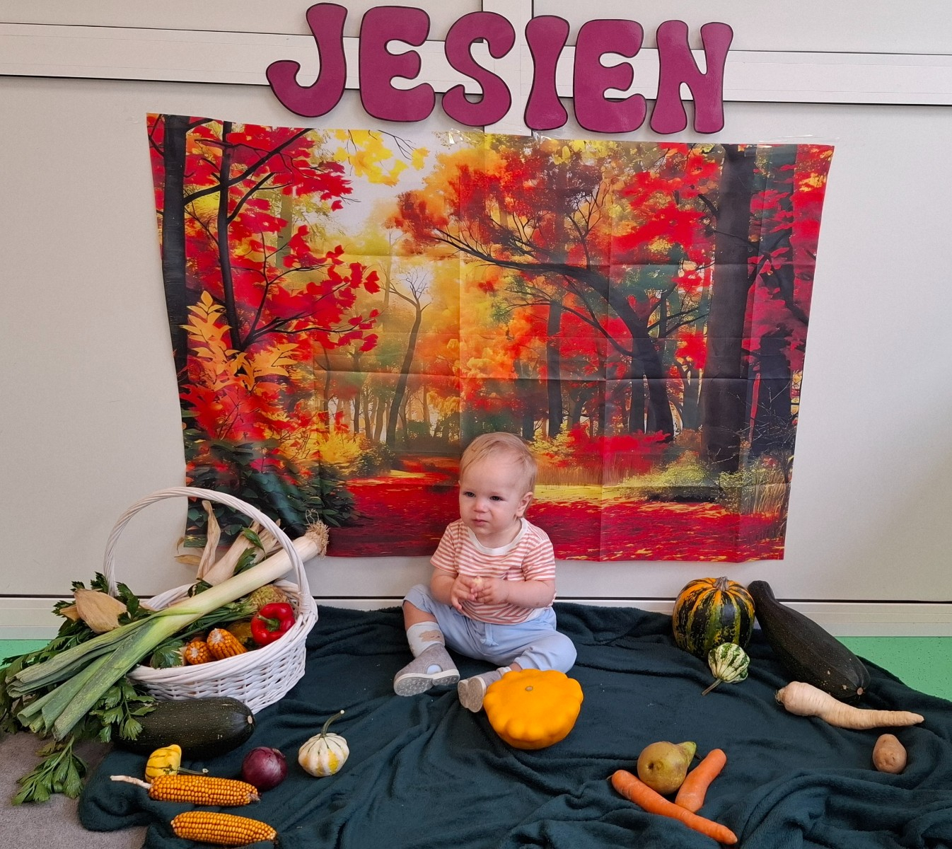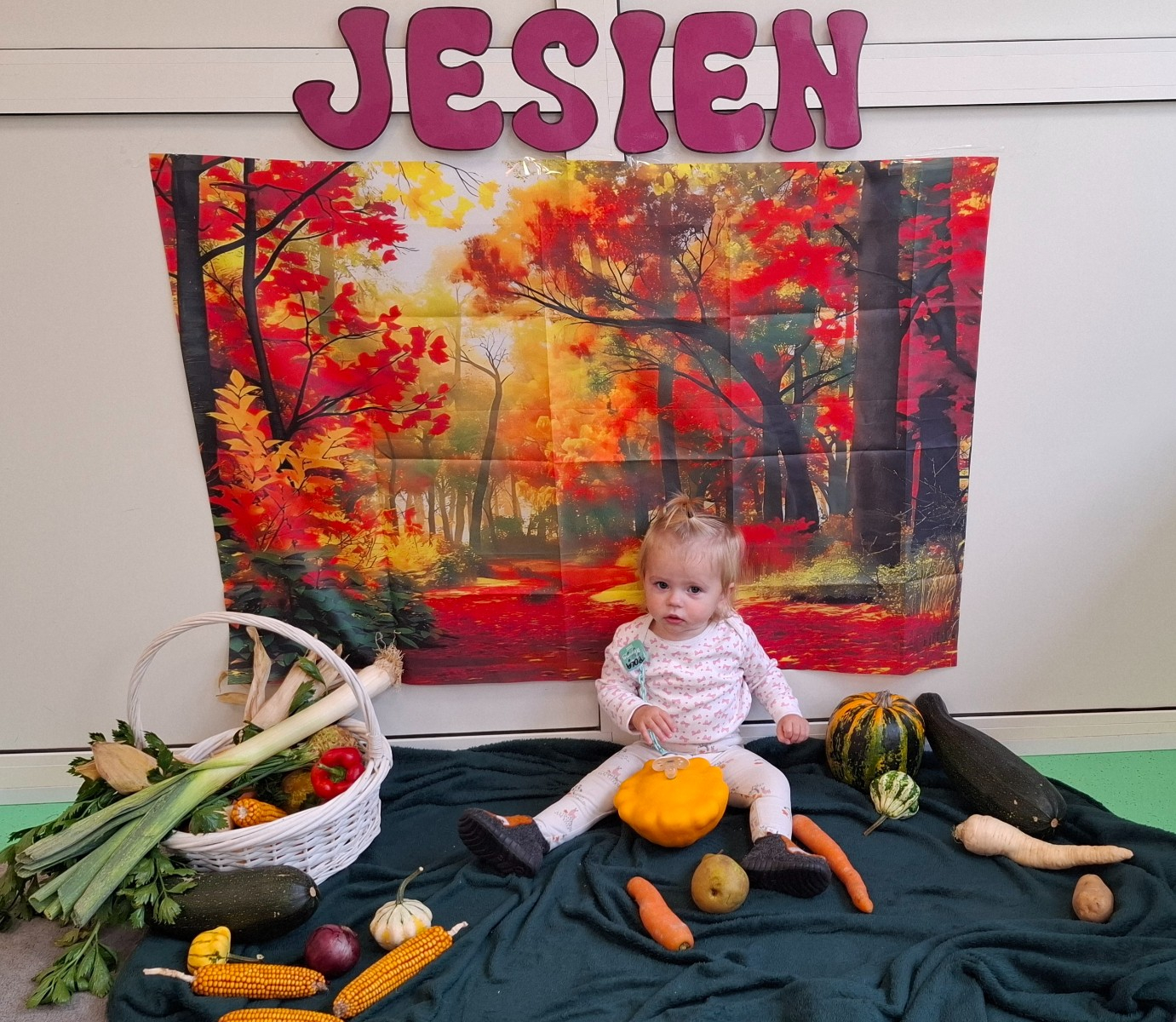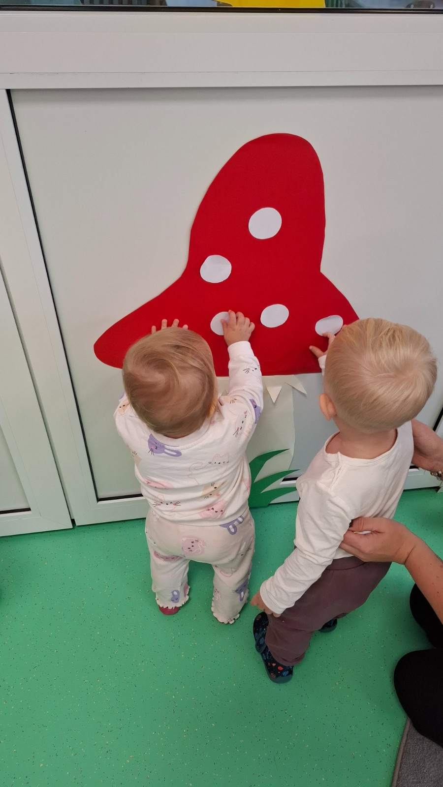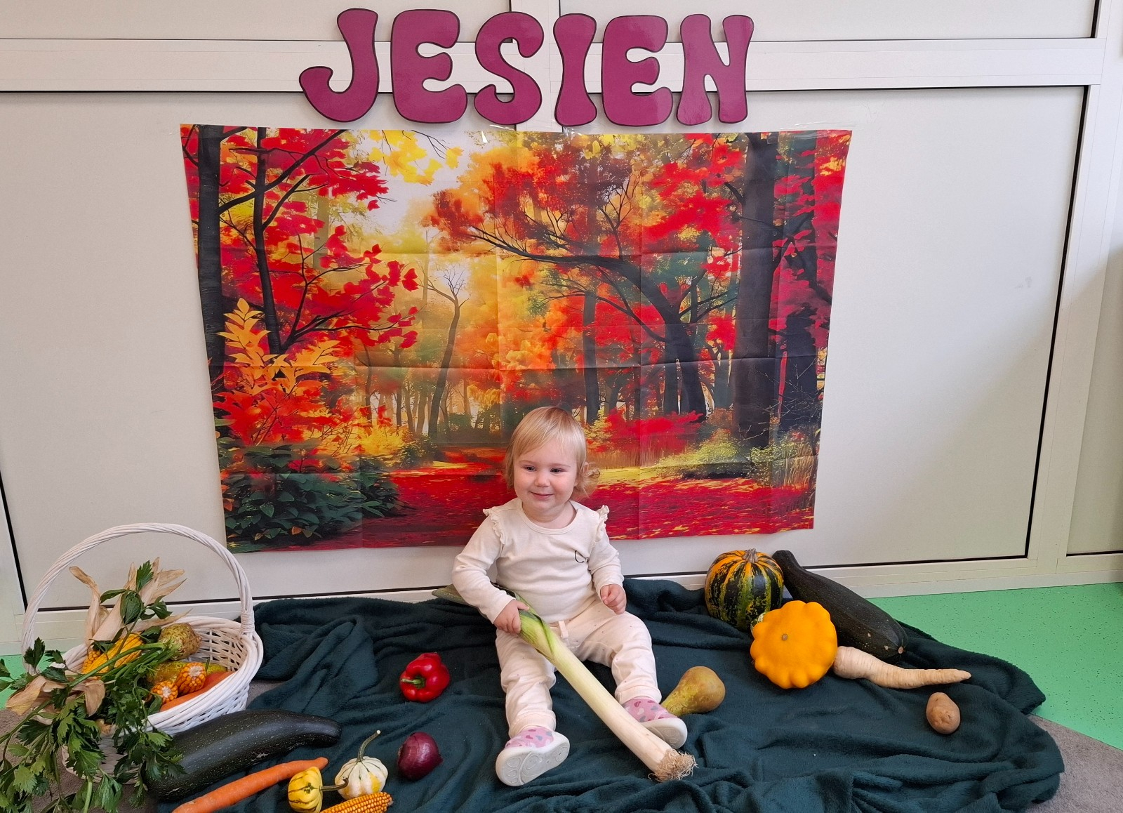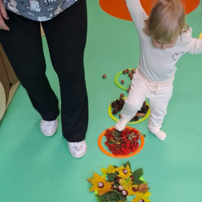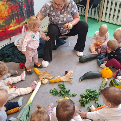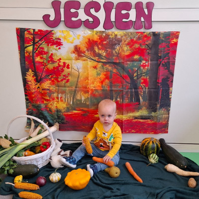 Do naszych małych smyków z grupy misie zawitała Pani Jesień . Podczas zajęć dzieci dowiedziały się co to za pora roku, jakie niesie zmiany w przyrodzie oraz miały możliwość zobaczenia, dotknięcia różnych darów jesieni tj.jarzębina , orzechy, szyszki, warzywa i owoce.  W dalszej części zajęć z radością pokonywały ścieżkę sensoryczną utworzoną z darów  oraz wykonały wspólną pracę plastyczną podczas której naklejały białe kółeczka na kapelusz muchomora. Na zakończenie zajęć nasze maluszki bawiły się przy piosenkach o tematyce jesiennej oraz miały wykonane pamiątkowe zdjęcia na tle jesieni.