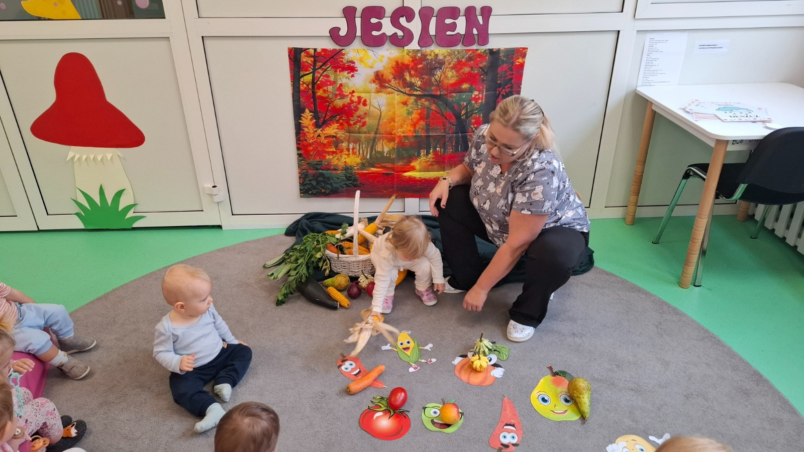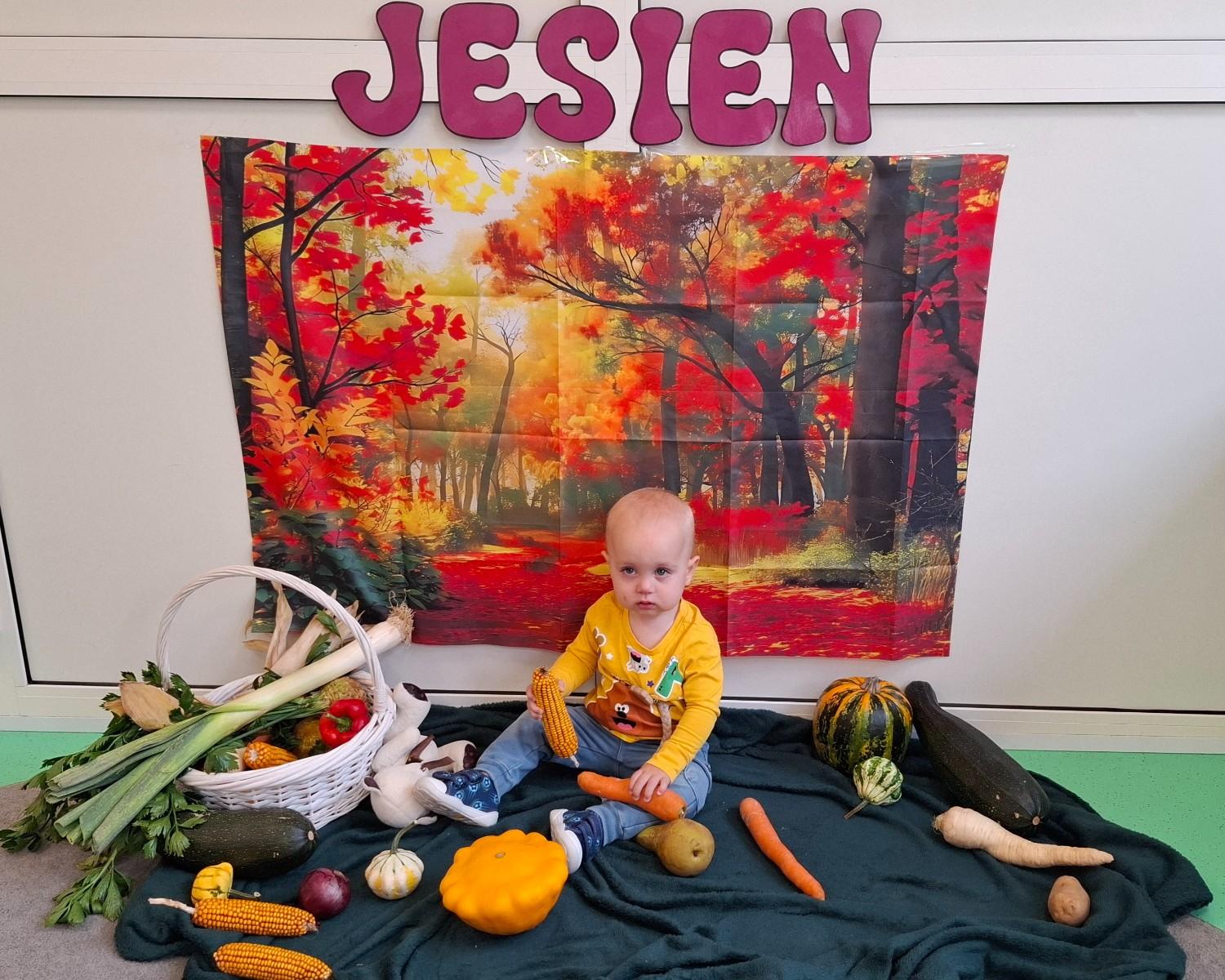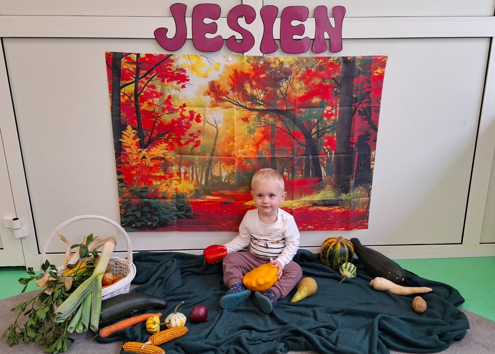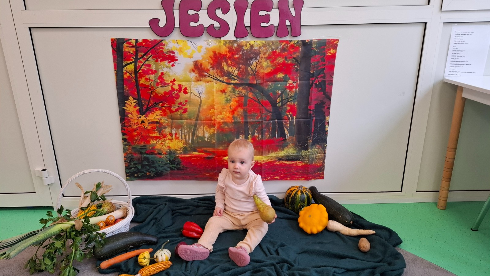Do naszych małych smyków z grupy misie zawitała Pani Jesień . Podczas zajęć dzieci dowiedziały się co to za pora roku, jakie niesie zmiany w przyrodzie oraz miały możliwość zobaczenia, dotknięcia różnych darów jesieni tj.jarzębina , orzechy, szyszki, warzywa i owoce.  W dalszej części zajęć z radością pokonywały ścieżkę sensoryczną utworzoną z darów  oraz wykonały wspólną pracę plastyczną podczas której naklejały białe kółeczka na kapelusz muchomora. Na zakończenie zajęć nasze maluszki bawiły się przy piosenkach o tematyce jesiennej oraz miały wykonane pamiątkowe zdjęcia na tle jesieni.