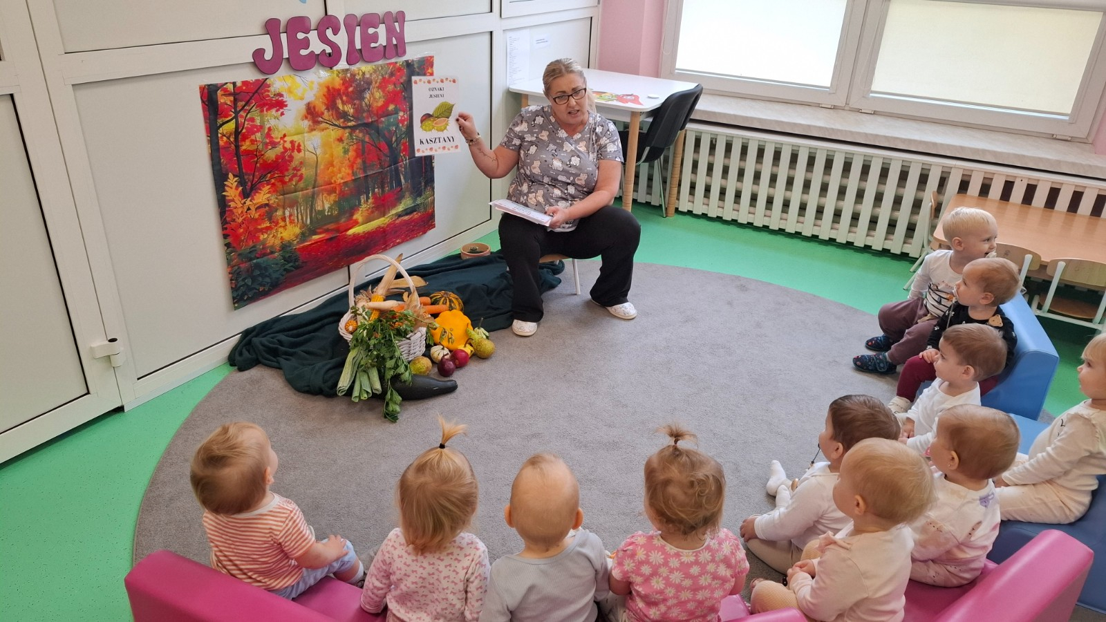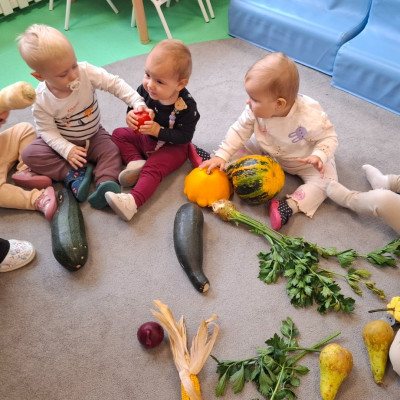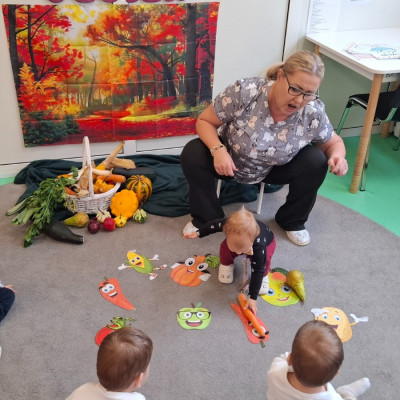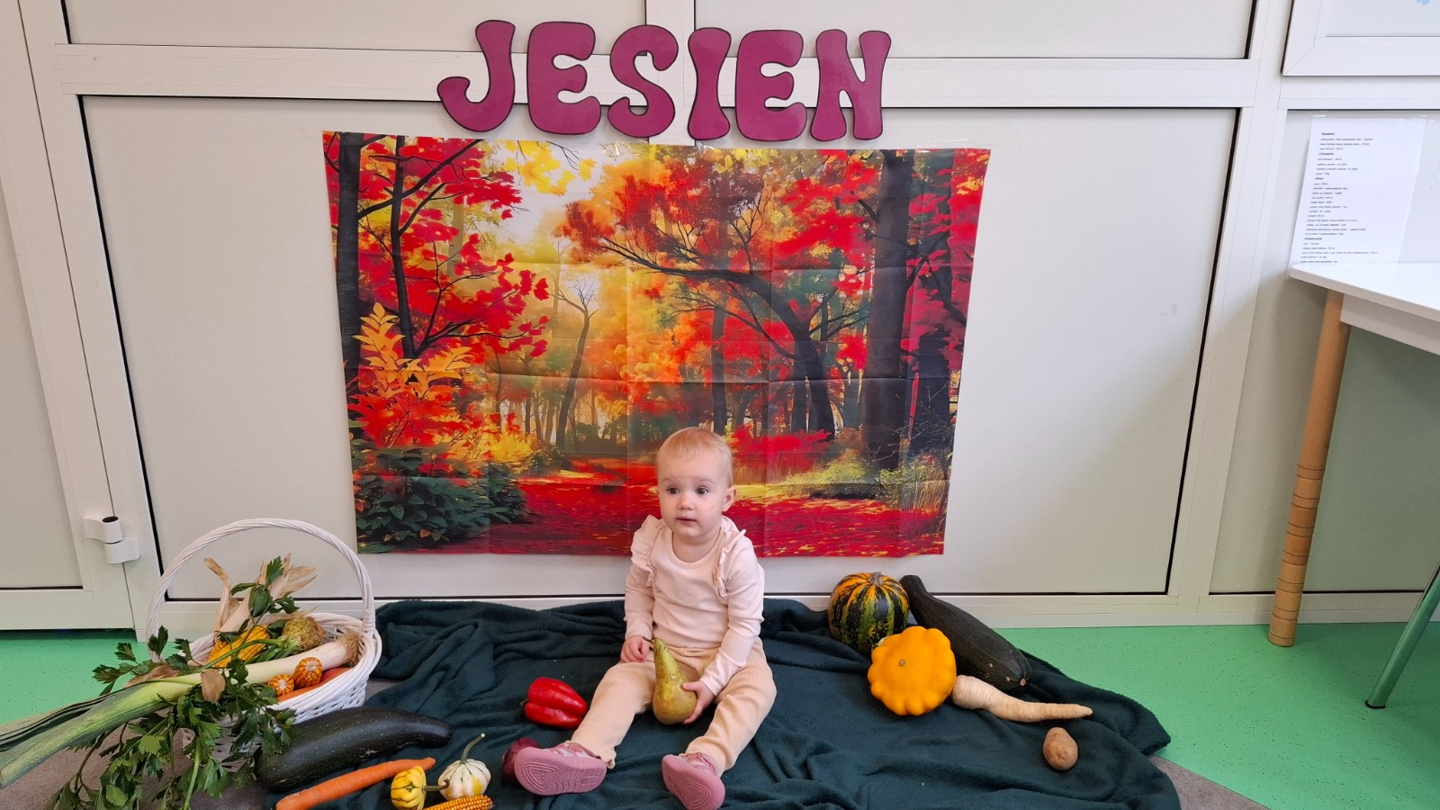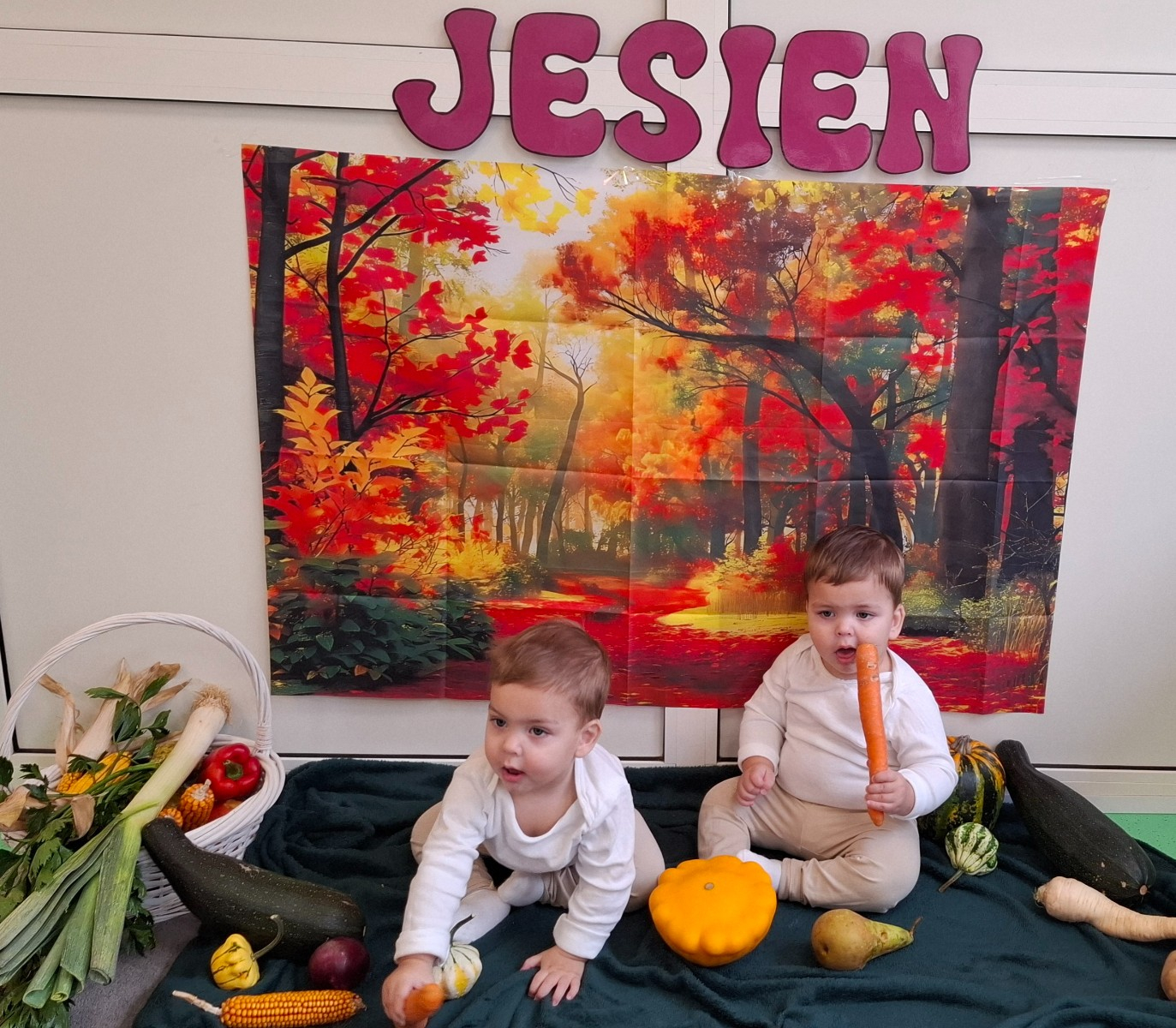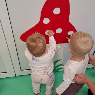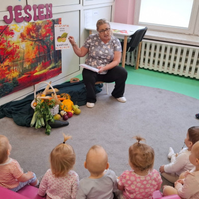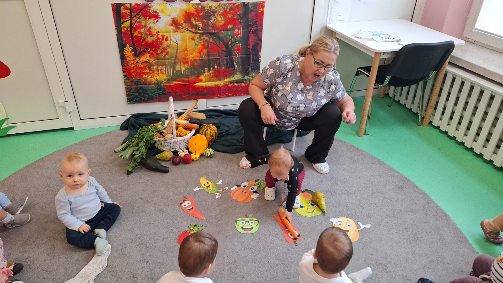 Do naszych małych smyków z grupy misie zawitała Pani Jesień . Podczas zajęć dzieci dowiedziały się co to za pora roku, jakie niesie zmiany w przyrodzie oraz miały możliwość zobaczenia, dotknięcia różnych darów jesieni tj.jarzębina , orzechy, szyszki, warzywa i owoce.  W dalszej części zajęć z radością pokonywały ścieżkę sensoryczną utworzoną z darów  oraz wykonały wspólną pracę plastyczną podczas której naklejały białe kółeczka na kapelusz muchomora. Na zakończenie zajęć nasze maluszki bawiły się przy piosenkach o tematyce jesiennej oraz miały wykonane pamiątkowe zdjęcia na tle jesieni.