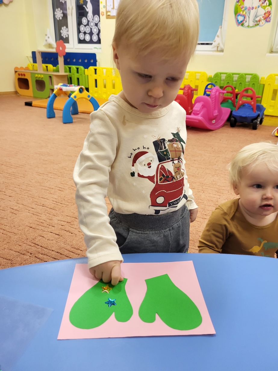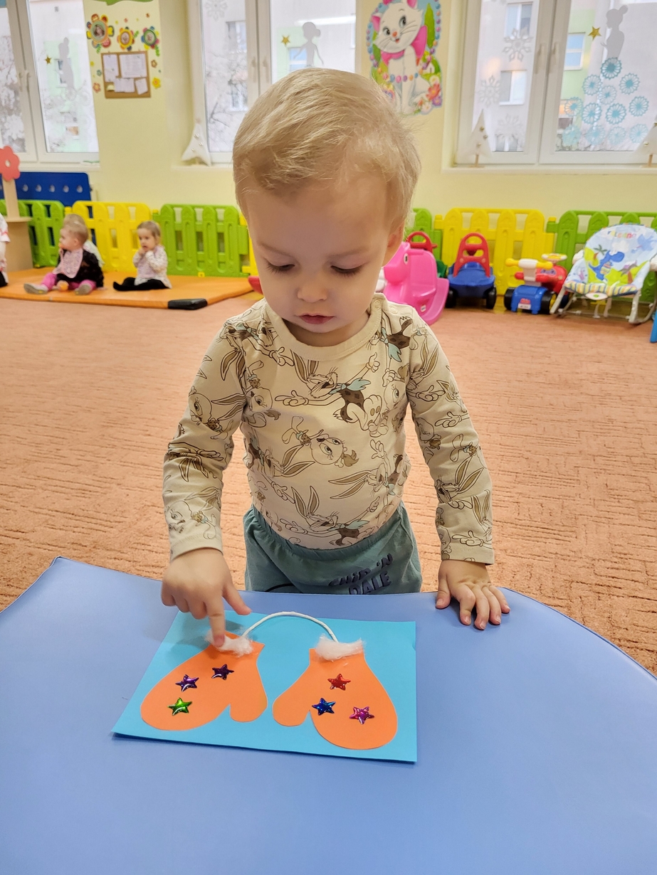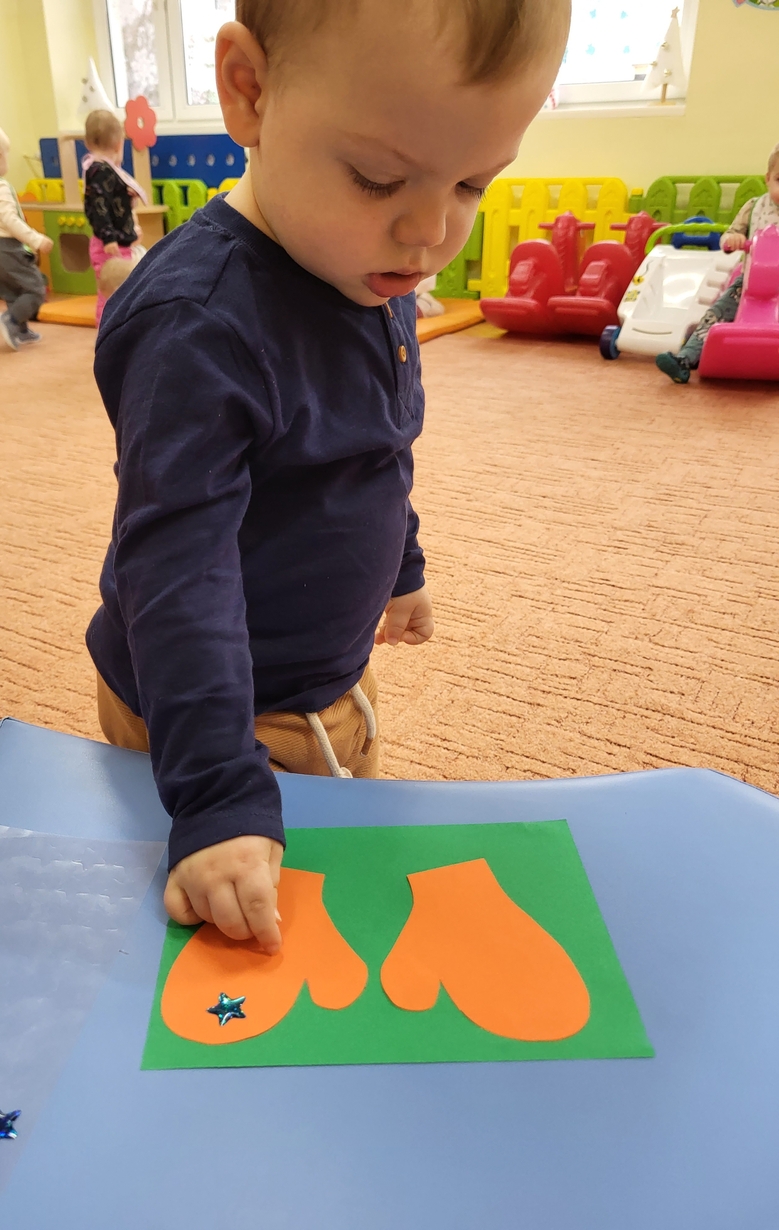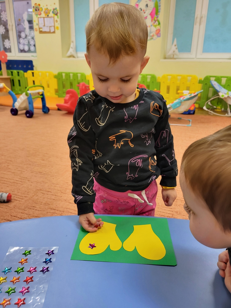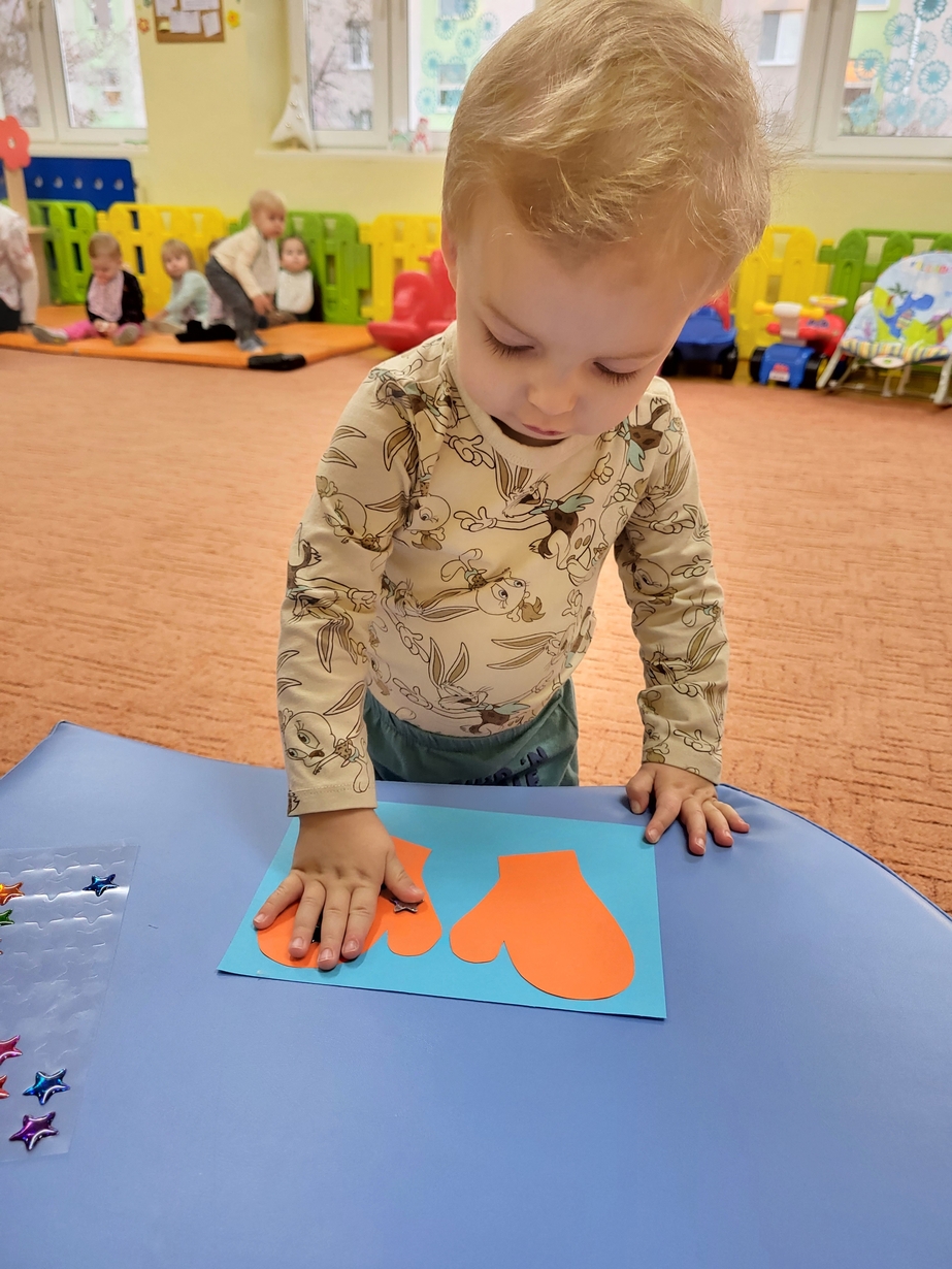 Potrzebne nam rękawiczki. Wiele radości sprawiło maluszkom przyklejanie gwiazdek jako ozdoby rękawiczek. Powstały super projekty a dzieciaczki poćwiczyły paluszki.
