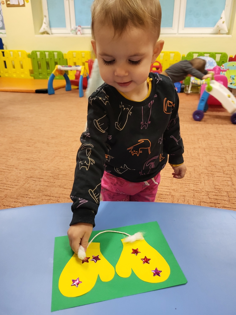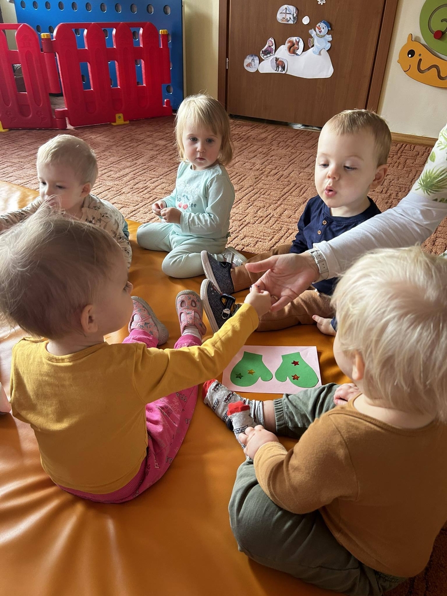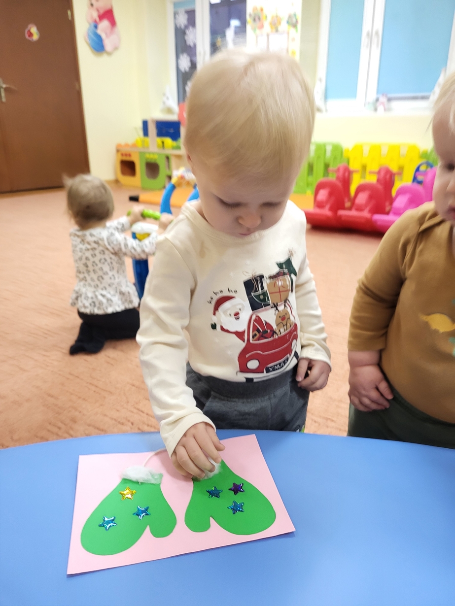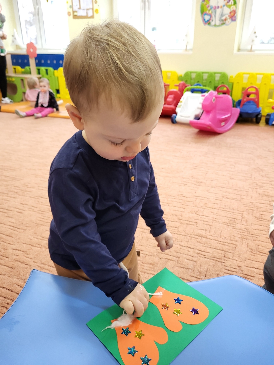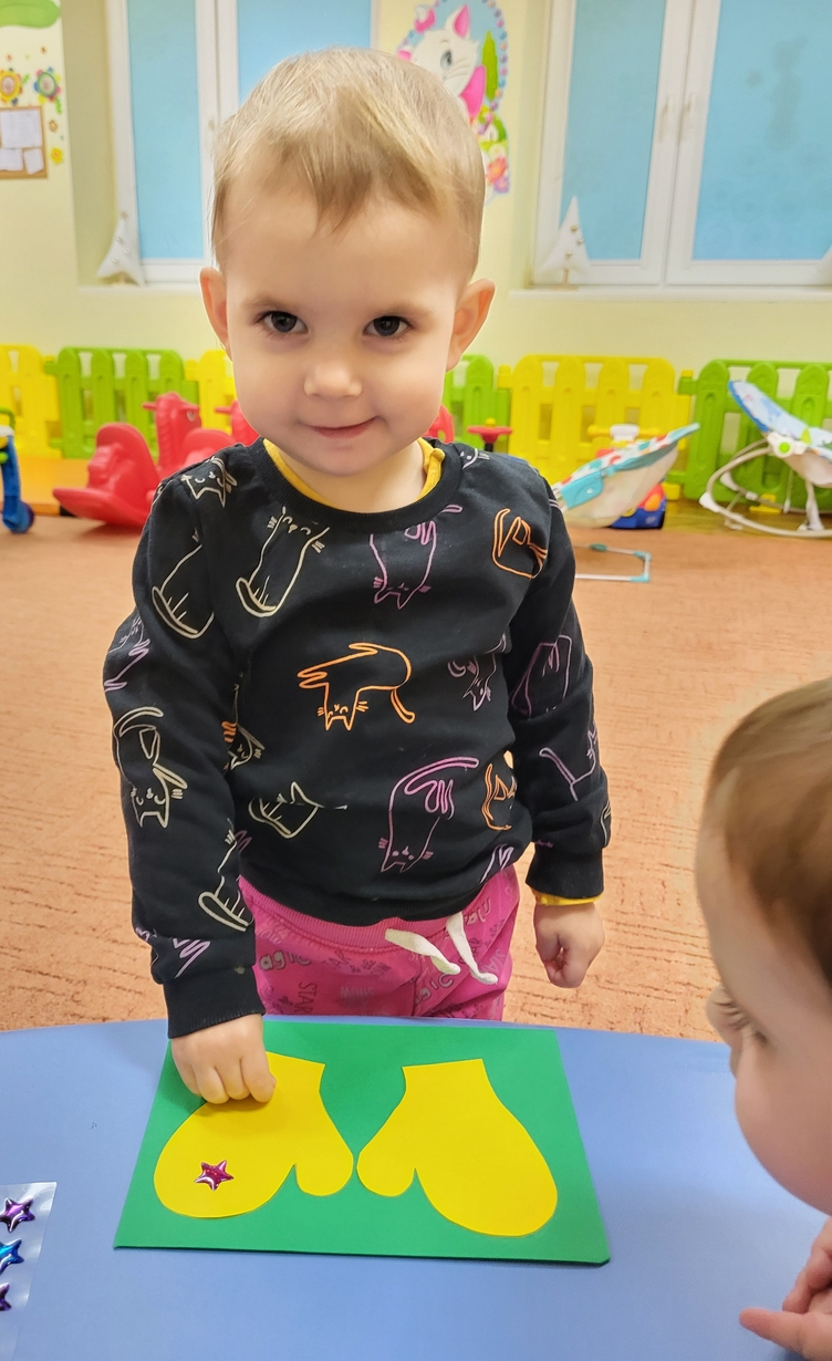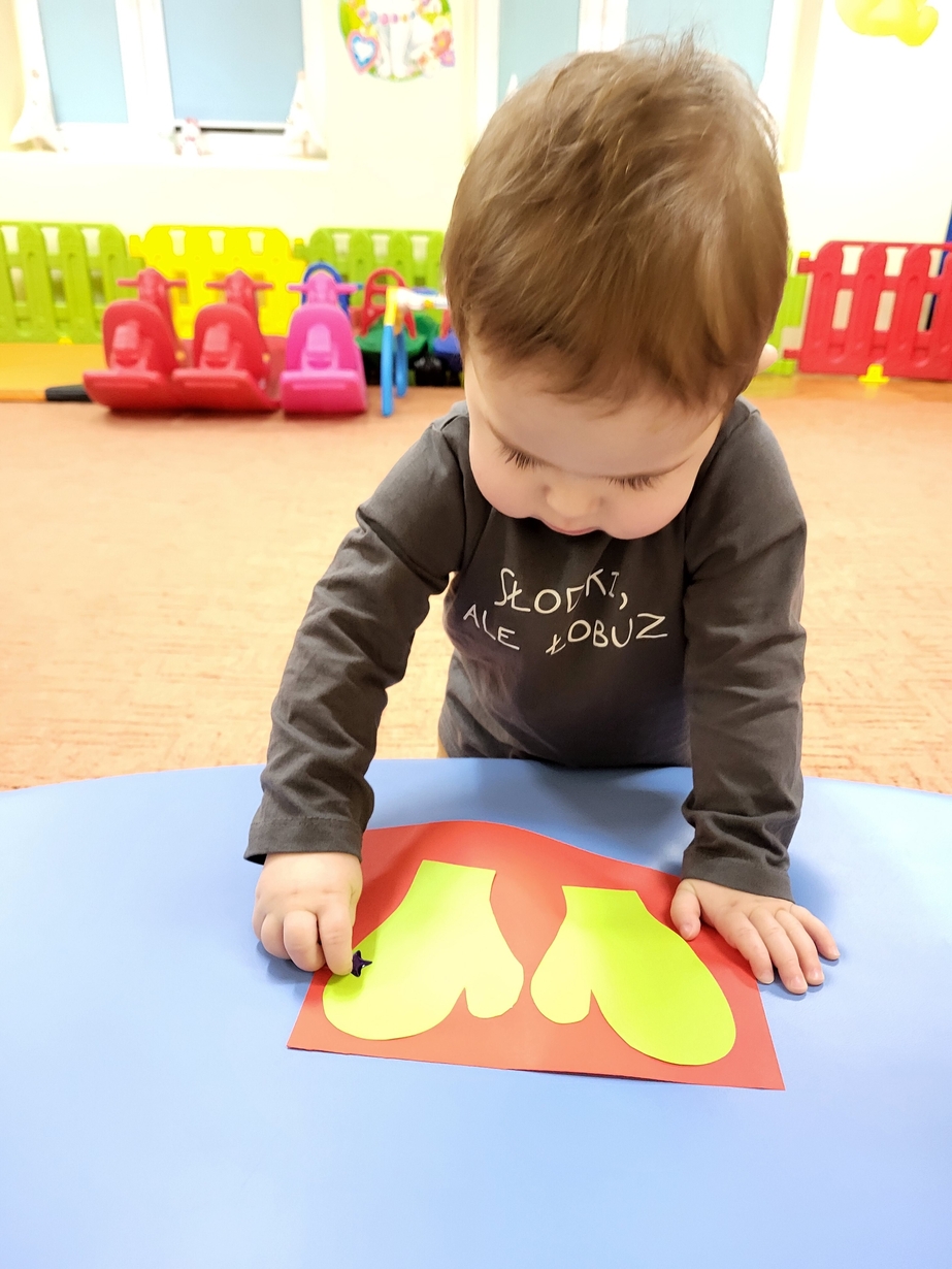 Potrzebne nam rękawiczki. Wiele radości sprawiło maluszkom przyklejanie gwiazdek jako ozdoby rękawiczek. Powstały super projekty a dzieciaczki poćwiczyły paluszki.