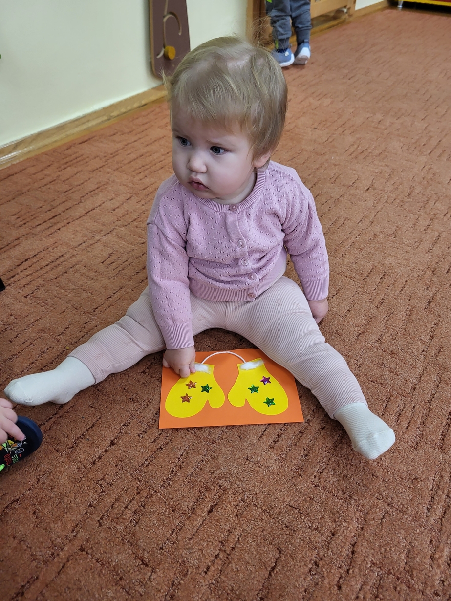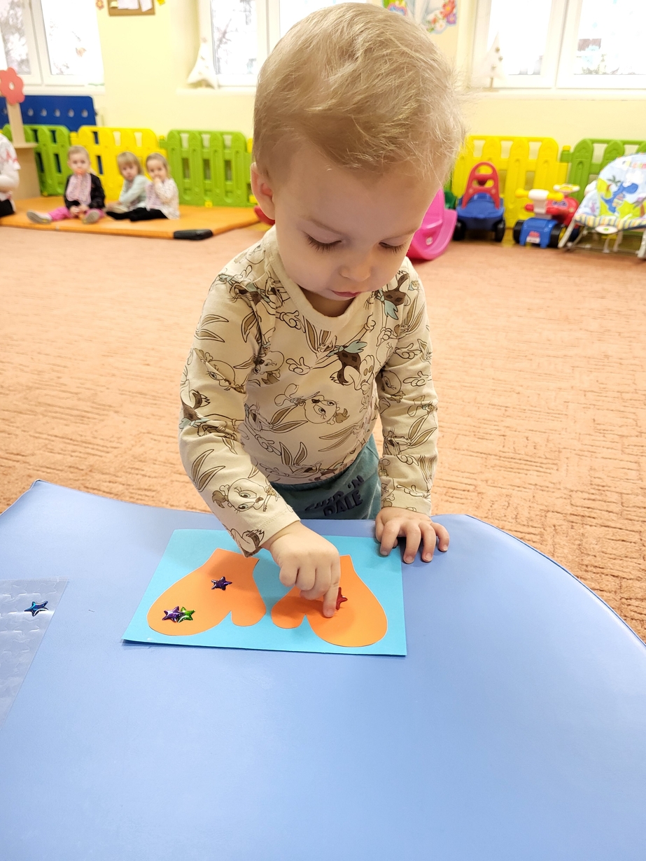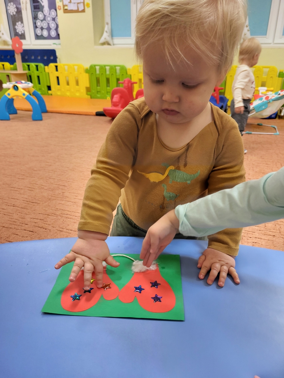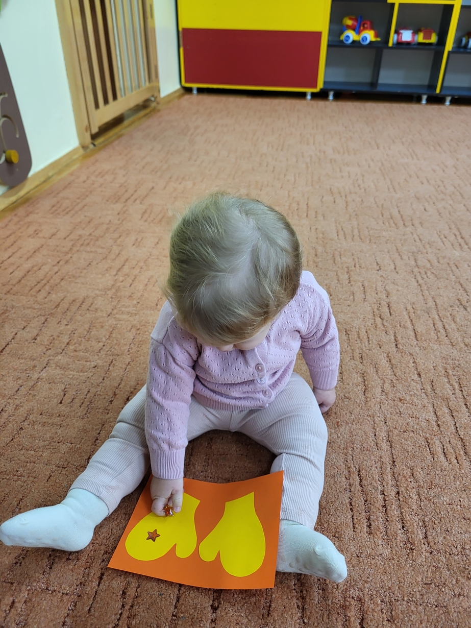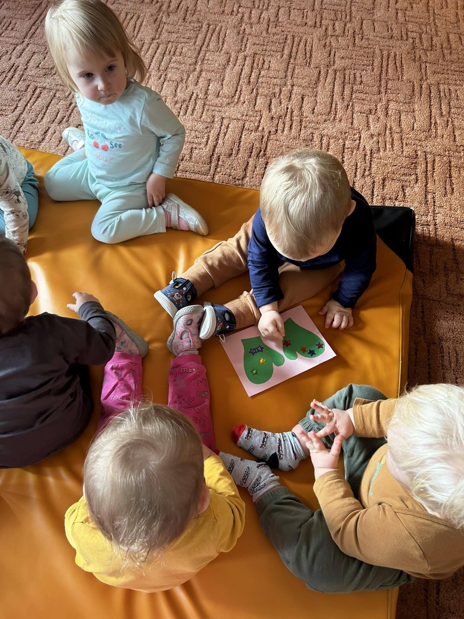 Potrzebne nam rękawiczki. Wiele radości sprawiło maluszkom przyklejanie gwiazdek jako ozdoby rękawiczek. Powstały super projekty a dzieciaczki poćwiczyły paluszki.