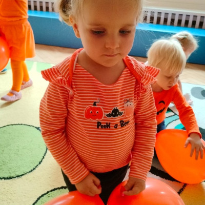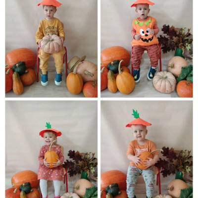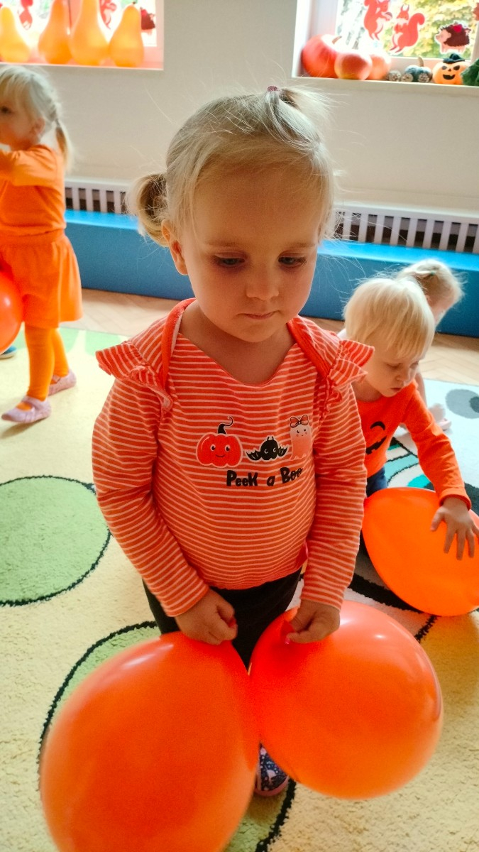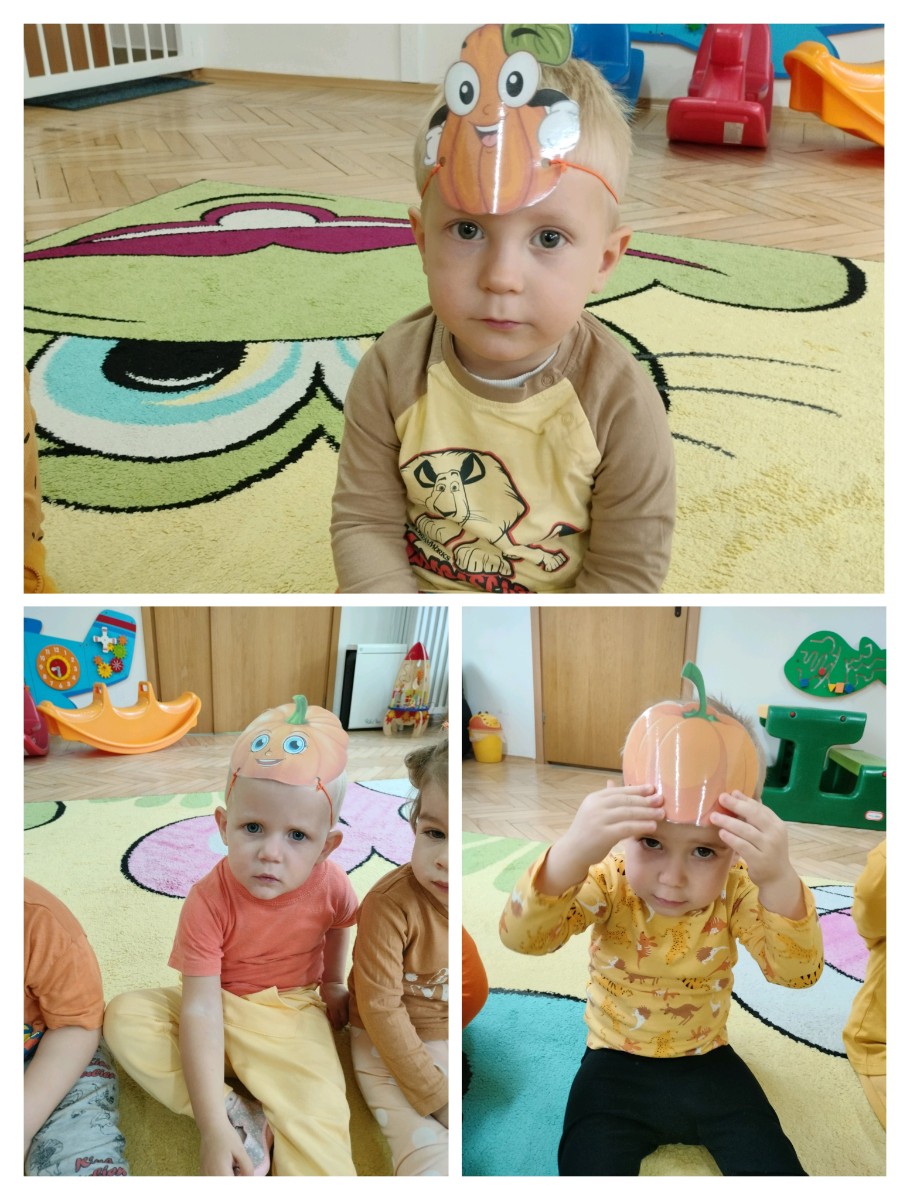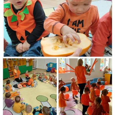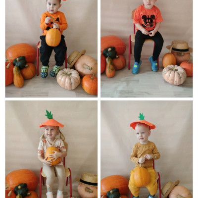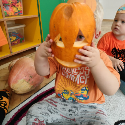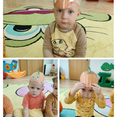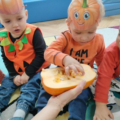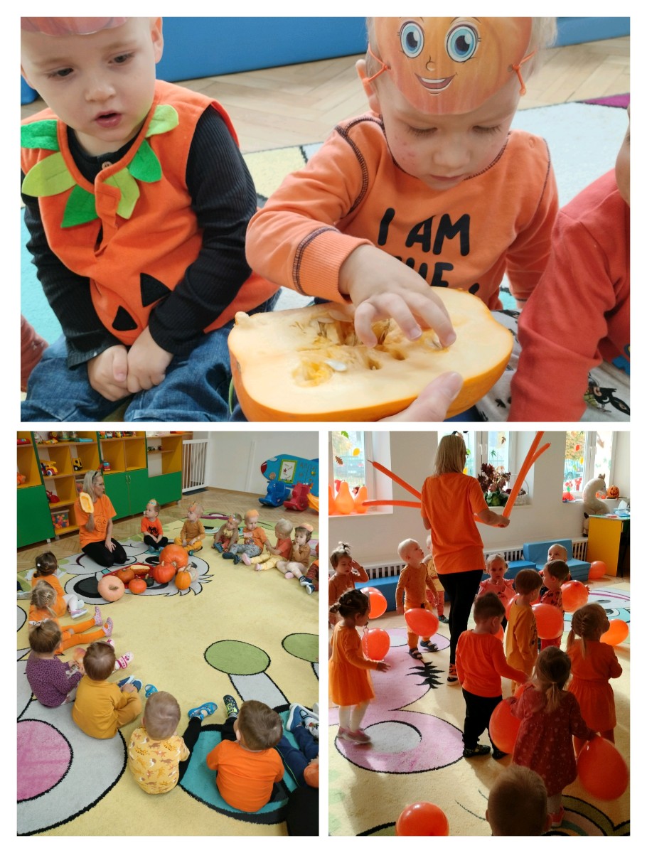 Zdjęcie przedstawia dzieci podczas zajęć w żłobku z okazji święta dyni