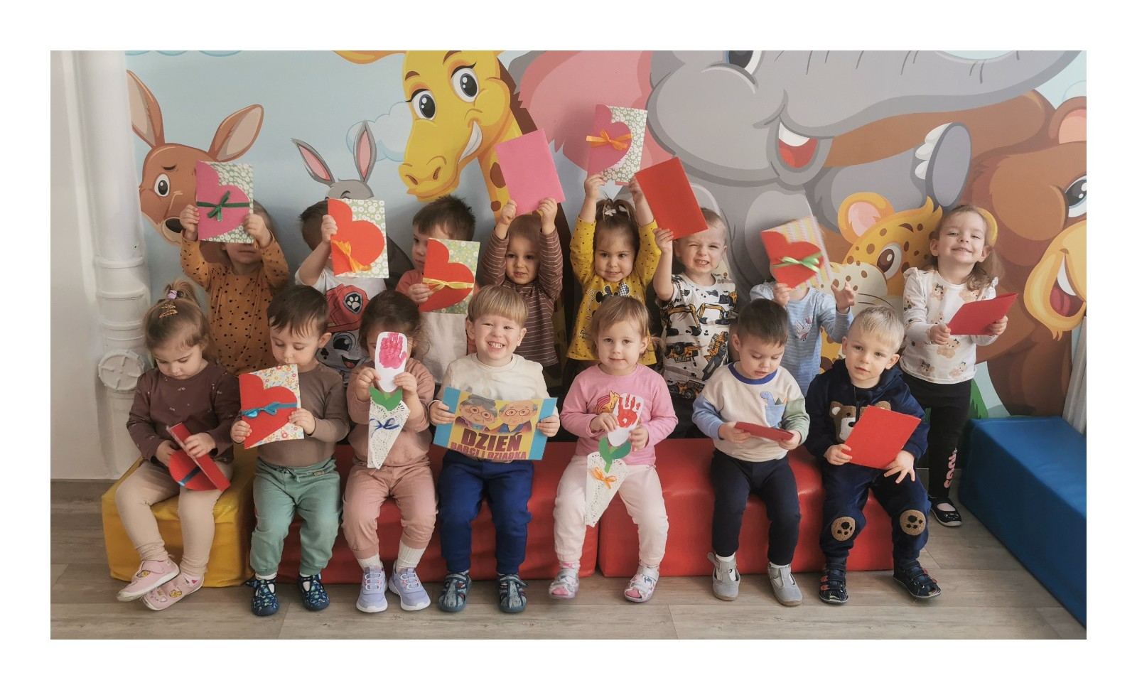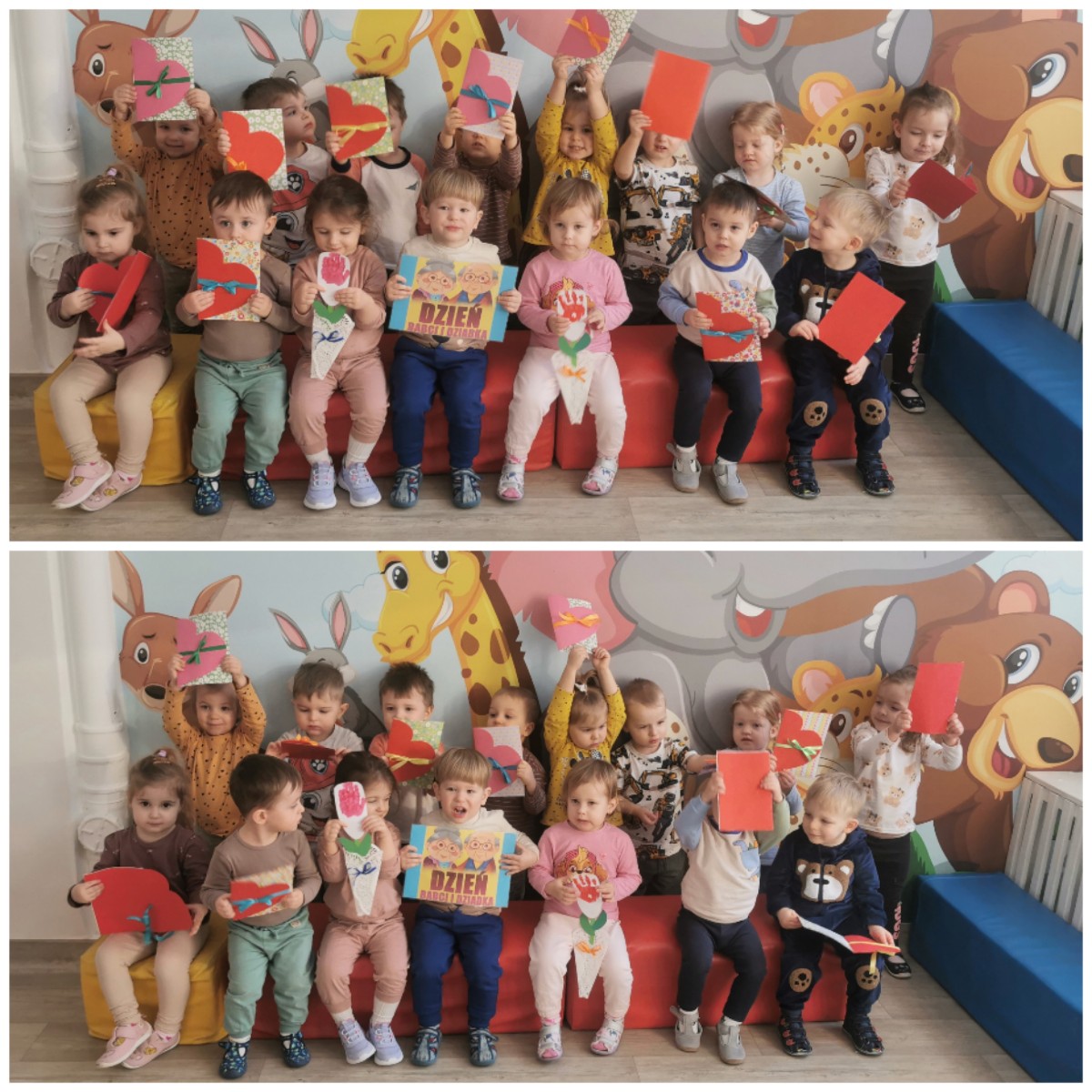 Ostatnie dni stycznia są dla Żabek dniami szczególnymi, ponieważ obchodzimy Święto osób wyjątkowych w naszym życiu- mianowicie naszych Babć i Dziadków. By docenić serce, jakie wkładają oni w opiekę i troskę o nas przygotowaliśmy dla nich piękne tulipany z odbitych farbkami rączek. Gotowe prace zostały powieszone na tablicy w żłobkowym korytarzu. Żabki przygotowały także dla swoich Dziadków piękne laurki z życzeniami, które wręczyły w tym dniu swoim najbliższym. Pragniemy złożyć wszystkim Babciom i Dziadkom najserdeczniejsze życzenia i podziękować za ogrom ciepła i pogody ducha, jaki roztaczają dookoła. Zapraszamy do galerii zdjęć.