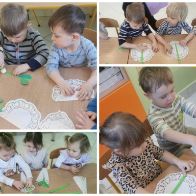 Zdjęcie przedstawia dzieci wykonujące prace plastyczne i świętujące Dzień Babci i Dziadzia.
