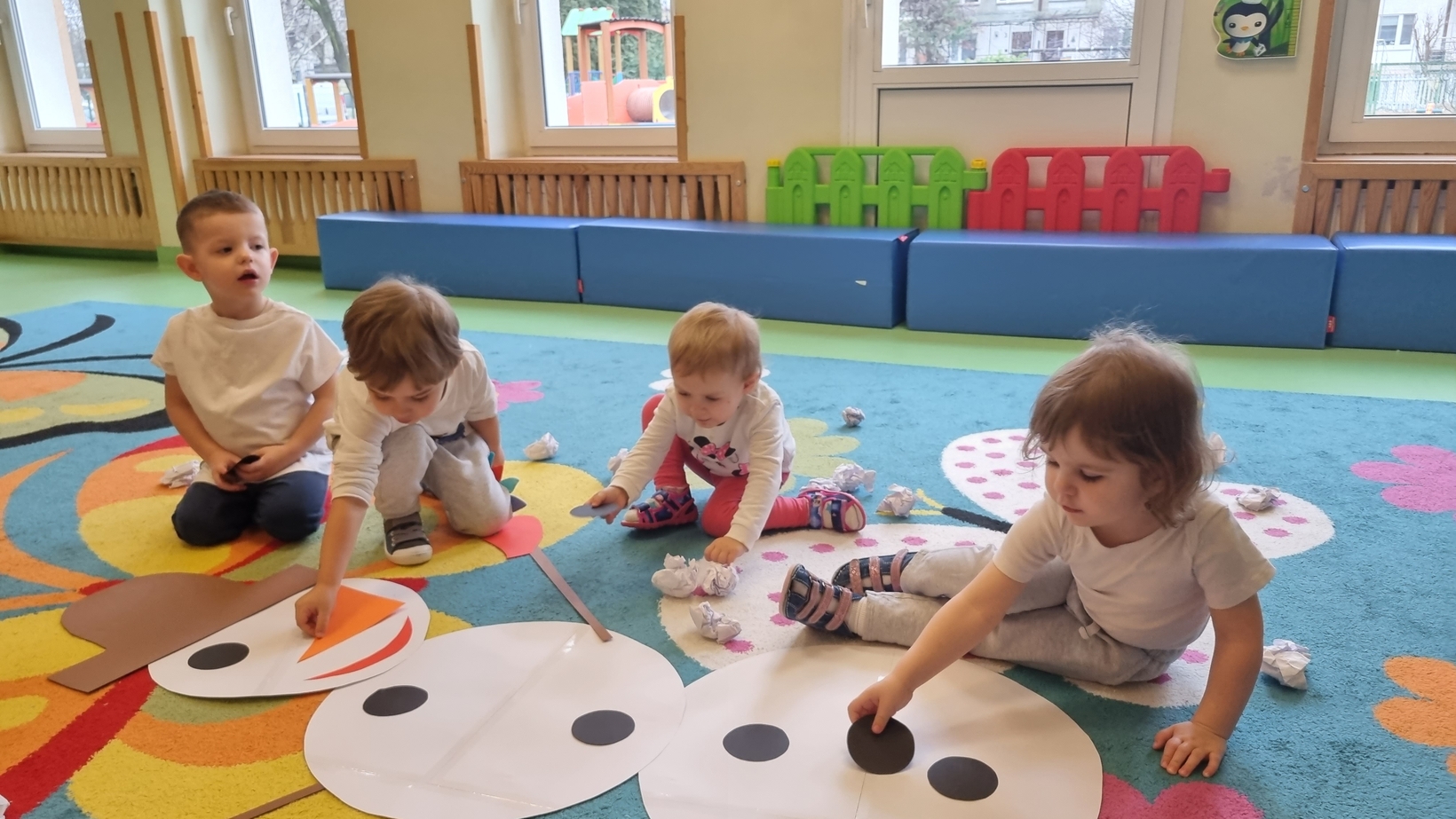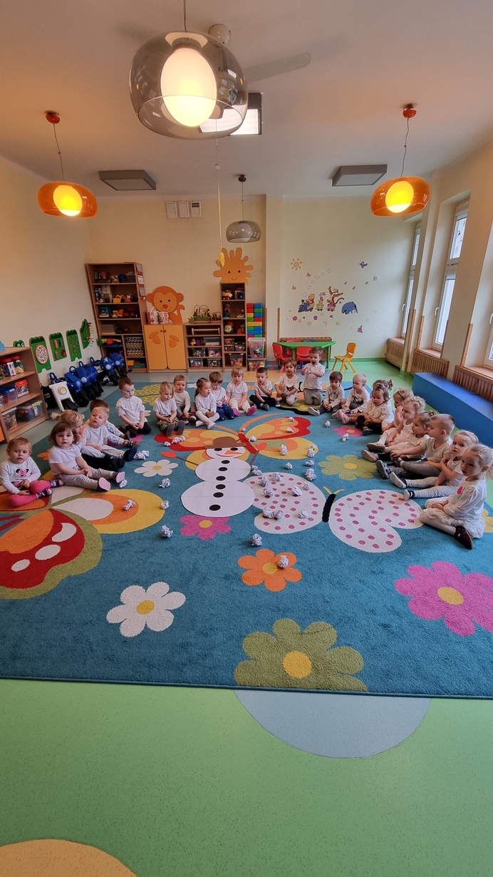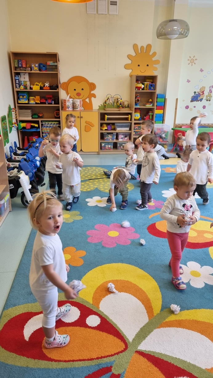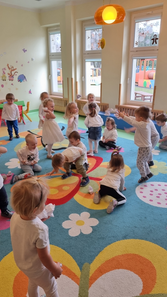 Dzisiaj w żłobku w grupie Pszczółek obchodziliśmy "Dzień Bałwana". Był to dzień wyjątkowy - bałwankowy. Dzieci ubrane były w bluzeczki koloru białego symbolizujące biały śnieg. Była to idealna okazja do zorganizowania dzieciom zabaw tematycznych takich jak: rzucanie papierowymi śnieżkami oraz układaliśmy dużego Bałwana. Dzieci także zaśpiewały wspólnie piosenkę o Bałwanie i nauczyły się wierszyka pt. "Ulepimy dziś Bałwana". Zwieńczeniem tego zimowego dnia była praca plastyczna - "Bałwanki nocą".