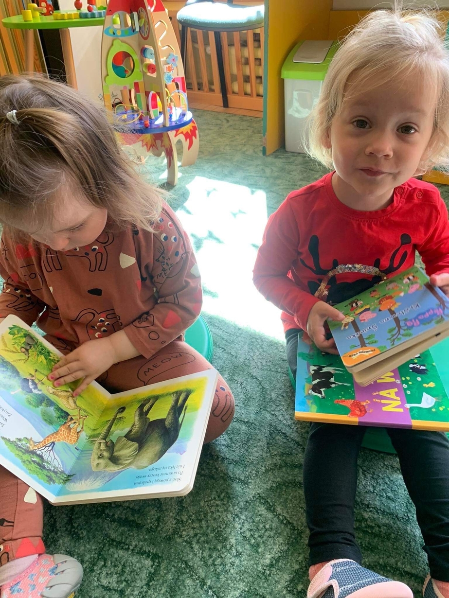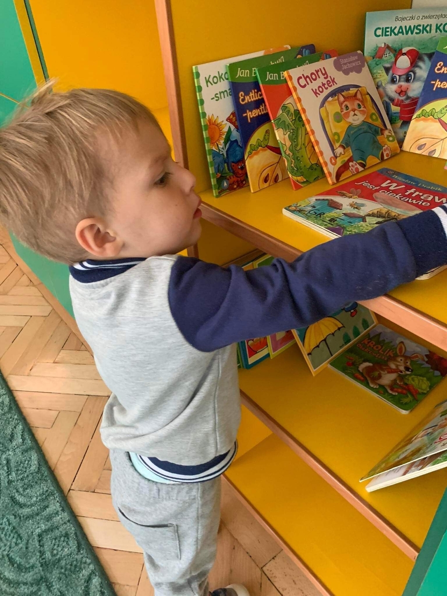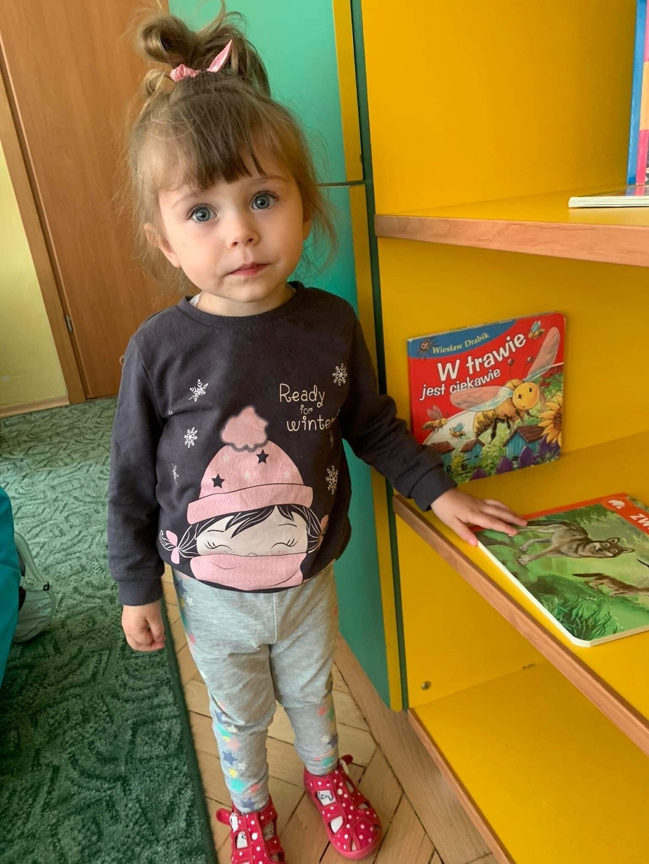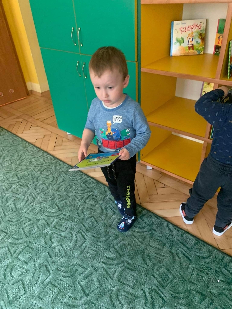 Tego dnia bawiliśmy się w bibliotekę, w której maluszki wypożyczały i oglądały bajeczki.
