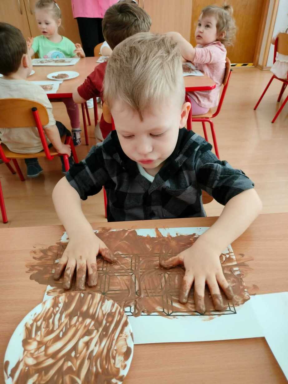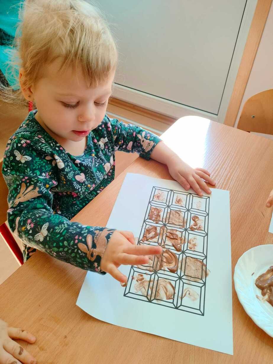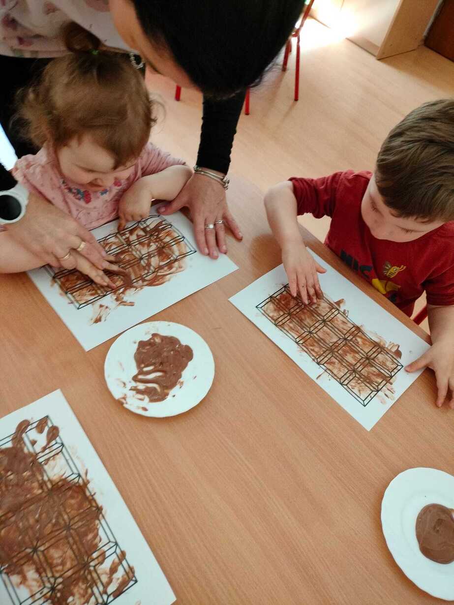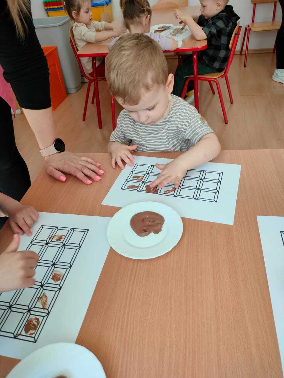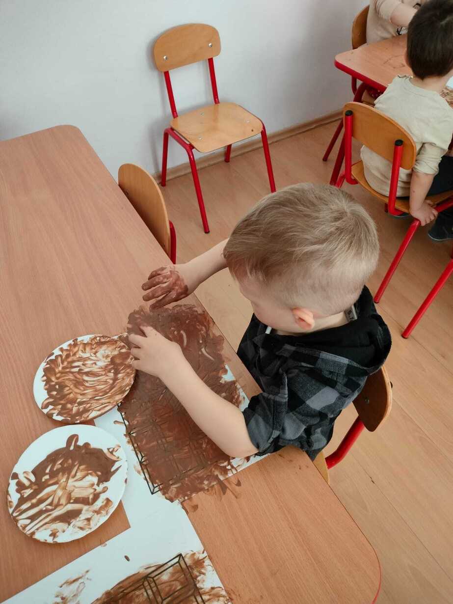 12 kwietnia Misie obchodziły najsłodszy dzień w roku DZIEŃ CZEKOLADY. A zaczeło się od pysznej kanapki z kremem czekoladowym na śniadanie. Później dzieci dowiedziały się jak powstaje i jakie są jej rodzaje .Na końcu wspólnie wykonaliśmy masę czekoladową z jogurtu i kakao, którą pomalowały paluszkami szablon tabliczki czekolady.