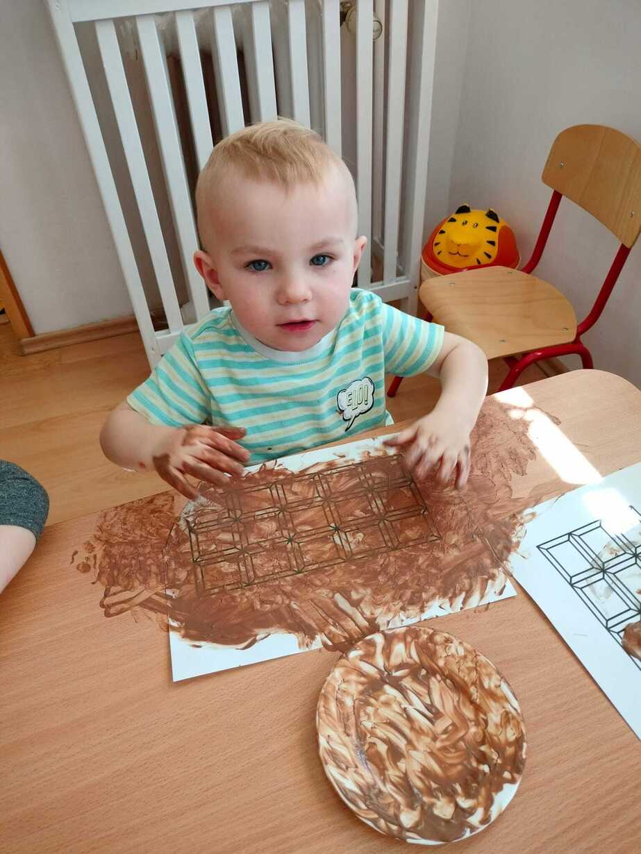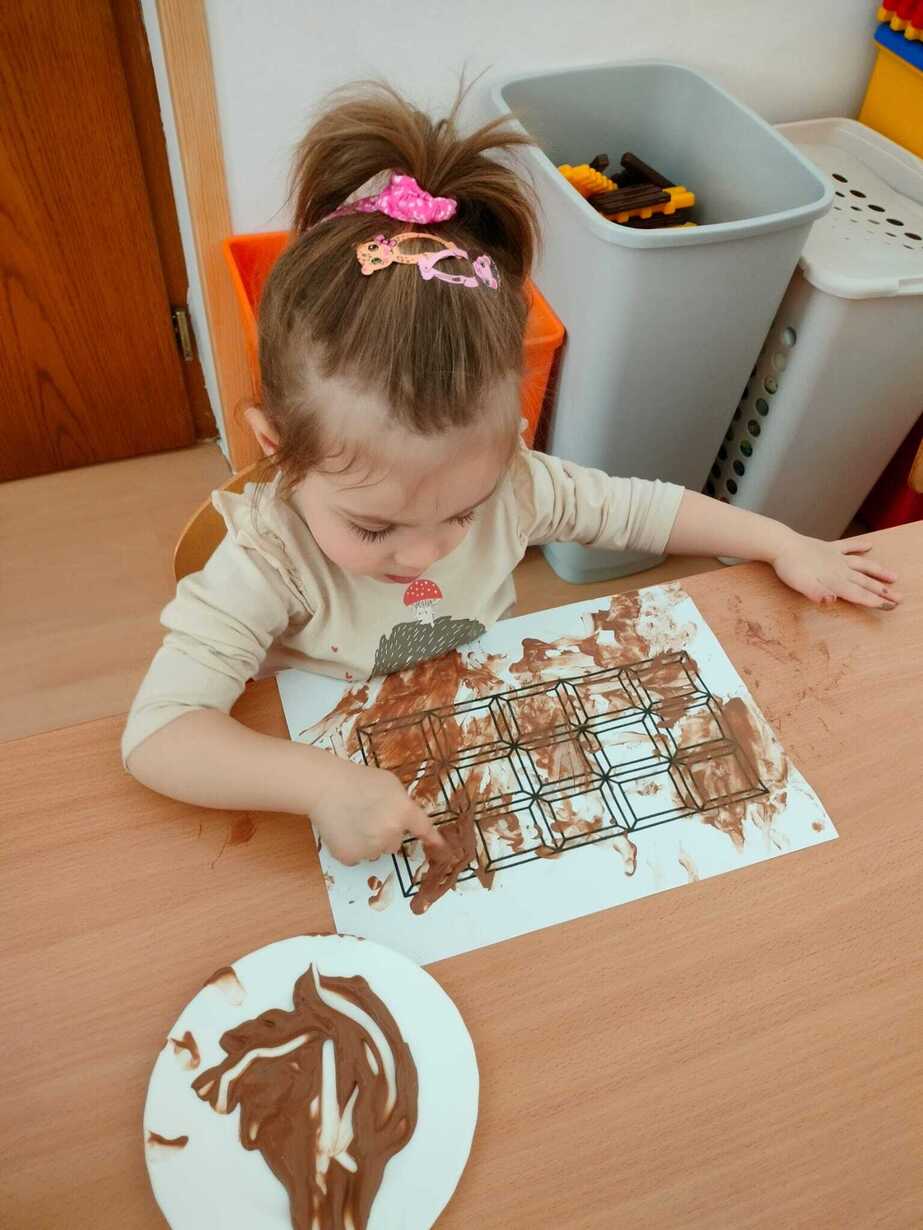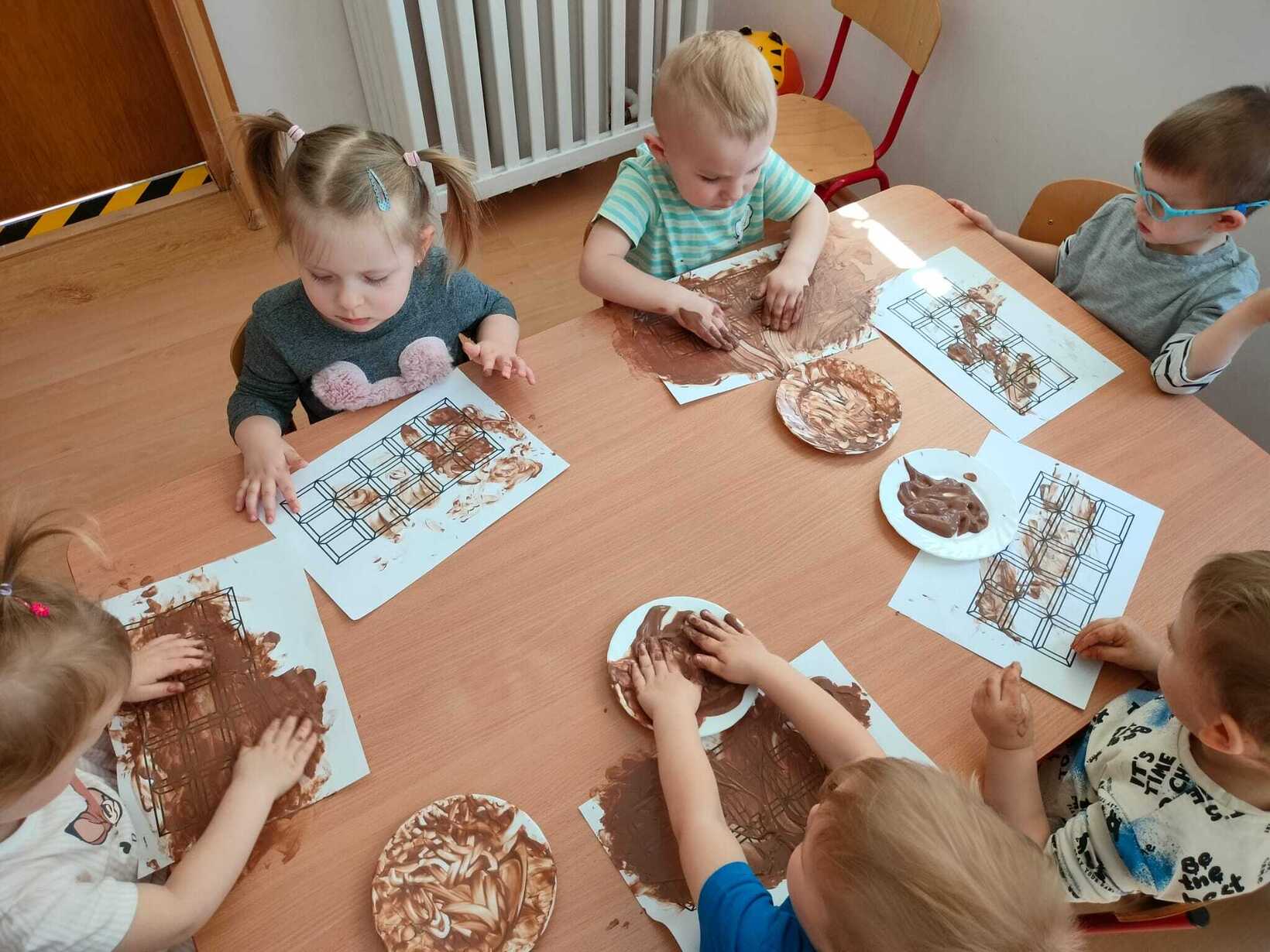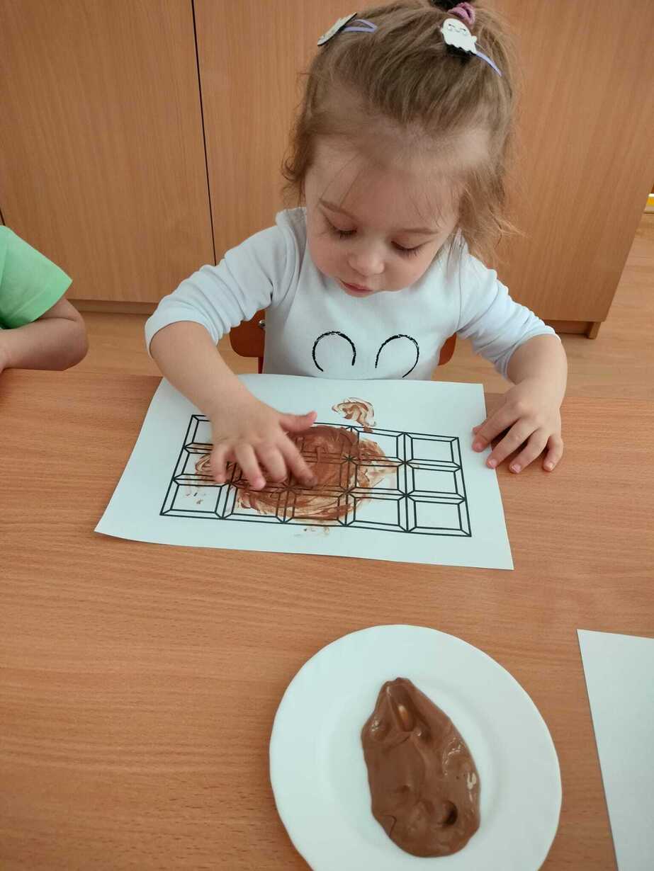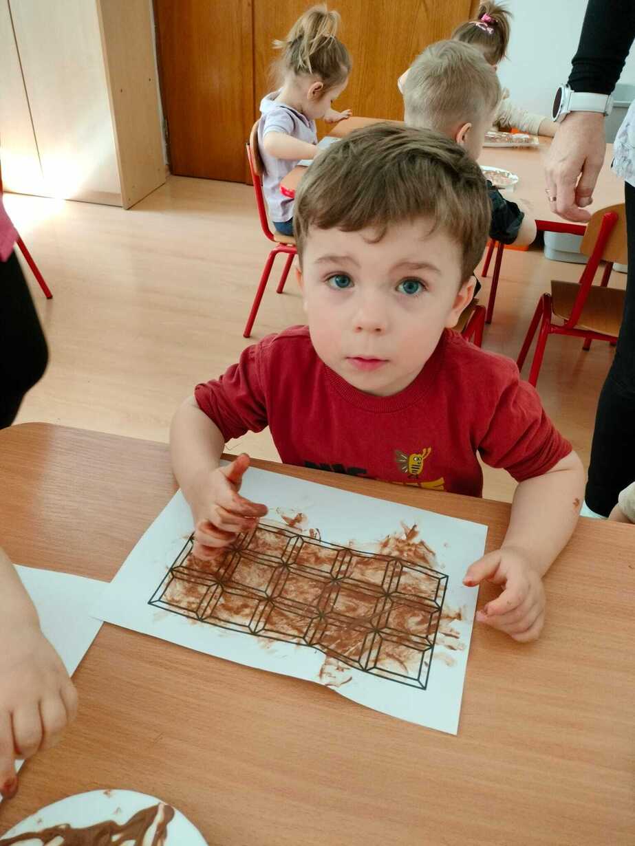 12 kwietnia Misie obchodziły najsłodszy dzień w roku DZIEŃ CZEKOLADY. A zaczeło się od pysznej kanapki z kremem czekoladowym na śniadanie. Później dzieci dowiedziały się jak powstaje i jakie są jej rodzaje .Na końcu wspólnie wykonaliśmy masę czekoladową z jogurtu i kakao, którą pomalowały paluszkami szablon tabliczki czekolady.