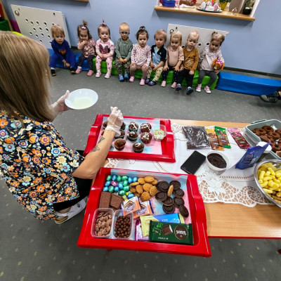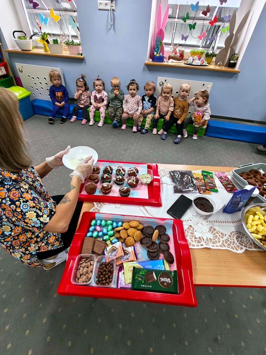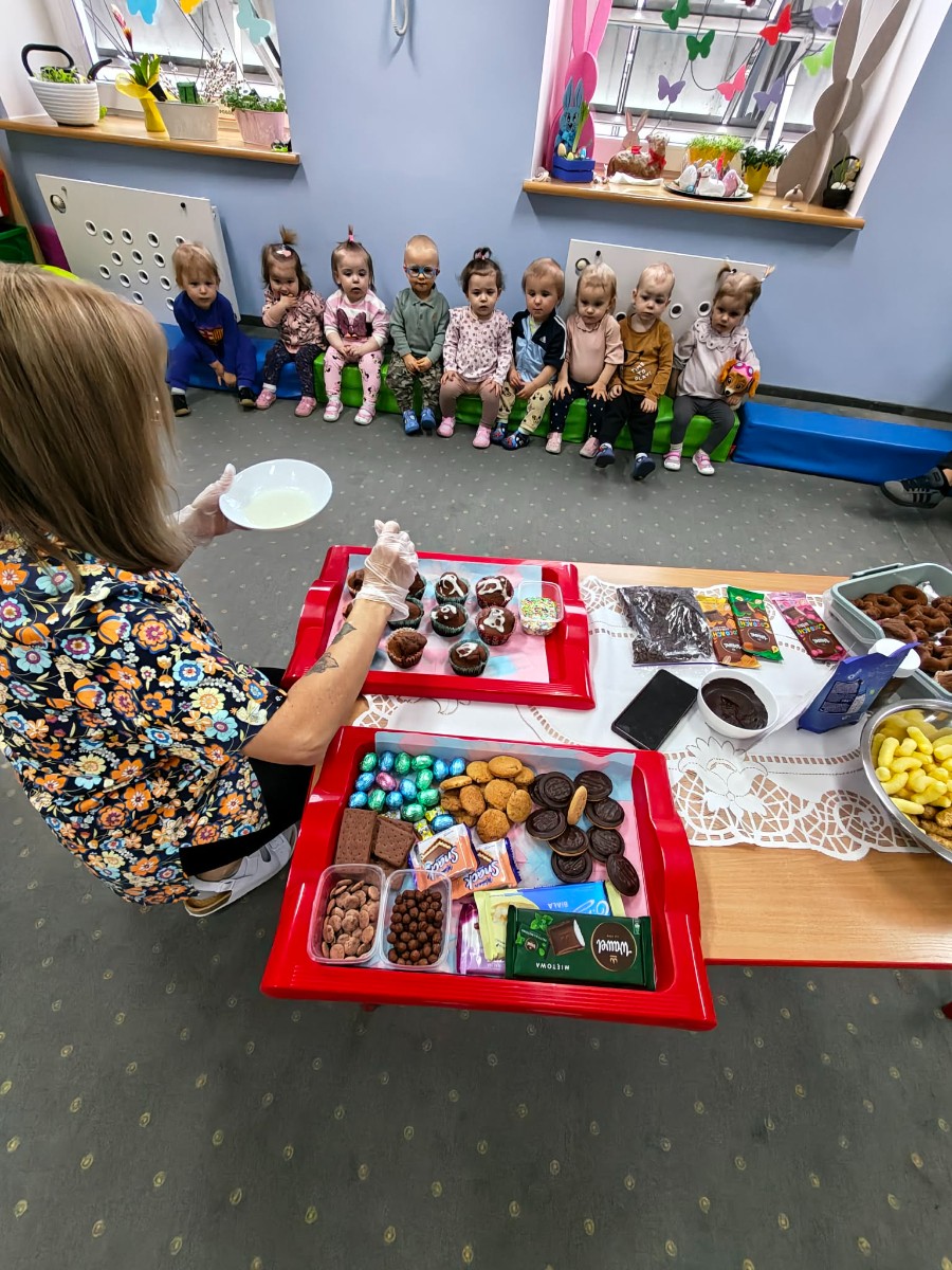 Dzień Czekolady w żłobku to radosne, sensoryczne święto (12 kwietnia) skupione na zabawie czekoladą i kakao. Zajęcia obejmują degustację , zabawy plastyczne oraz sensoryczne (wąchanie, dotyk). To okazja do poznania smaków i faktur, połączona z nauką o ziarnach kakaowca.