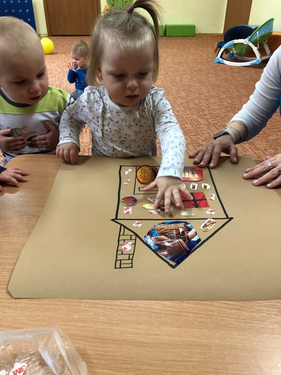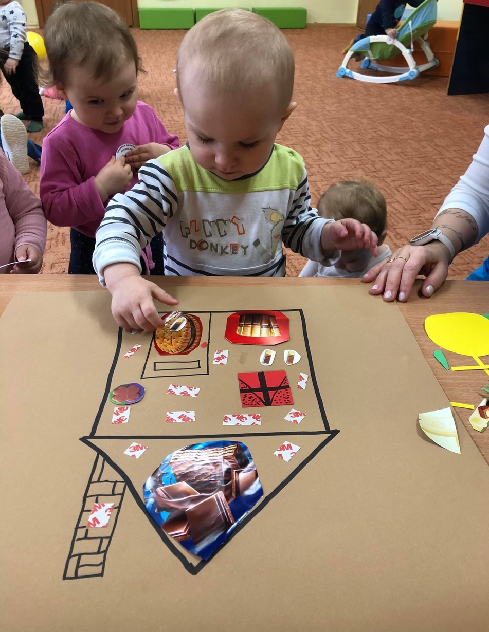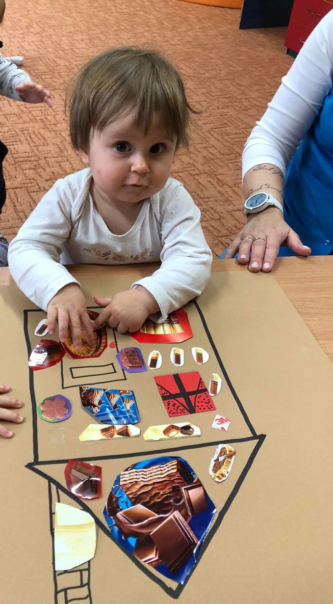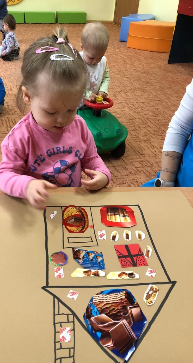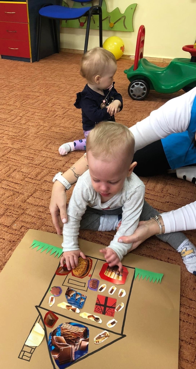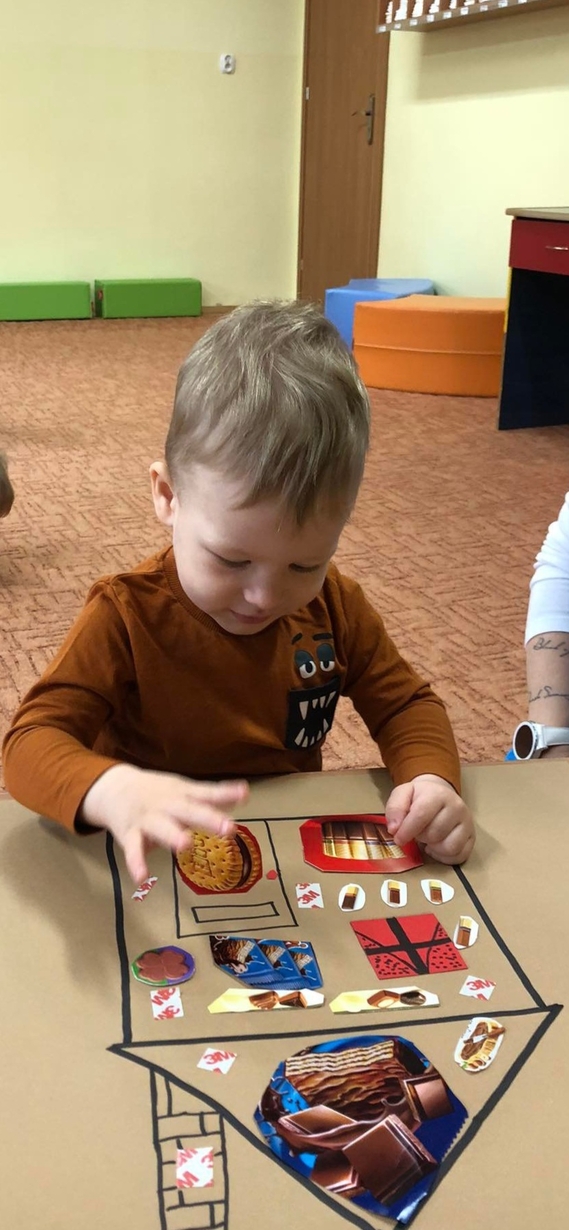 Na grupie biedronek postanowiliśmy troszkę inaczej obchodzić DZIEŃ CZEKOLADY . Dbając o ząbki naszych maluszków zamiast czekoladki zabawiliśmy się w dekorowanie domku kolorowymi papierkami po czekoladkach.