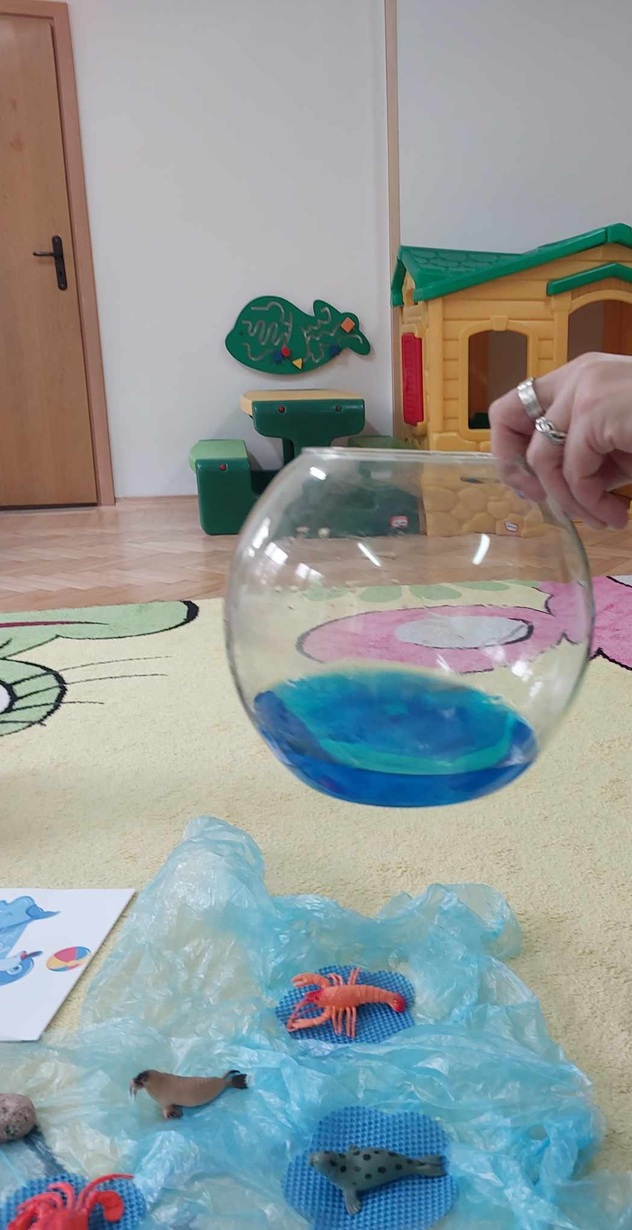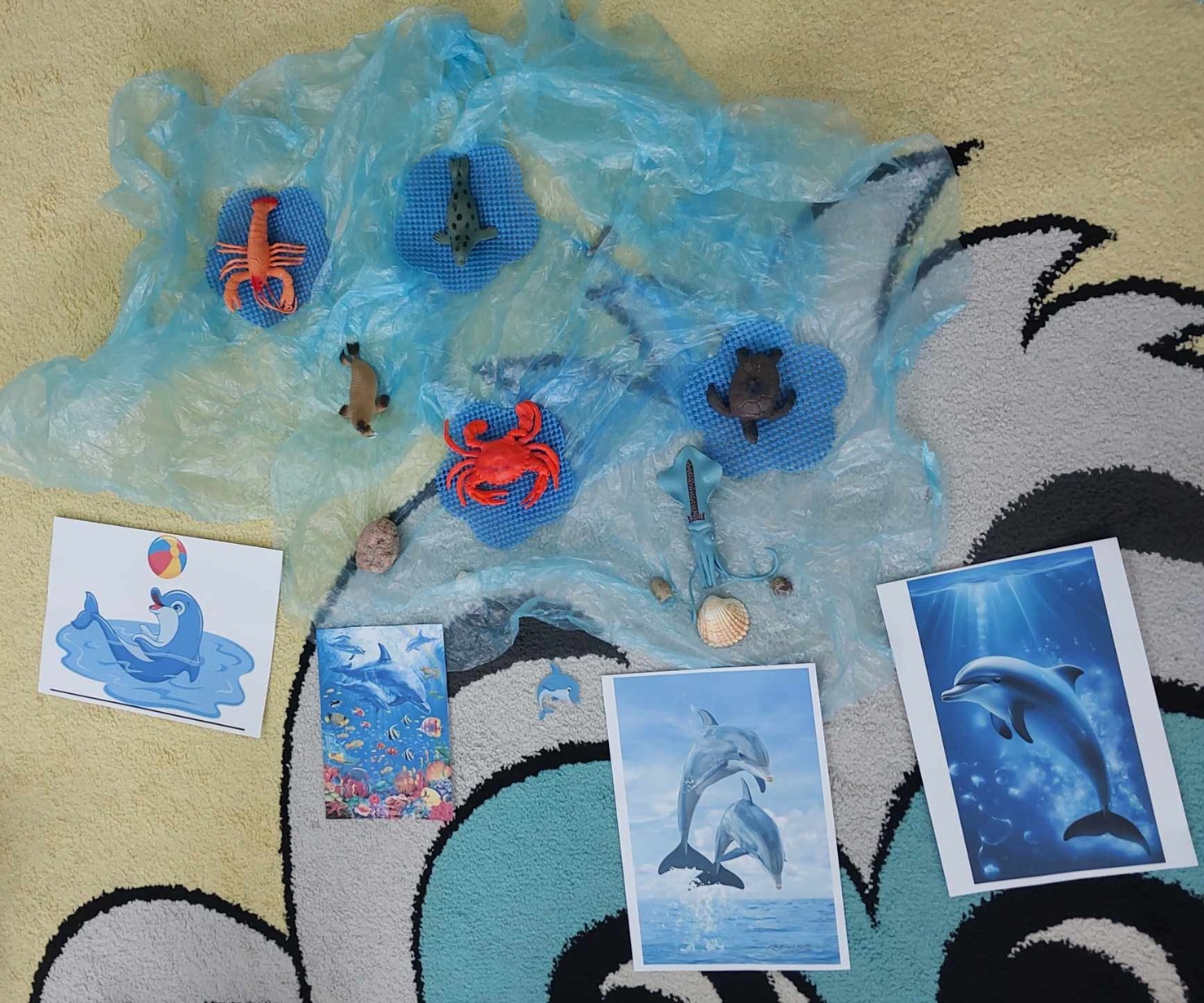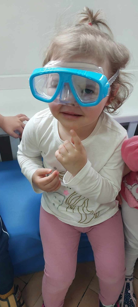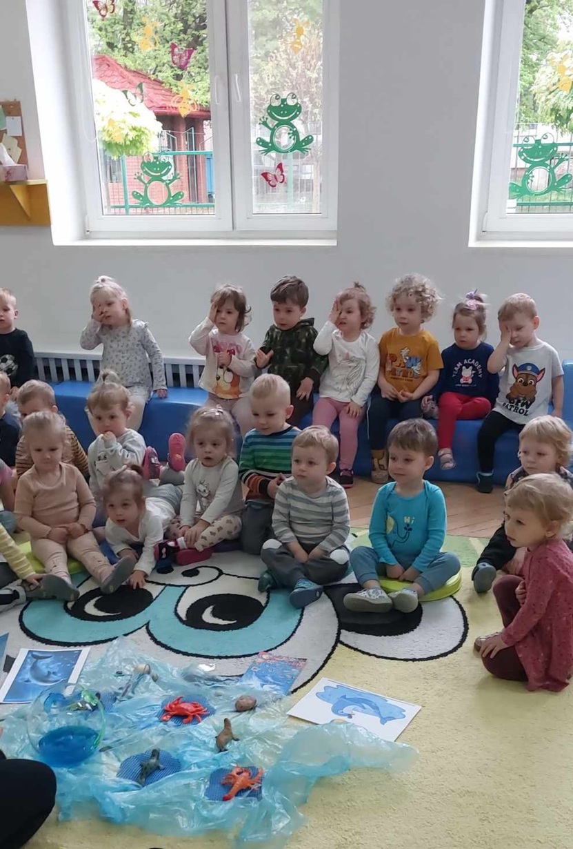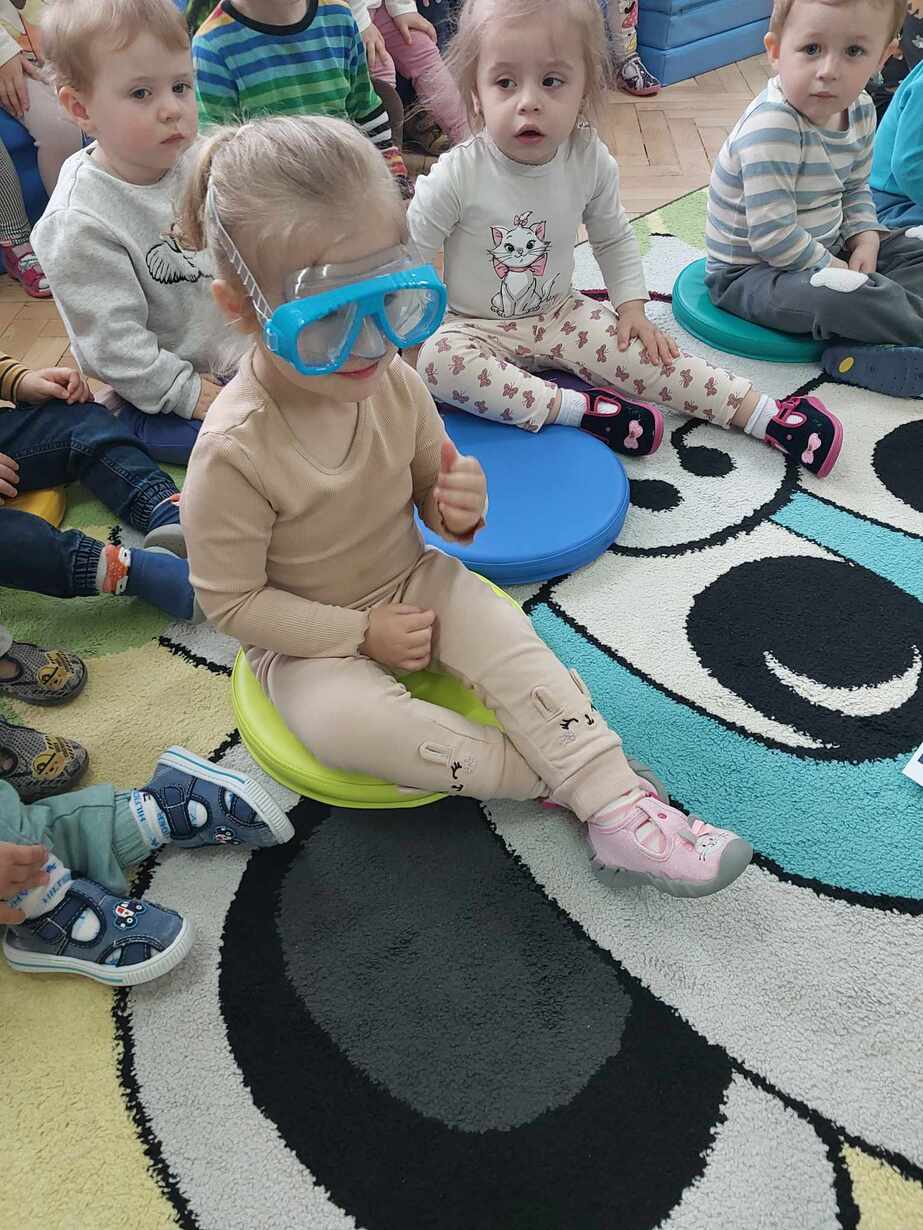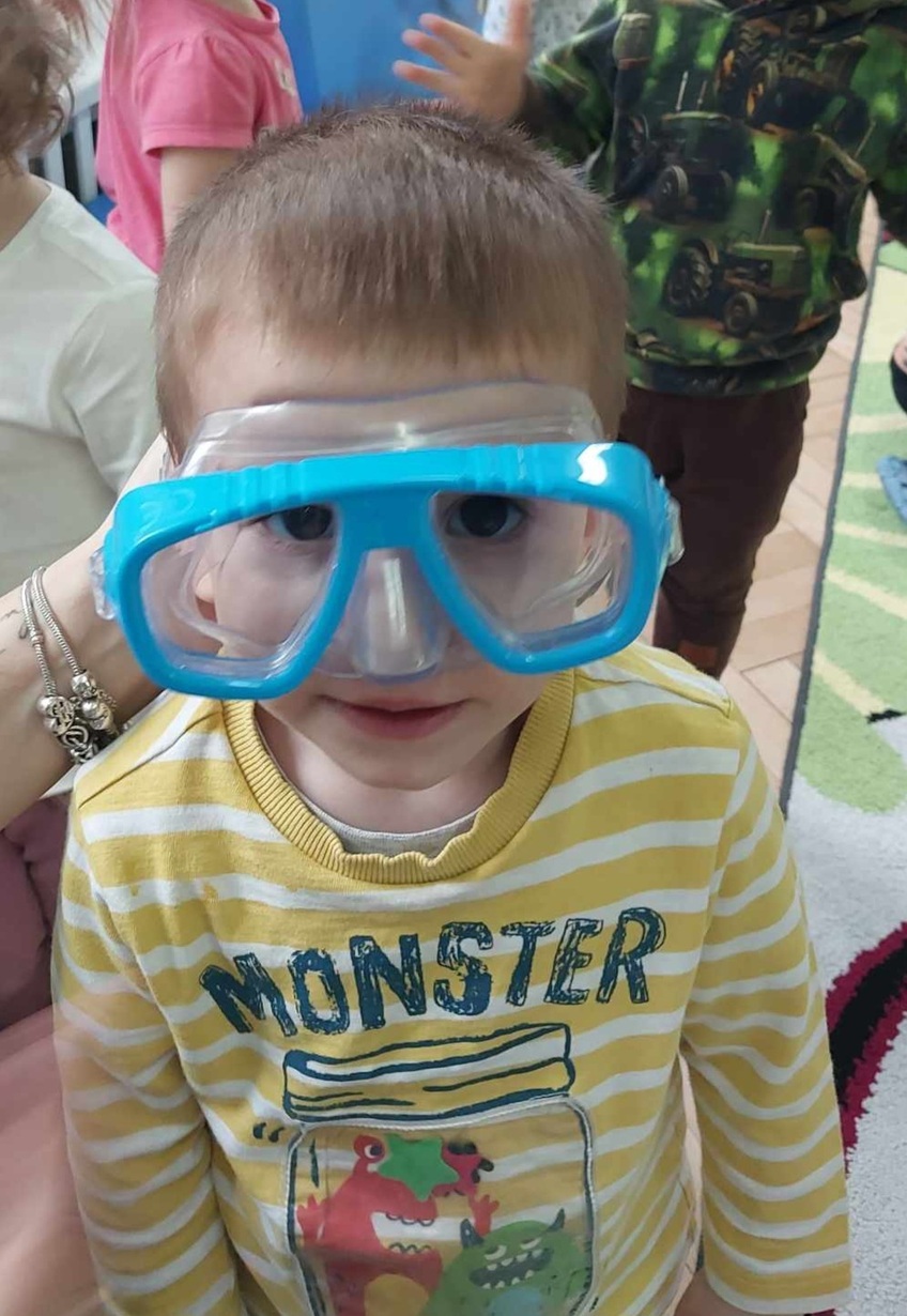 Dzieci dowiedziały się, gdzie mieszkają delfiny, jak śpią oraz czym się żywią. Misie z zaciekawieniem słuchały również dźwięków jakie wydobywają z siebie te ssaki. W małym akwarium zaczarowaliśmy wodę na niebiesko,aby maluszki mogły zobaczyć w jakim środowisku żyją delfinki . Dzieciaczki przymierzały gogle ,w jakich można obserwować podwodny świat.