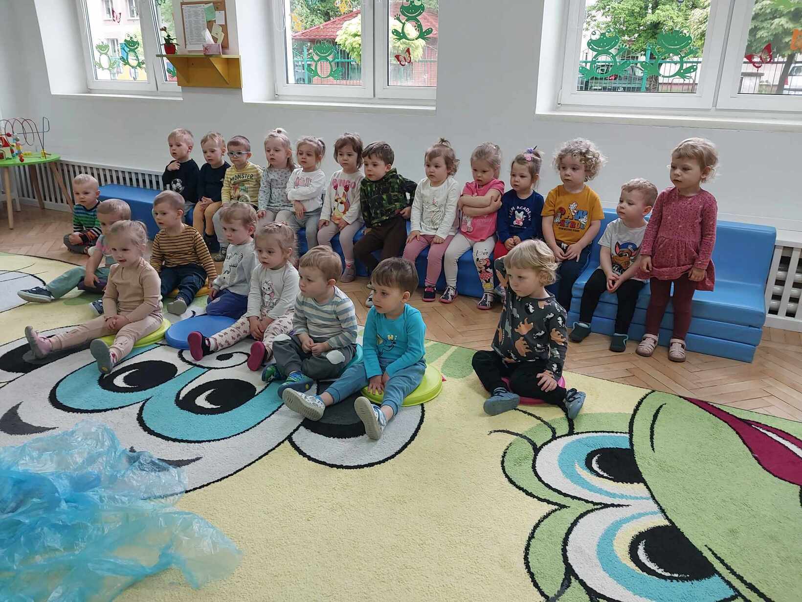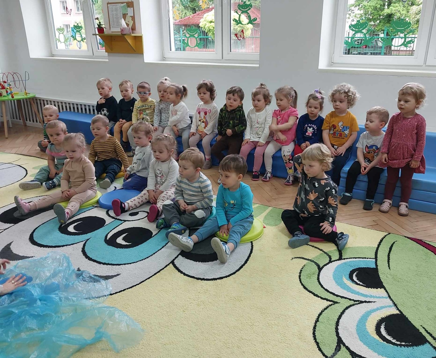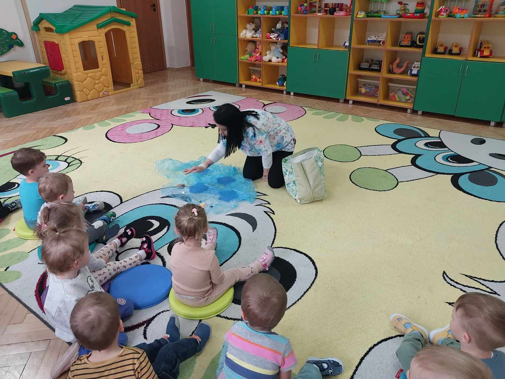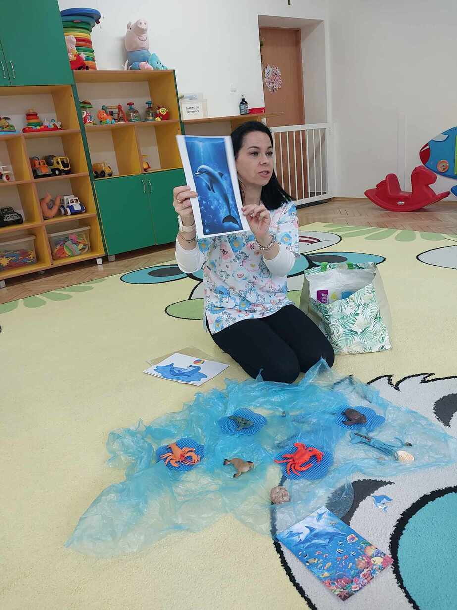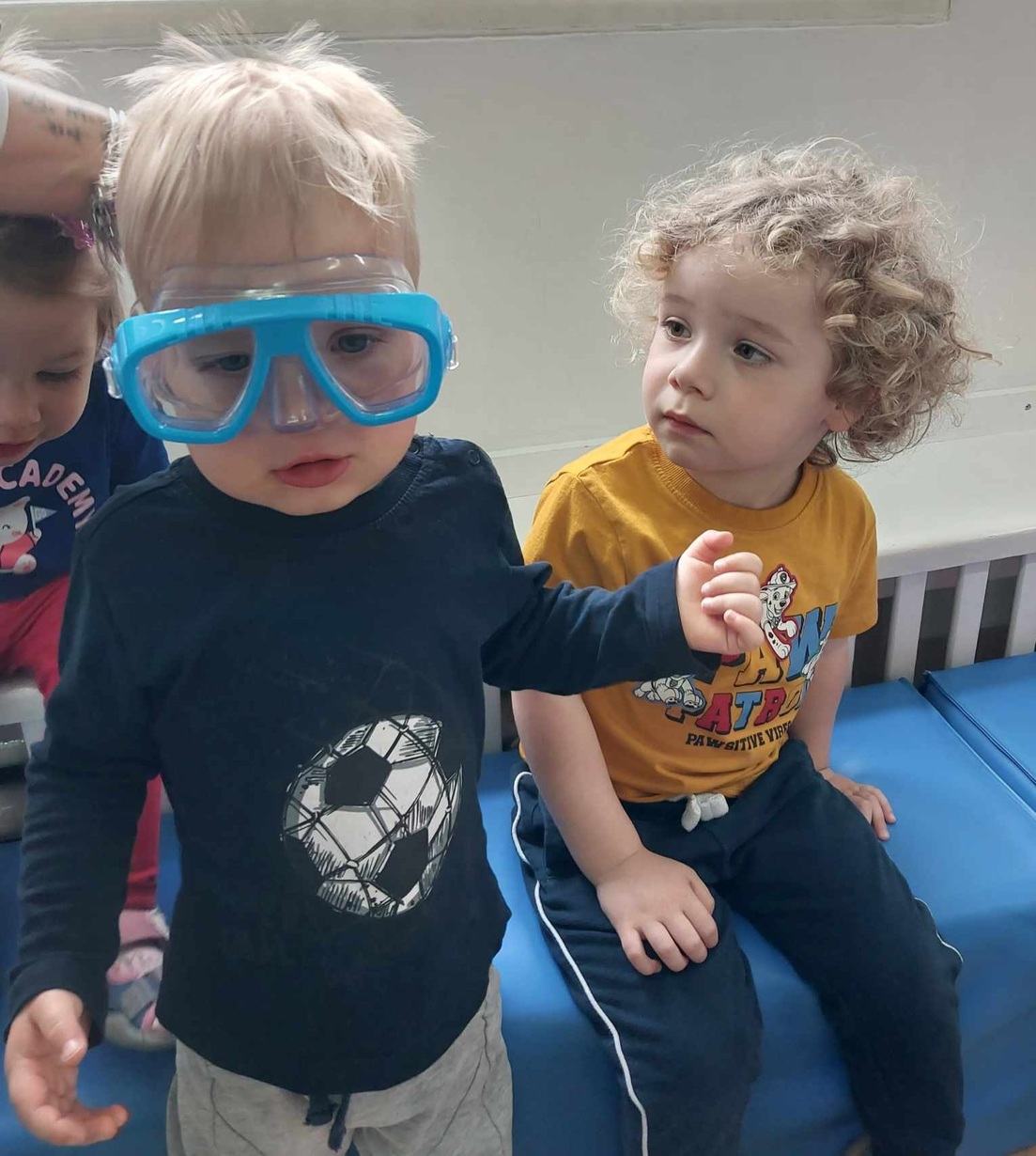 Dzieci dowiedziały się, gdzie mieszkają delfiny, jak śpią oraz czym się żywią. Misie z zaciekawieniem słuchały również dźwięków jakie wydobywają z siebie te ssaki. W małym akwarium zaczarowaliśmy wodę na niebiesko,aby maluszki mogły zobaczyć w jakim środowisku żyją delfinki . Dzieciaczki przymierzały gogle ,w jakich można obserwować podwodny świat.