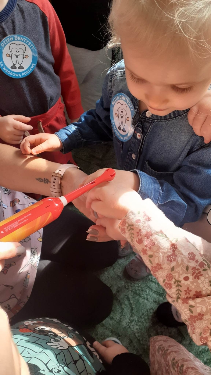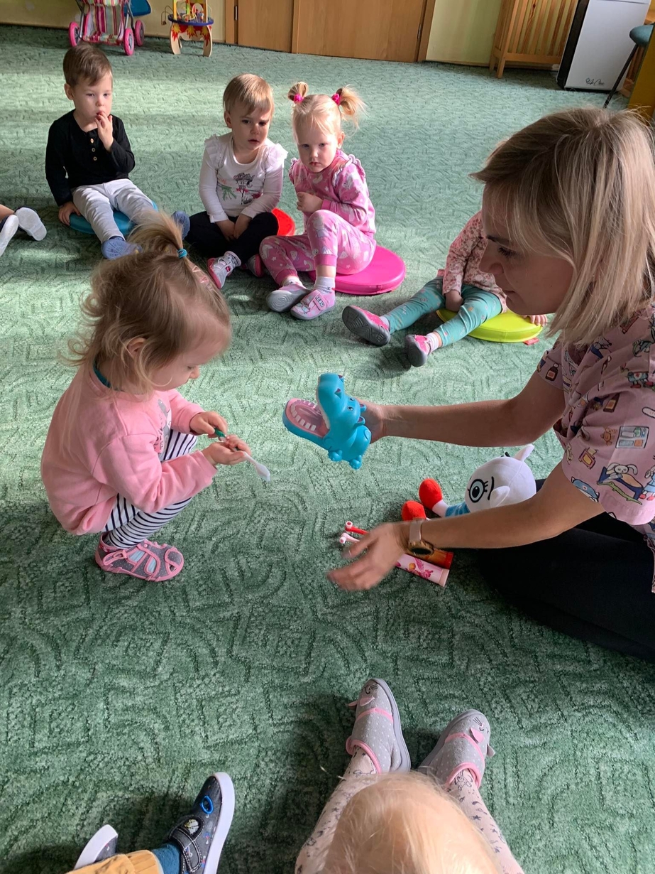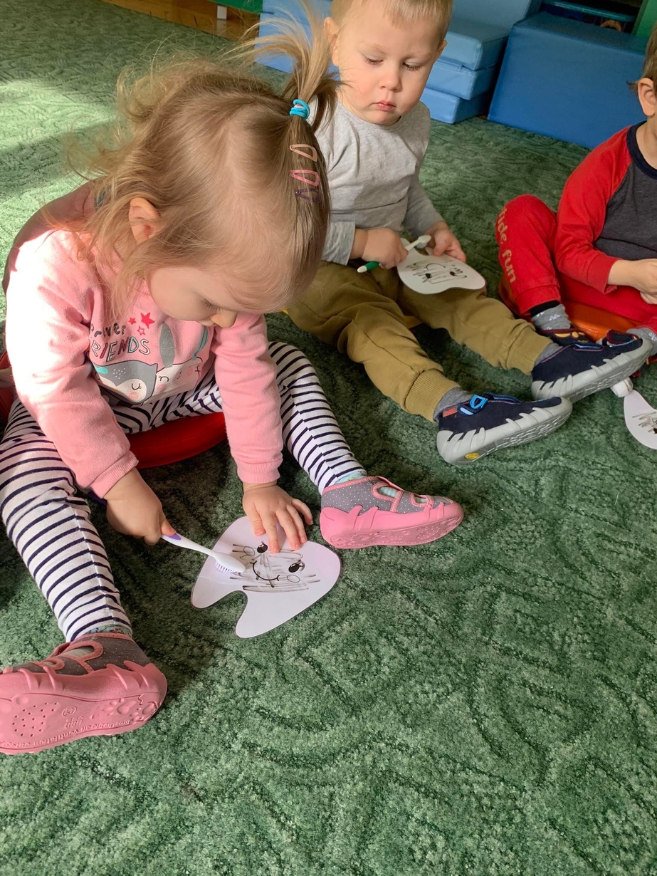 Dnia 5 marca obchodzony jest Dzień Dentysty?. Maluszki w poniedziałek miały okazję dowiedzieć się jak dać o higienę jamy ustnej, aby ząbki były zdrowe, a ich uśmiech błyszczał czystością. Wraz z Kicią Kocią dzieci poznały zawód dentysty. Wszystkie Misie mogły wykazać się umiejętnościami praktycznymi szczotkując zęby grupowemu hipopotamowi Felusiowi. Poznaliśmy przybory niezbędne do utrzymania czystości jamy ustnej??. Dzieci dowiedziały się również co warto zjadać, aby ich ząbki były mocne i zdrowe. Nauczyliśmy się również piosenki o myciu zębów, która bardzo spodobała się naszym Misiom. Wróżka zębuszka na zakończenie wspólnych zabaw wręczyła każdemu uczestnikowi pamiątkowy medal "przyjaciela zdrowych ząbków". Prowadzenie tego typu działań edukacyjnych ma na celu wdrożenie dzieci do codziennego szczotkowania ząbków???.