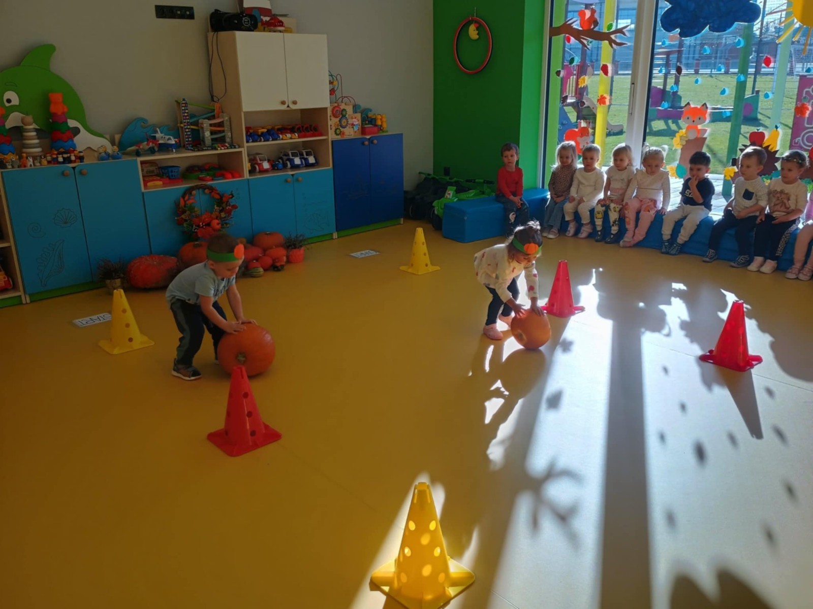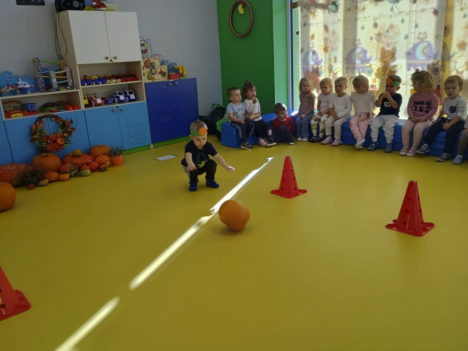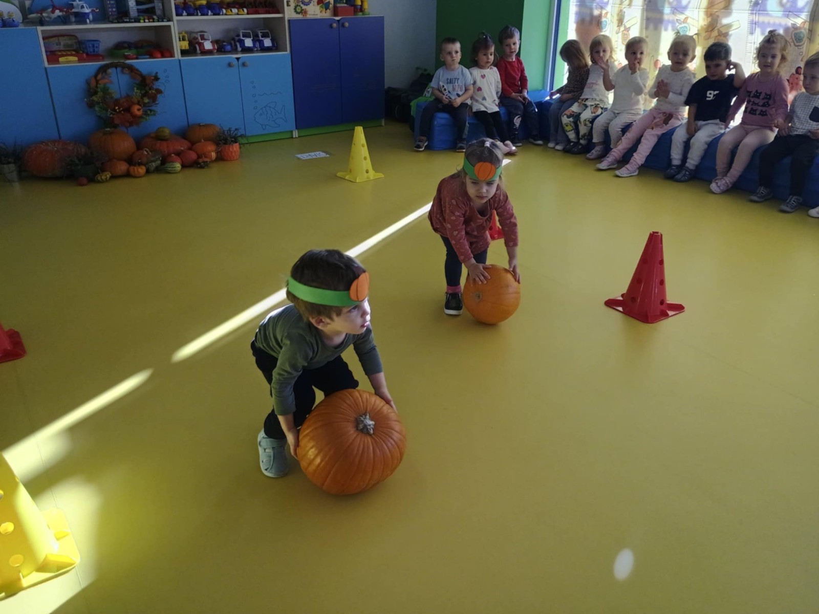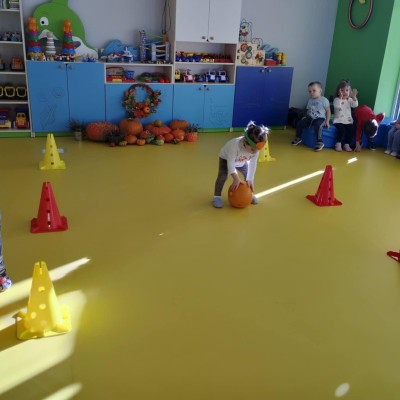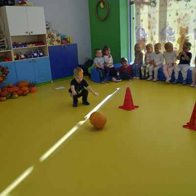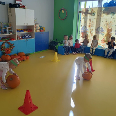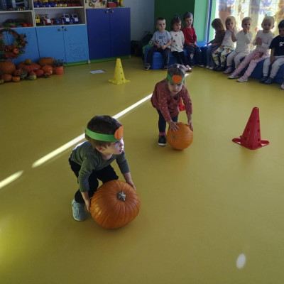 Zdjęcie przedstawia dzieci podczas zabaw z okazji święta dyni