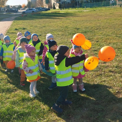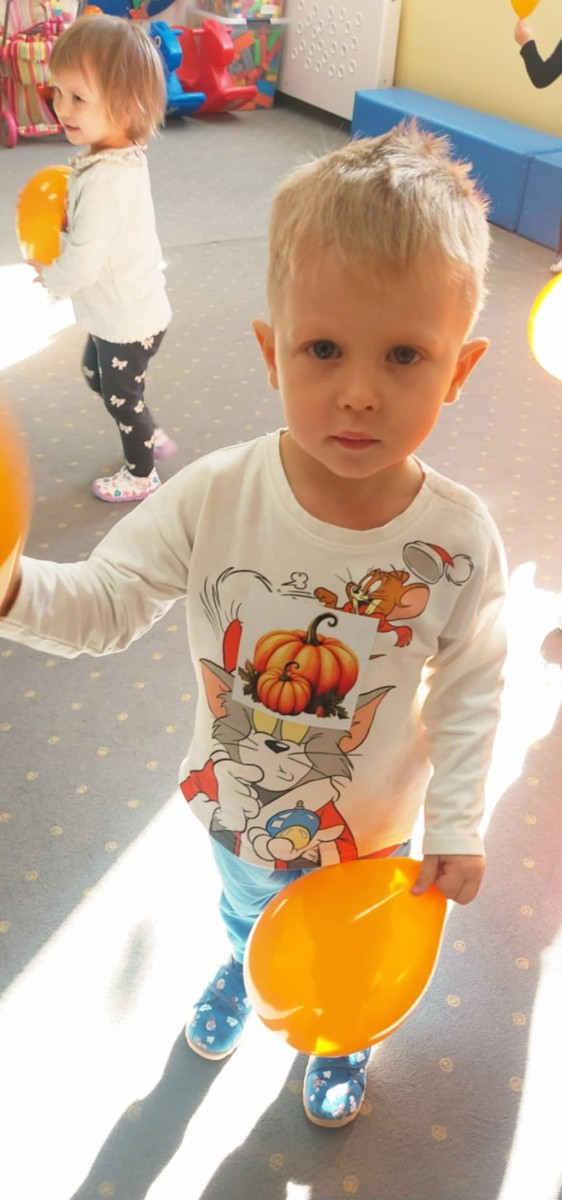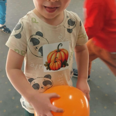 Integracja grupy poprzez wspólne tańce z pomarańczowymi balonikami.