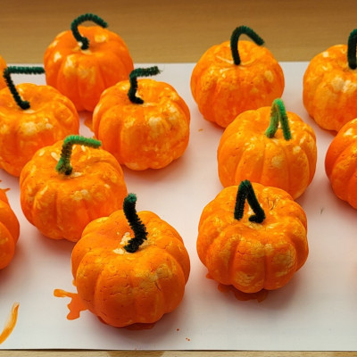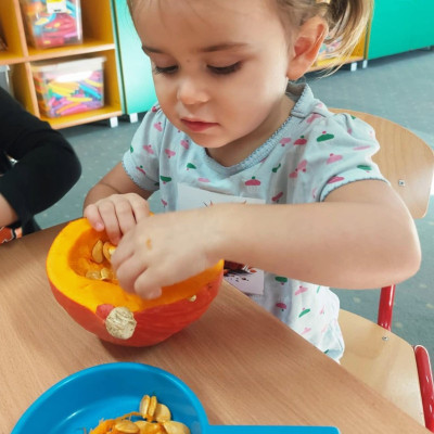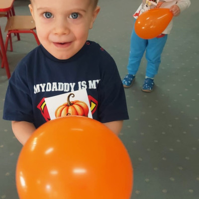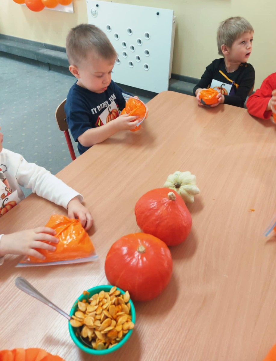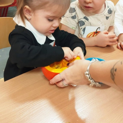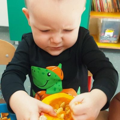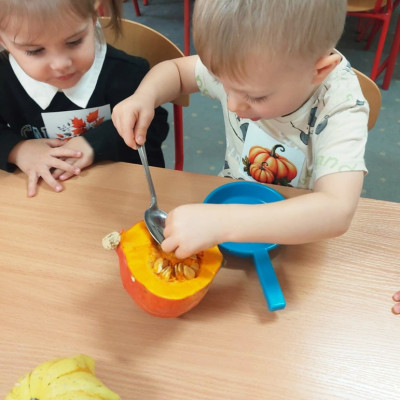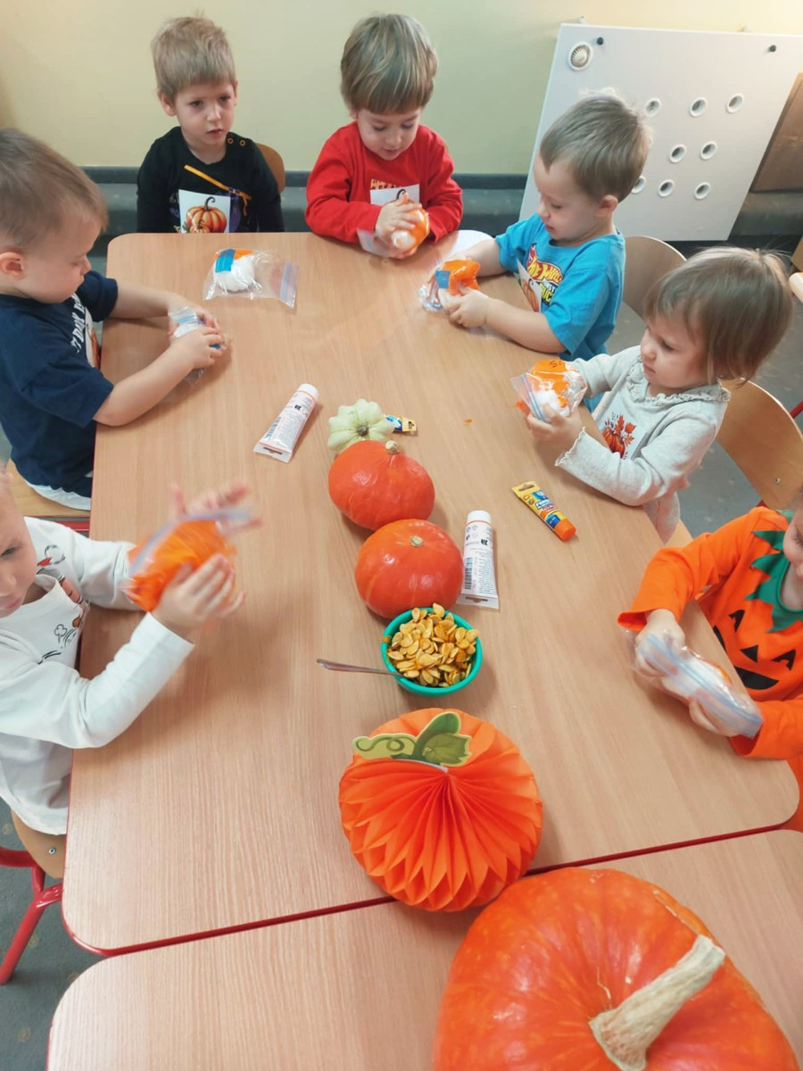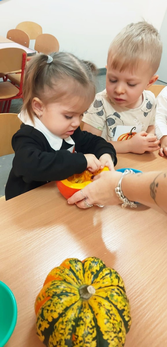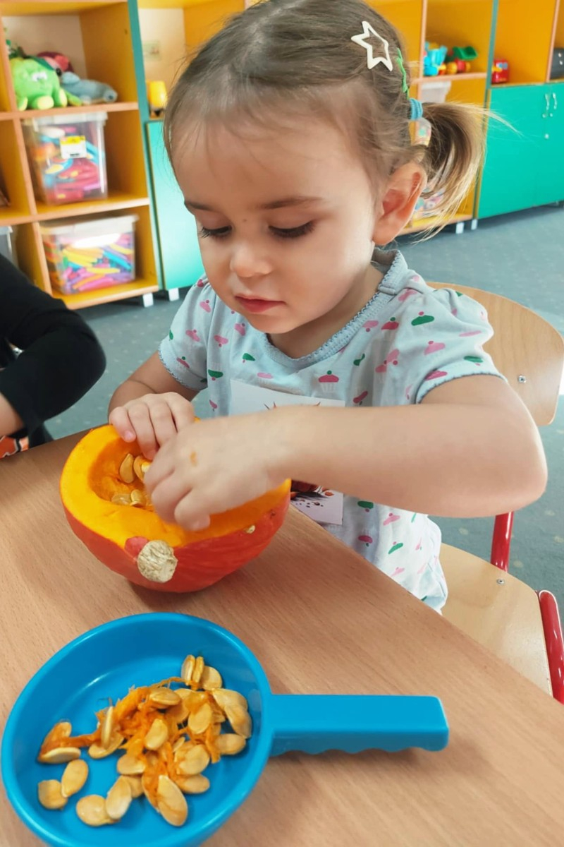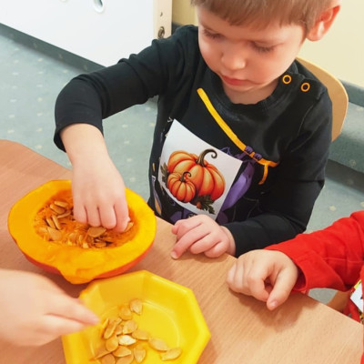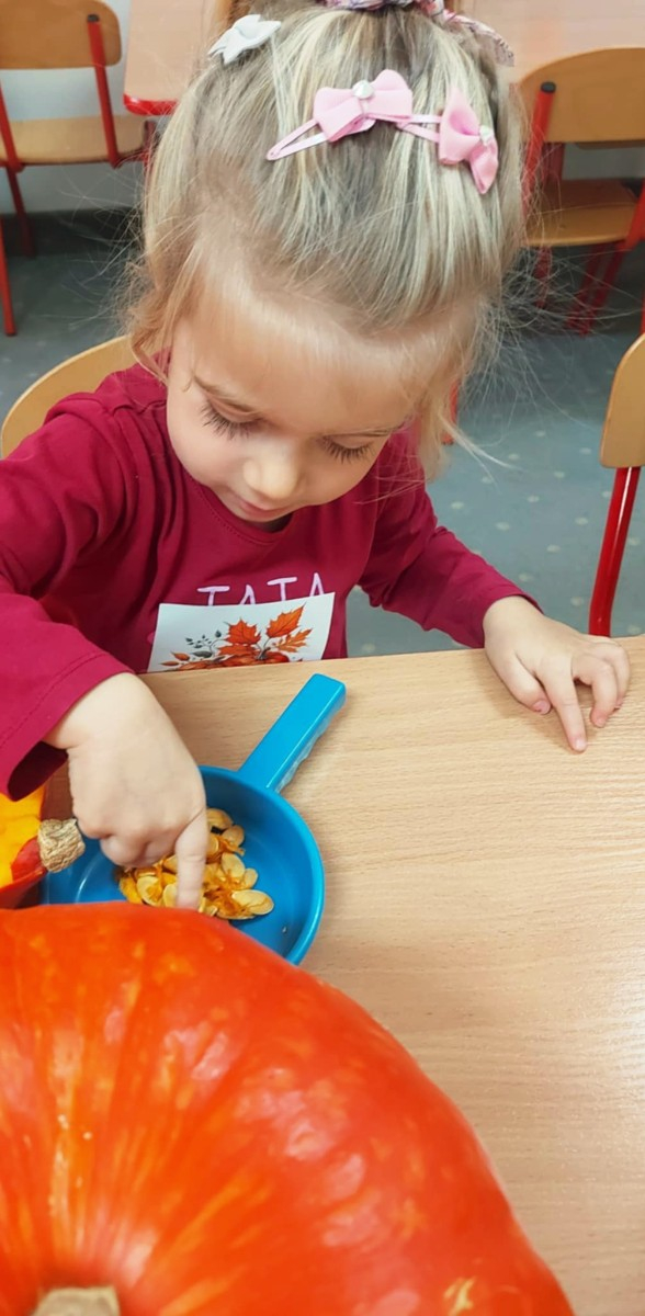 ,,Dzień Dyni " to dobry powód do rozwijania u dzieci zmysłów, poprzez dotyk, zapach i kolor. Podczas wydrążania oraz farbowania dyni maluchy ćwiczą  motorykę małą.
