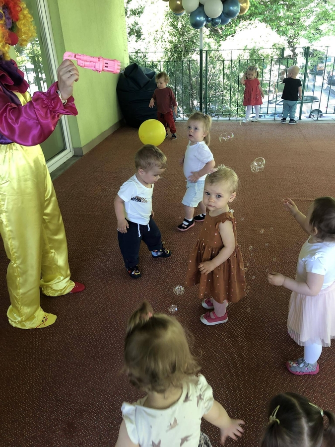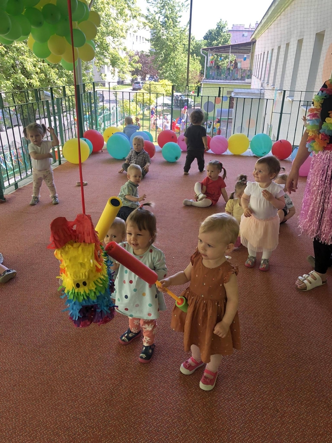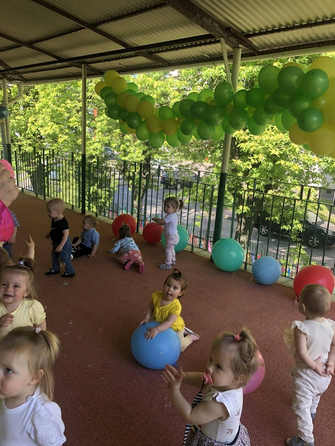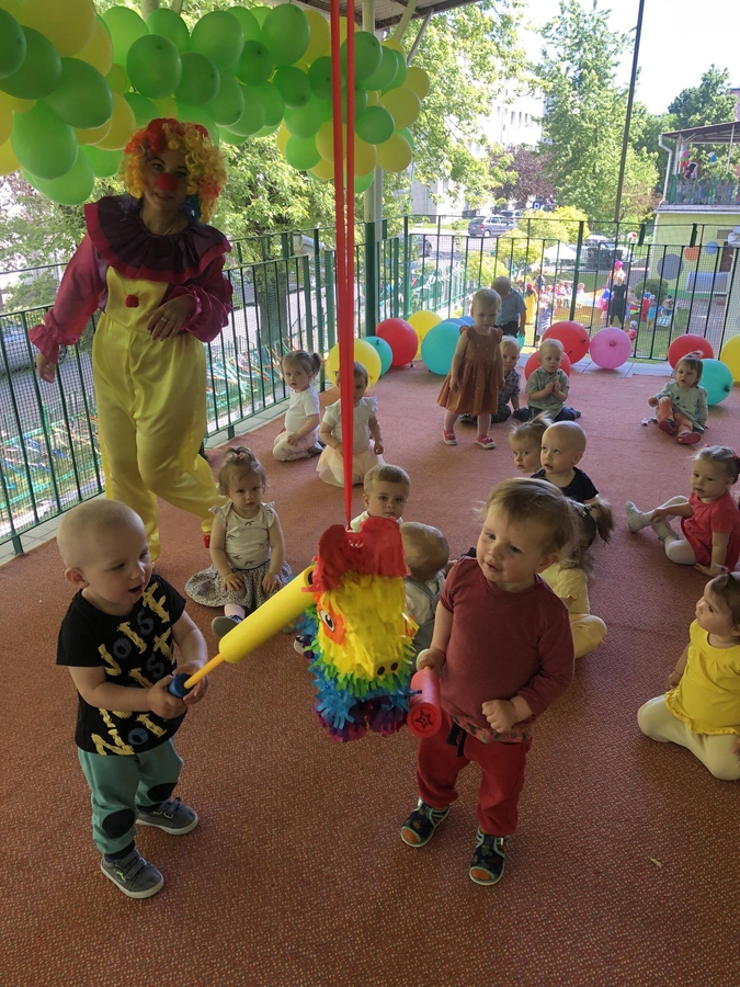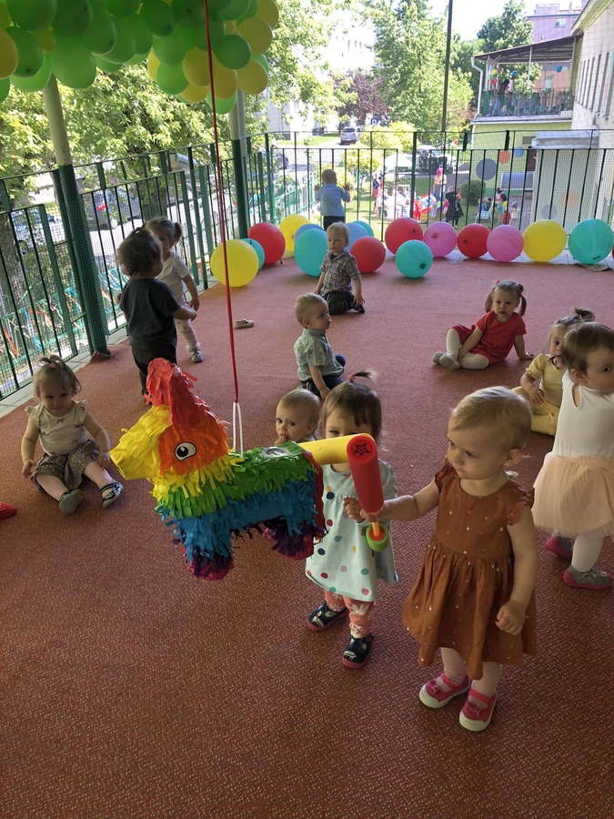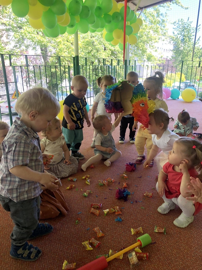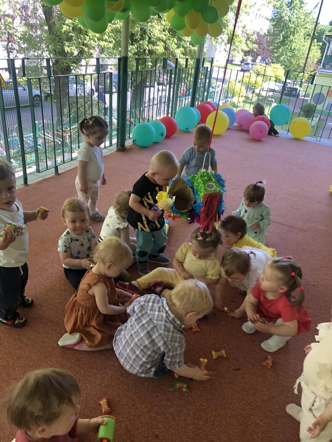 Dziś dzieci z grupy ,,Biedroneczki" wraz ze swoimi opiekunkami na pięknie przystrojonym balonami tarasie świętowały swój dzień.