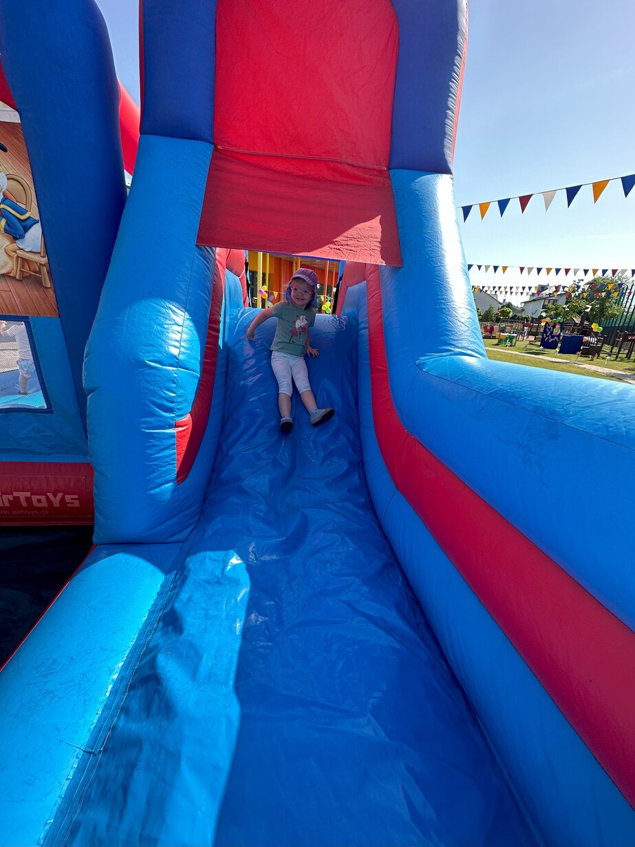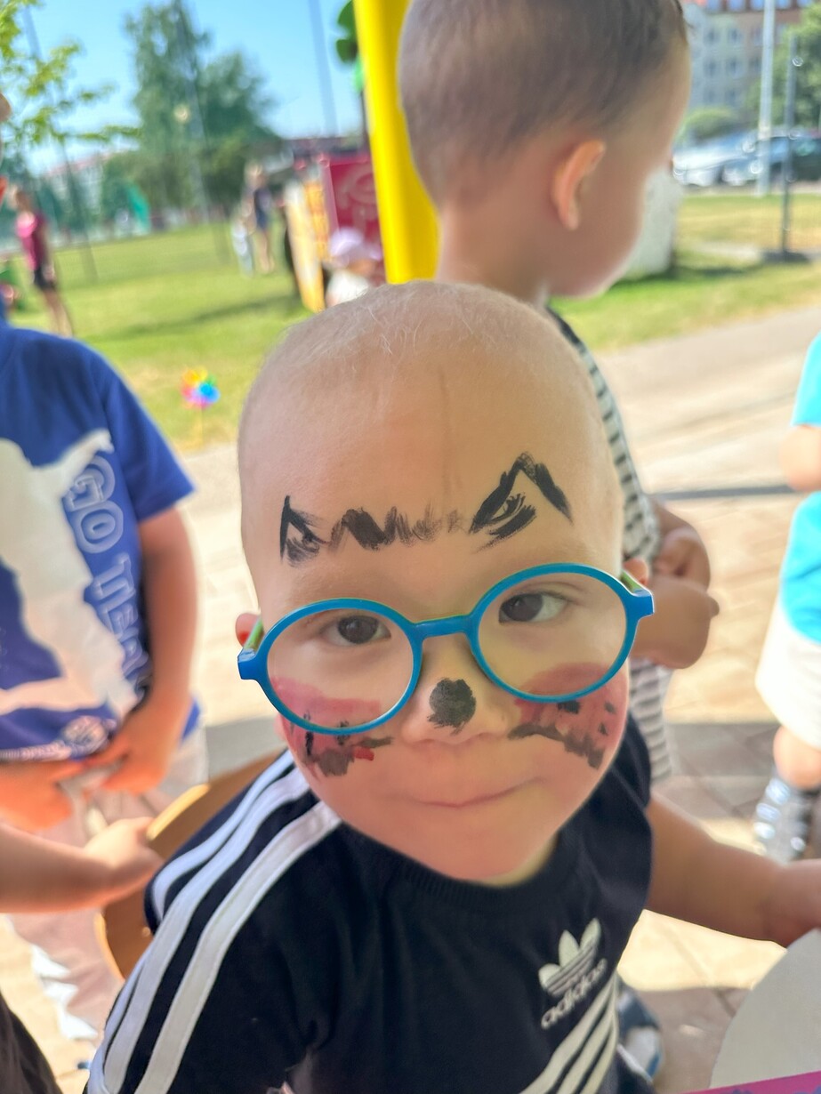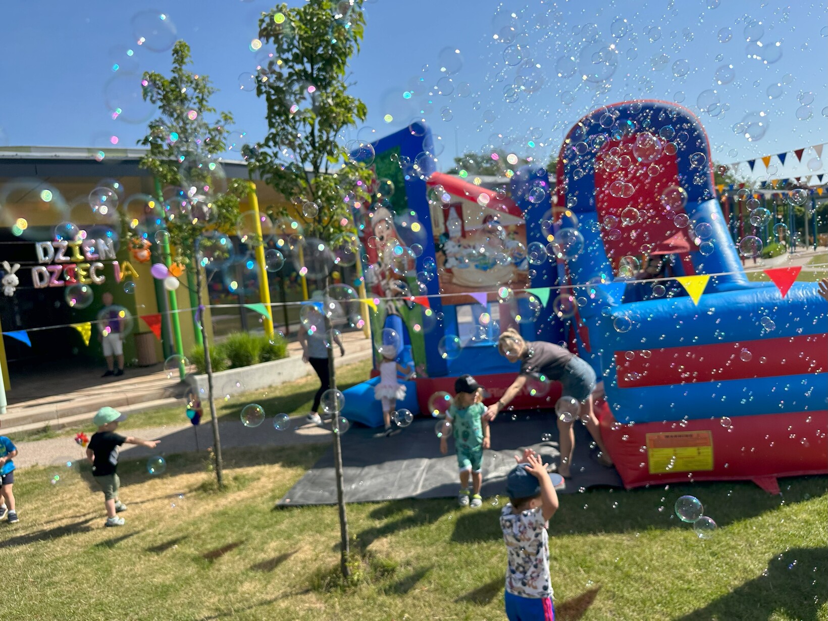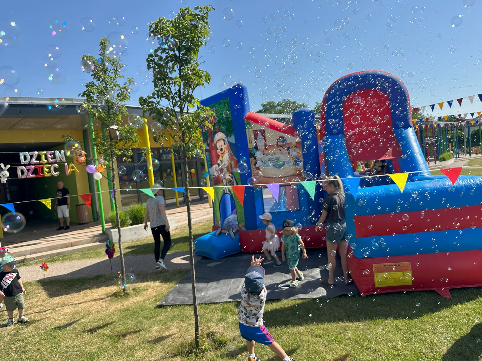 Z okazji Dnia Dziecka w naszym żłobku było wiele atrakcji, takich jak: dmuchany plac zabaw, kolorowe bańki mydlane, czy malowanie twarzy. Gdy część dzieci „szalała” na dmuchańcach, to pozostałe świetnie bawiły się biorąc udział w zabawach na świeżym powietrzu. Było także słodkie „co nieco”, czyli pyszne owoce z bitą śmietaną. Zabawa była, jak zawsze udana i wesoła! Na koniec dnia każde dziecko otrzymało prezent.