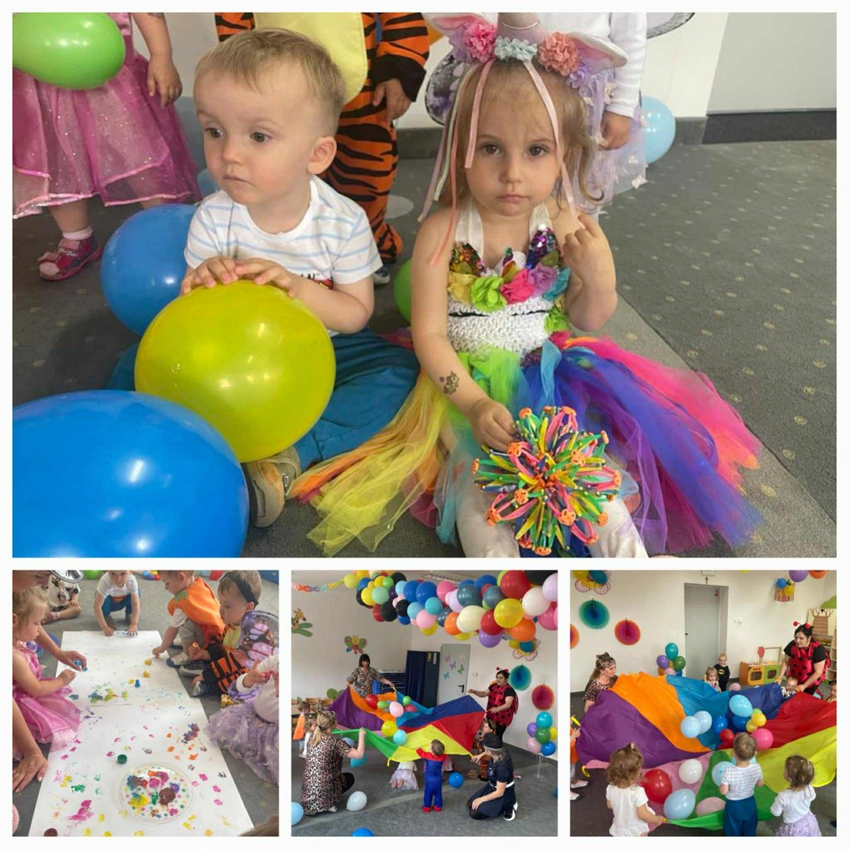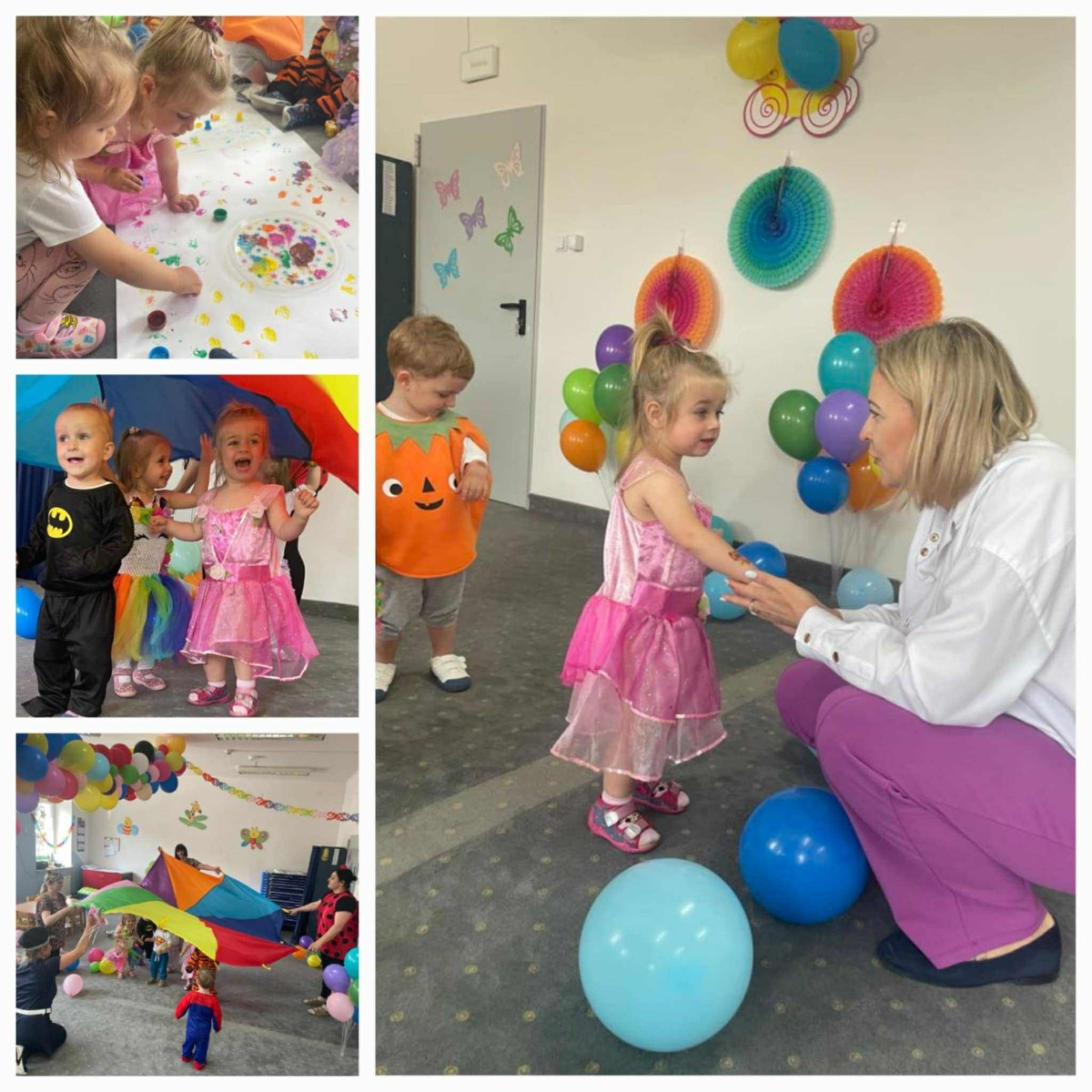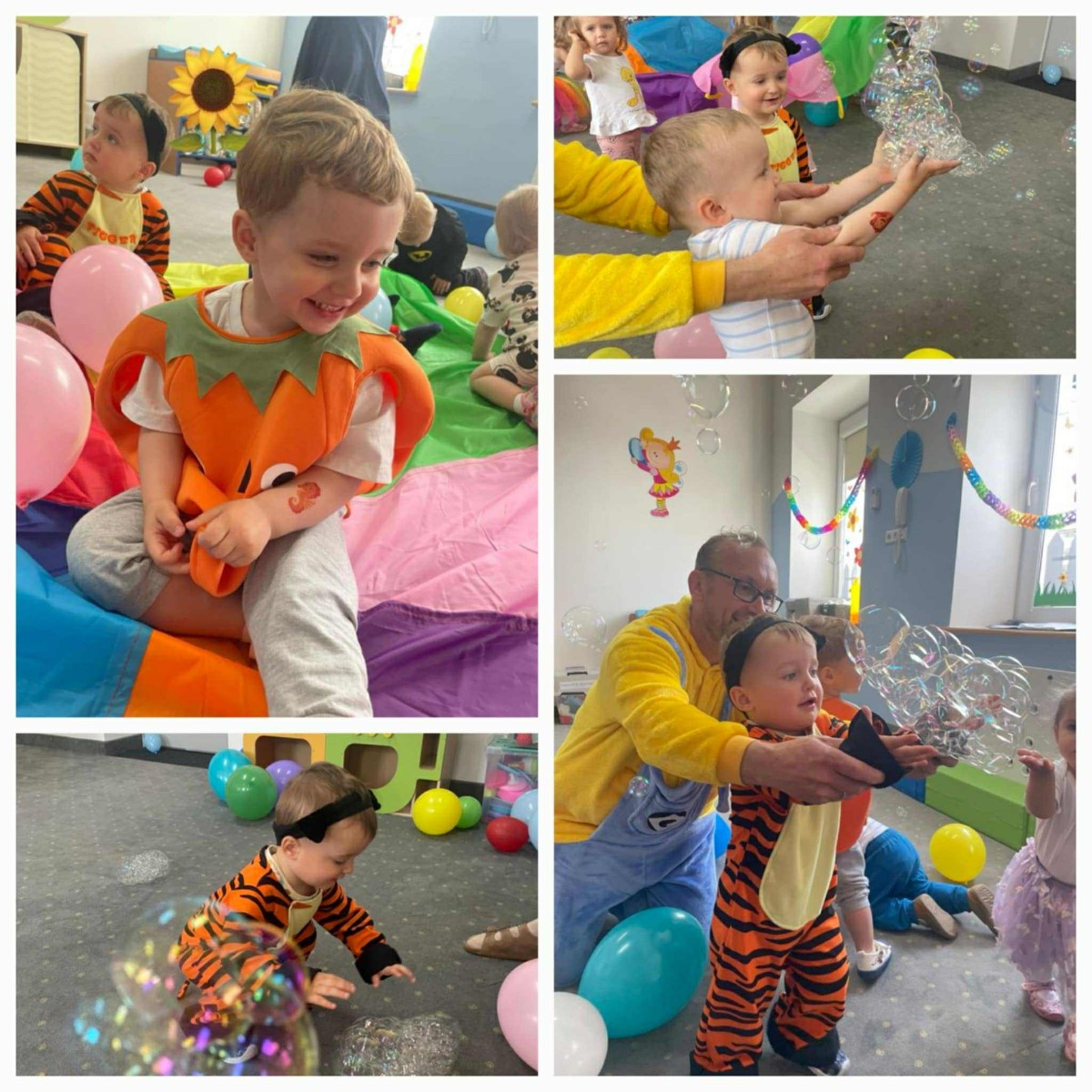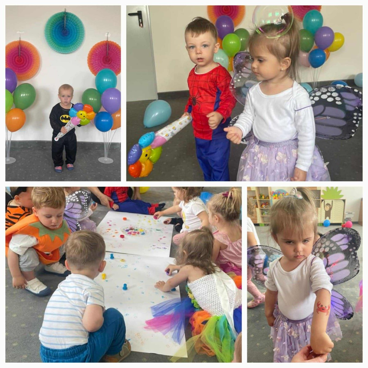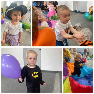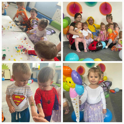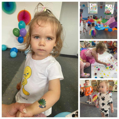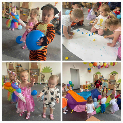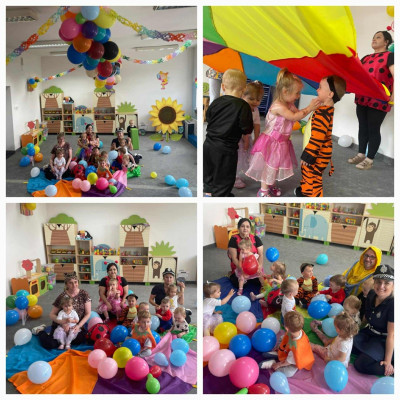 W Dzień Dziecka w naszym żłobku było dużo zabaw, radości, uśmiechu oraz niezapomnianych wrażeń. Były tańce, kolorowe balony, zabawy z chustą, odbijanie stempelków, robienie tatuaży i puszczanie baniek mydlanych.