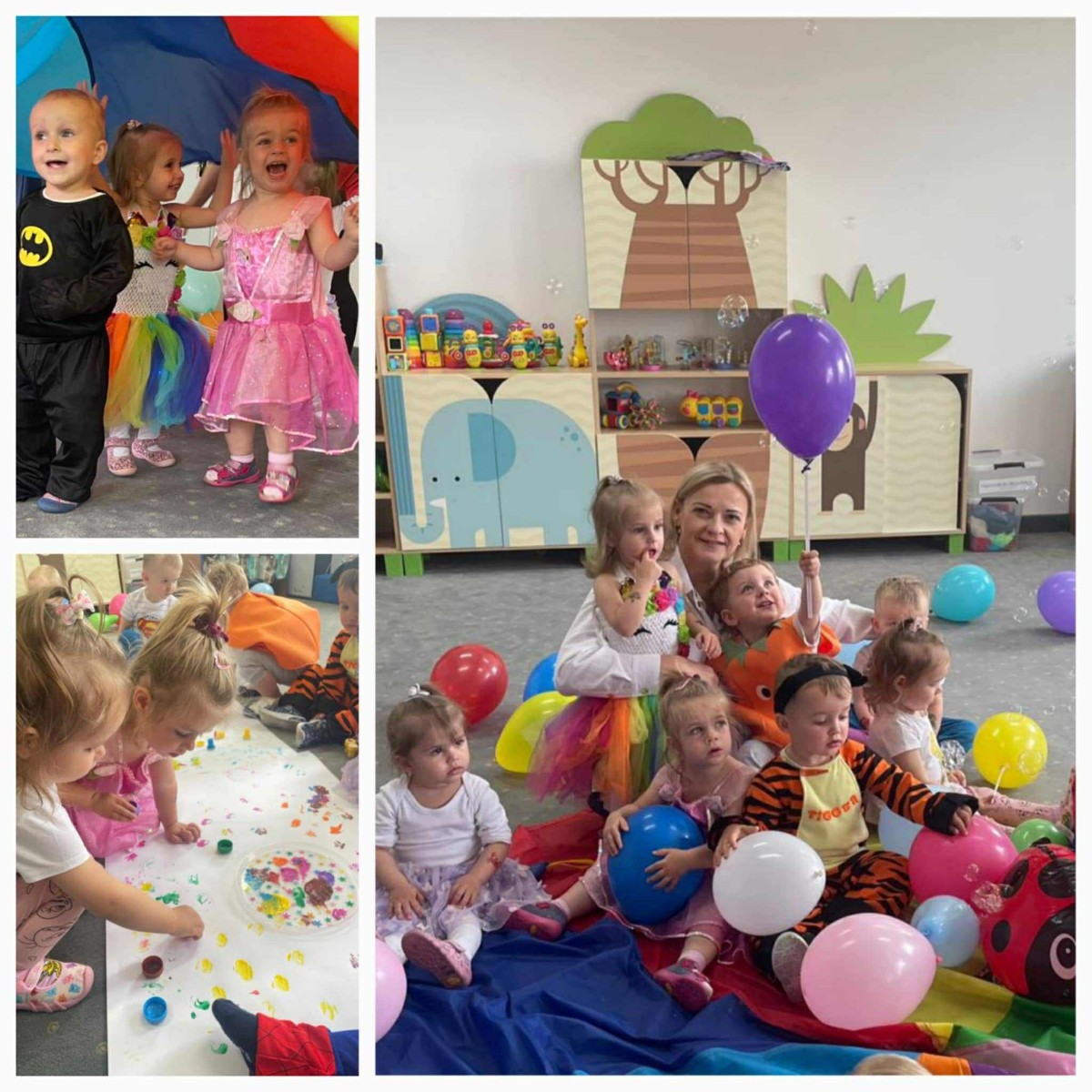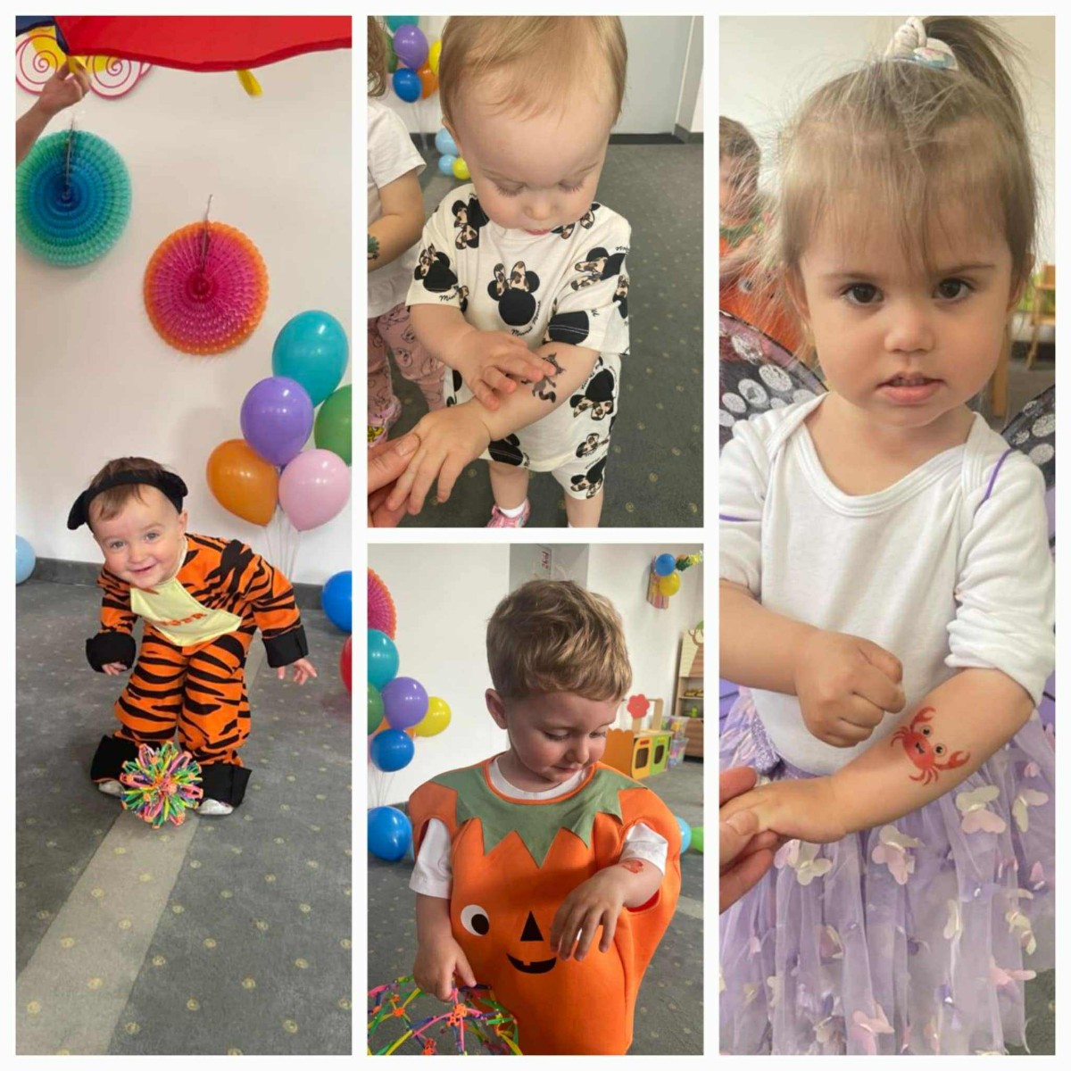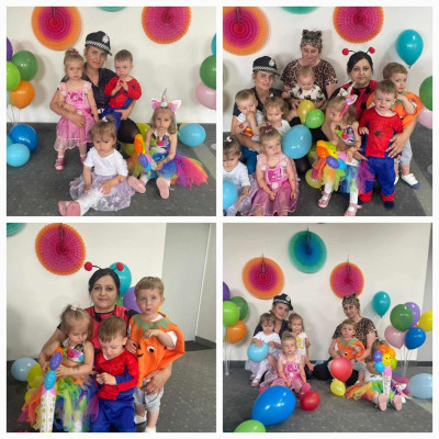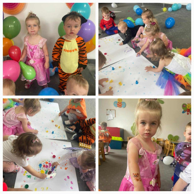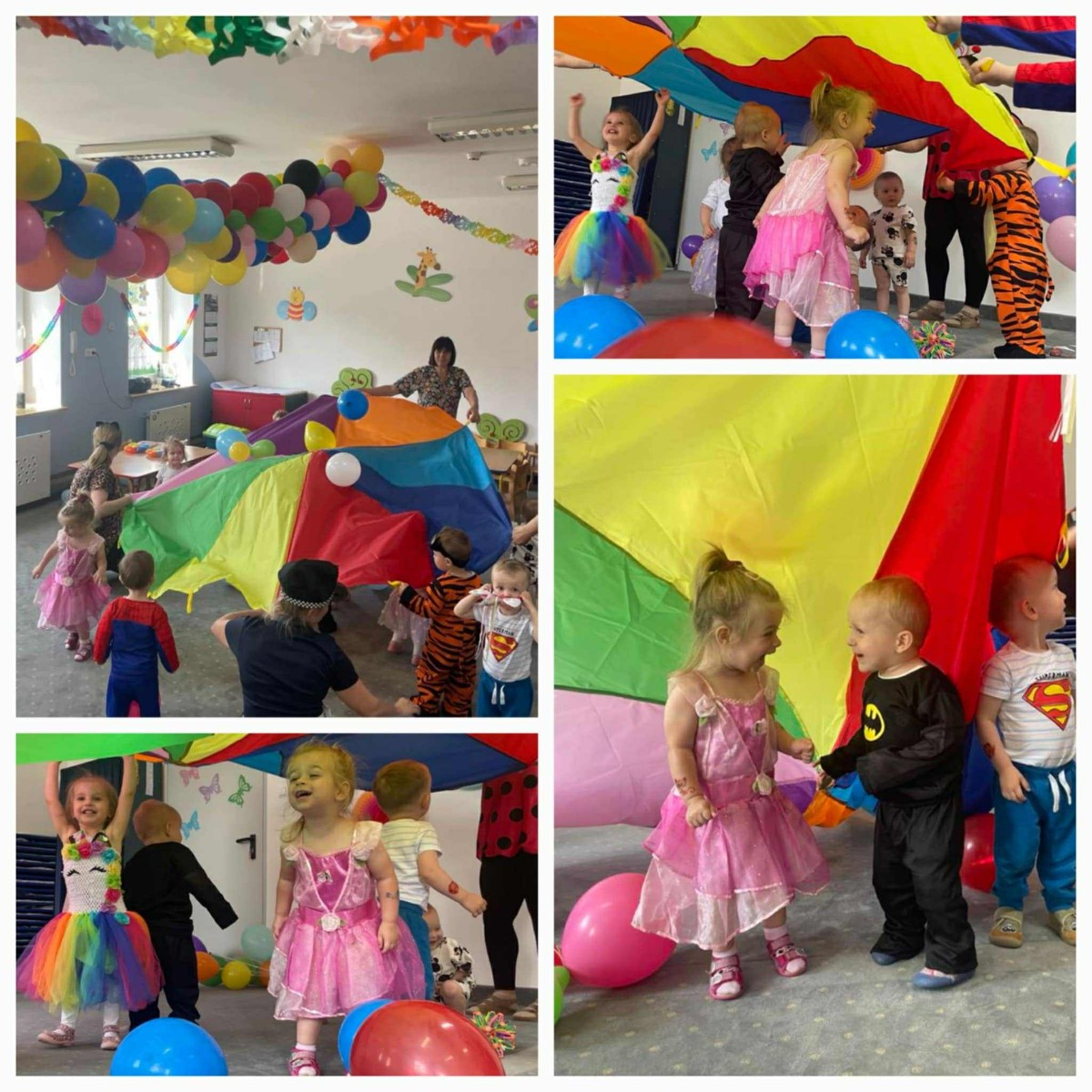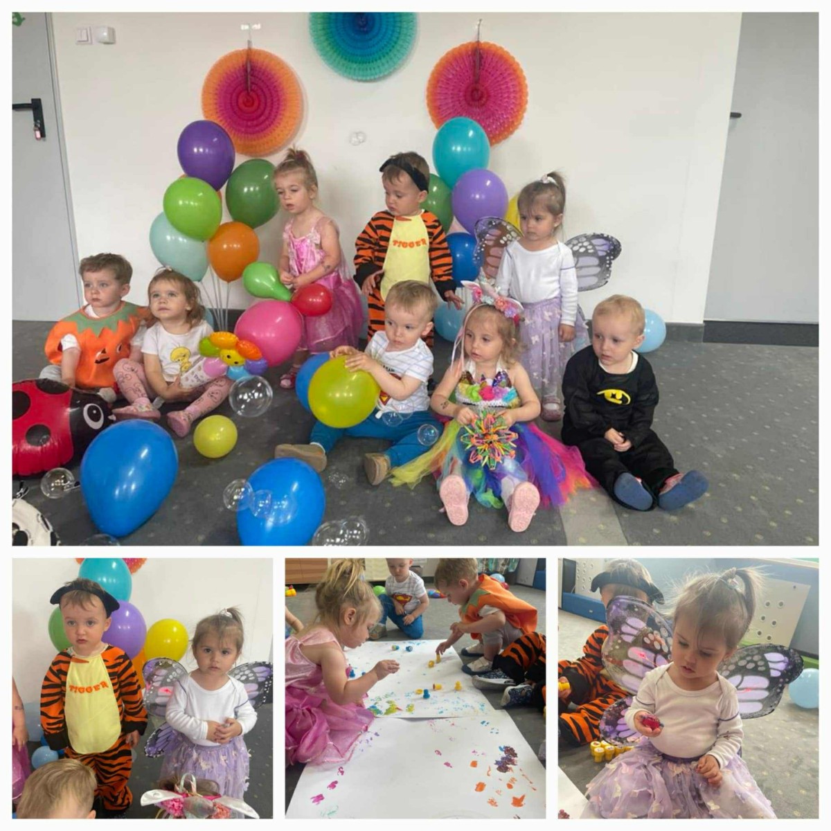 W Dzień Dziecka w naszym żłobku było dużo zabaw, radości, uśmiechu oraz niezapomnianych wrażeń. Były tańce, kolorowe balony, zabawy z chustą, odbijanie stempelków, robienie tatuaży i puszczanie baniek mydlanych.