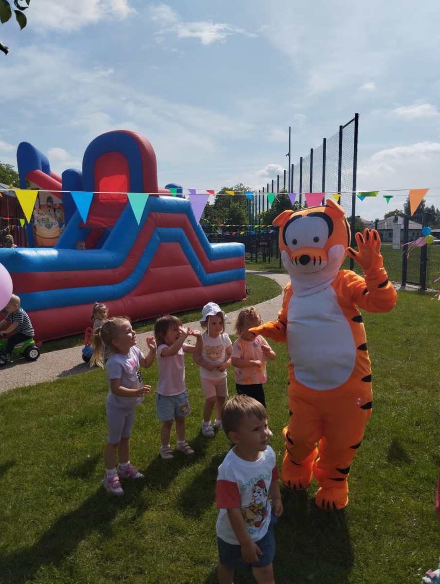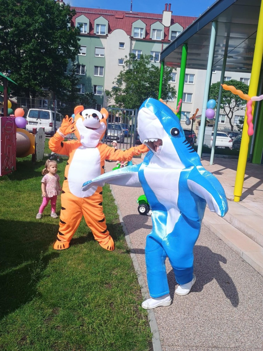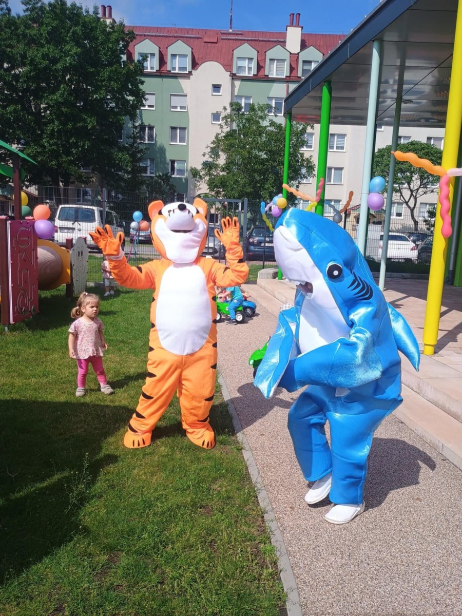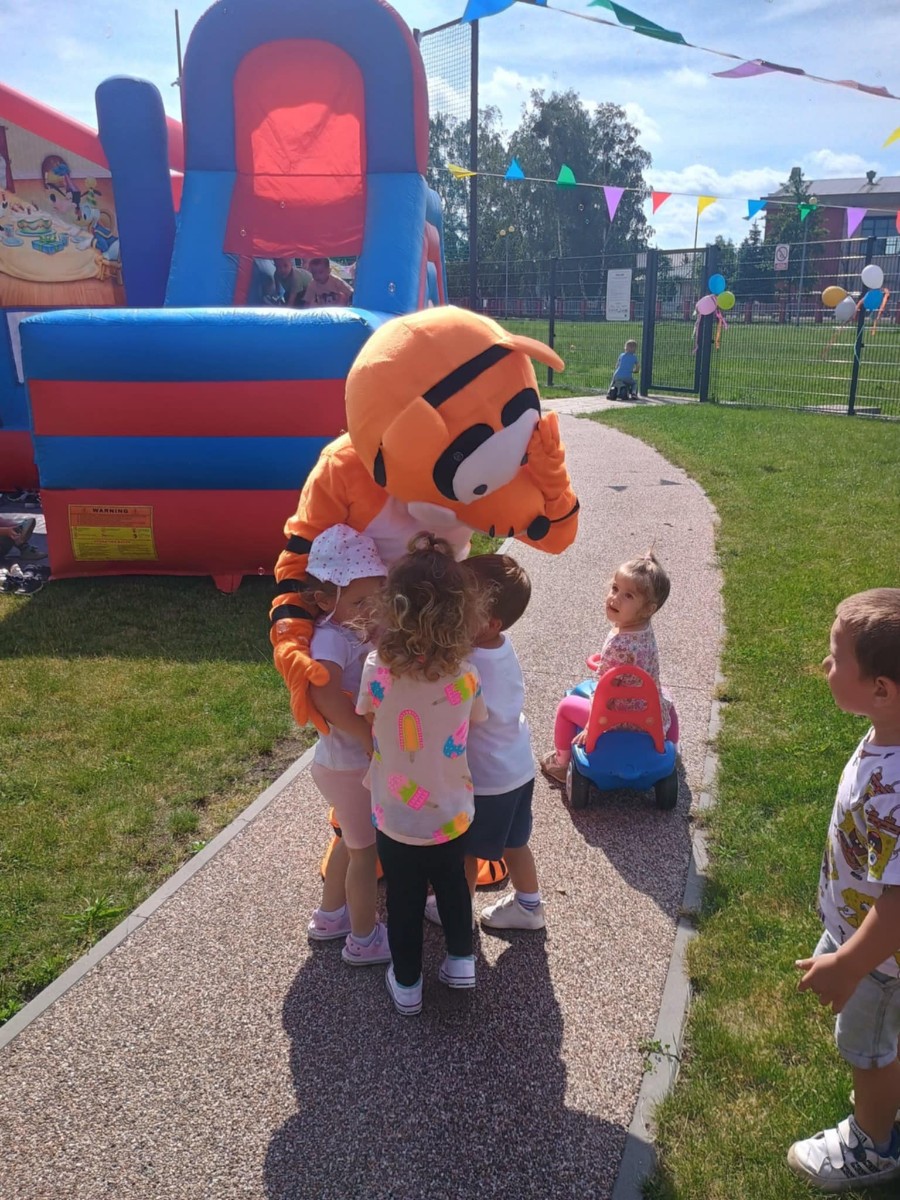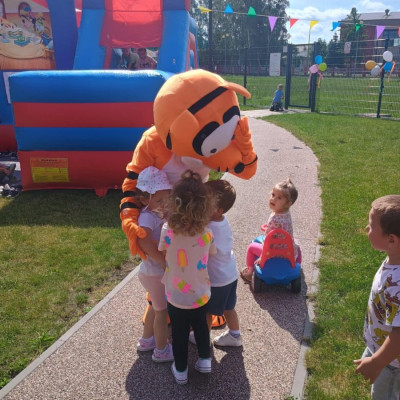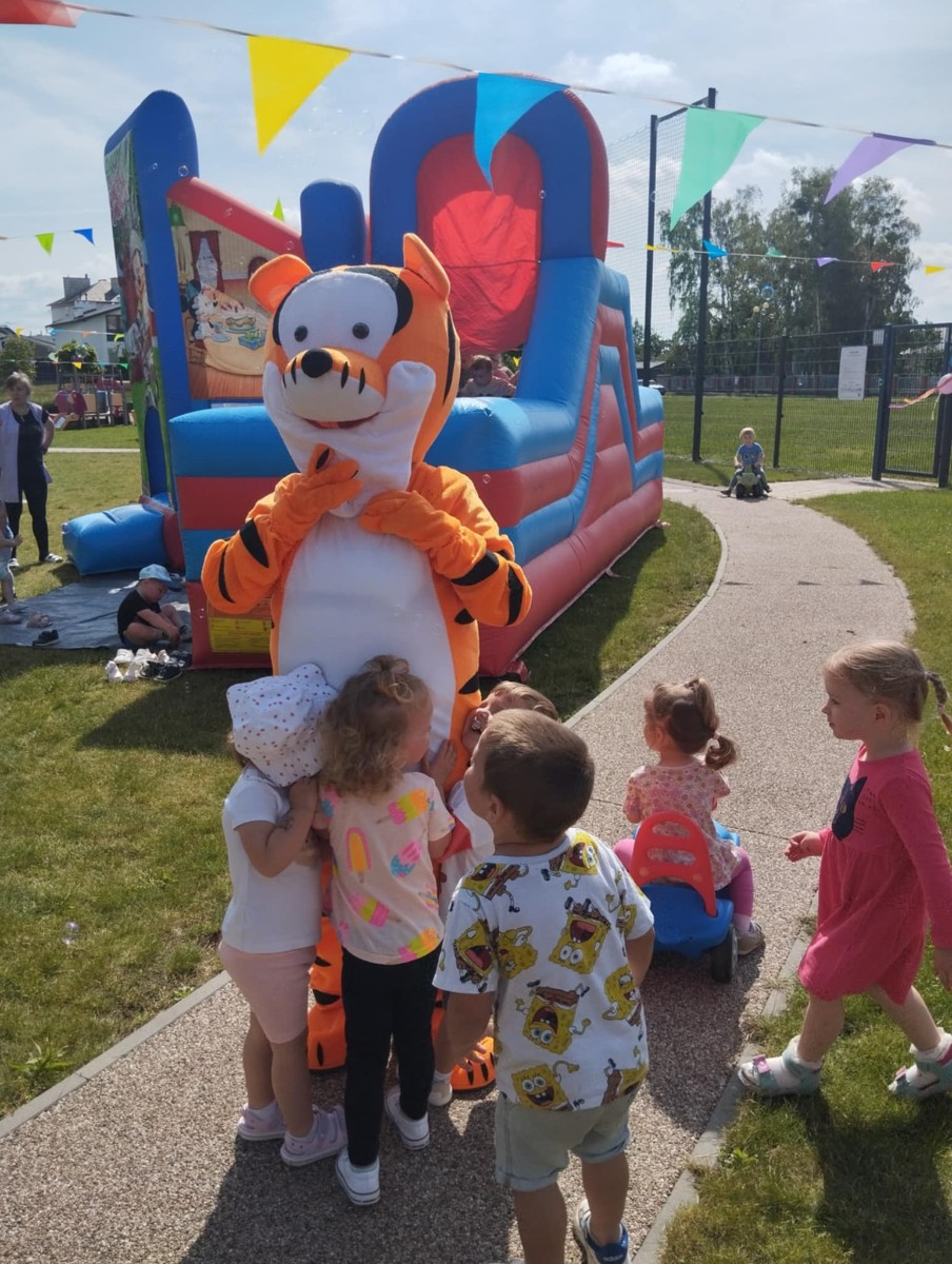 Od samego rana dzieci bawiły się tańcząc przy muzyce oraz śpiewając piosenki. Zaraz po śniadaniu dzieci wyruszyły na spacer do ogródka, w którym czekały ich atrakcje. Dmuchaniec, skakaniec Mickey był główną atrakcją dnia. Dzieci skakały, wspinały się, ślizgały ze zjeżdżalni, turlały. Każda grupa miała swój czas na zabawy, radości było co nie miara. Na naszej zabawie nie mogło zabraknąć starych znajomych Tygryska i Rekinka, którzy przybyli powygłupiać się z dziećmi.