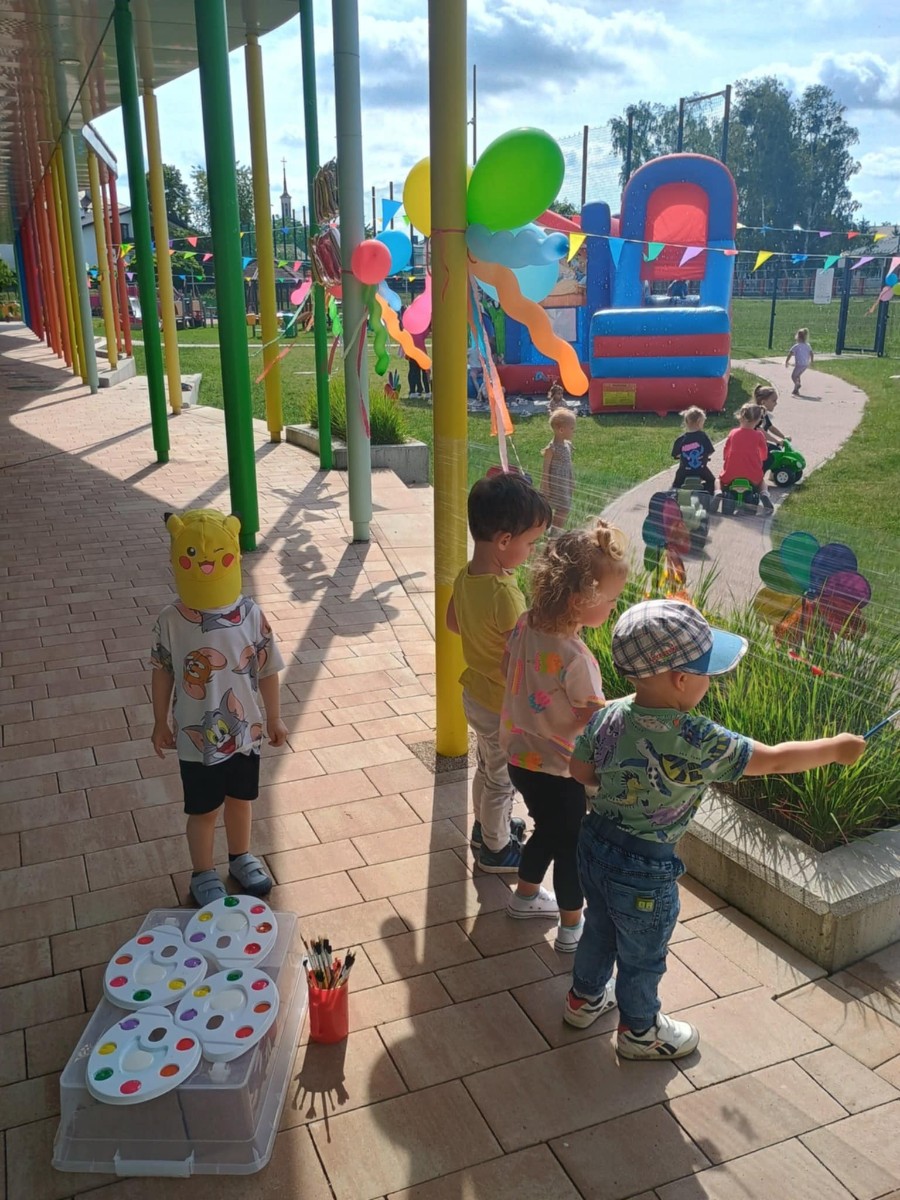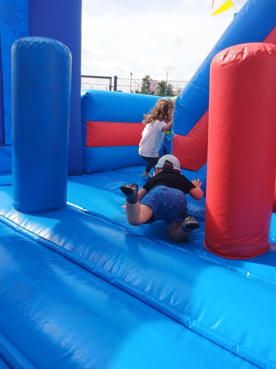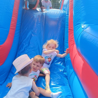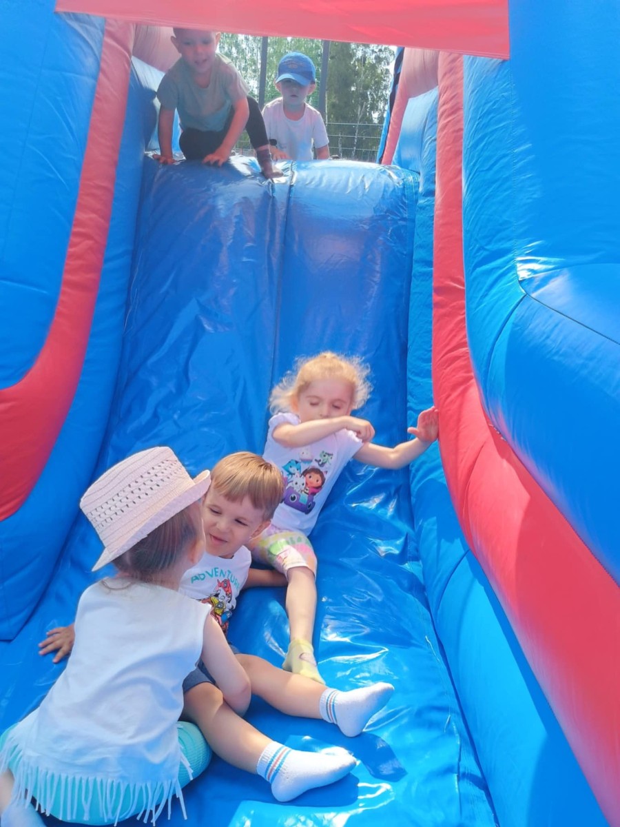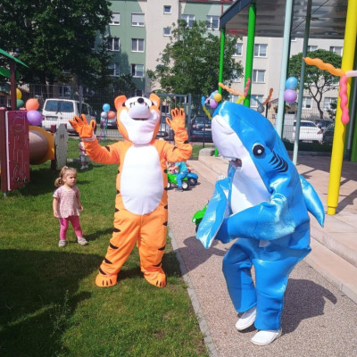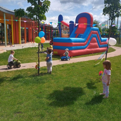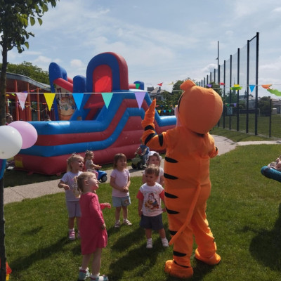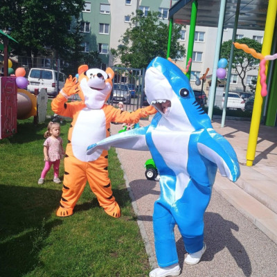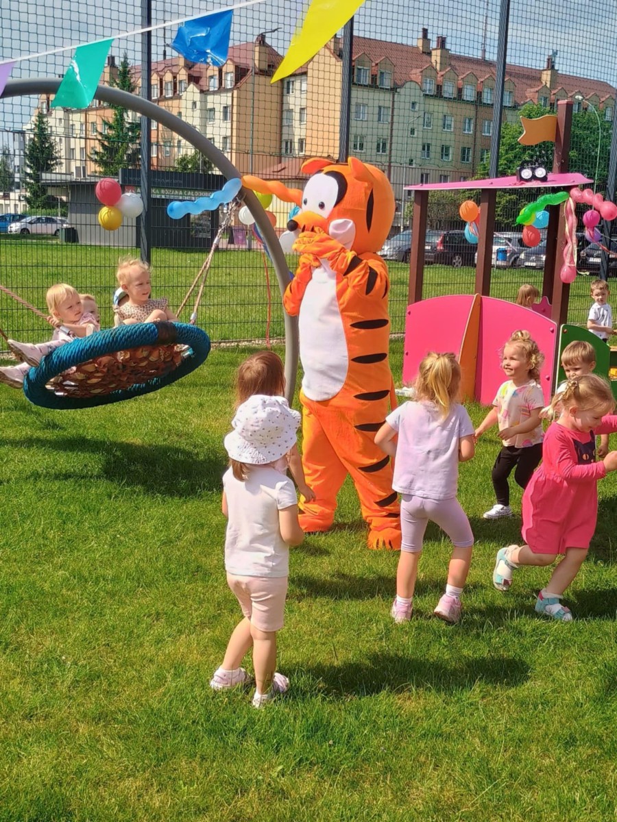 Od samego rana dzieci bawiły się tańcząc przy muzyce oraz śpiewając piosenki. Zaraz po śniadaniu dzieci wyruszyły na spacer do ogródka, w którym czekały ich atrakcje. Dmuchaniec, skakaniec Mickey był główną atrakcją dnia. Dzieci skakały, wspinały się, ślizgały ze zjeżdżalni, turlały. Każda grupa miała swój czas na zabawy, radości było co nie miara. Na naszej zabawie nie mogło zabraknąć starych znajomych Tygryska i Rekinka, którzy przybyli powygłupiać się z dziećmi.
