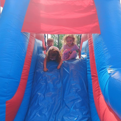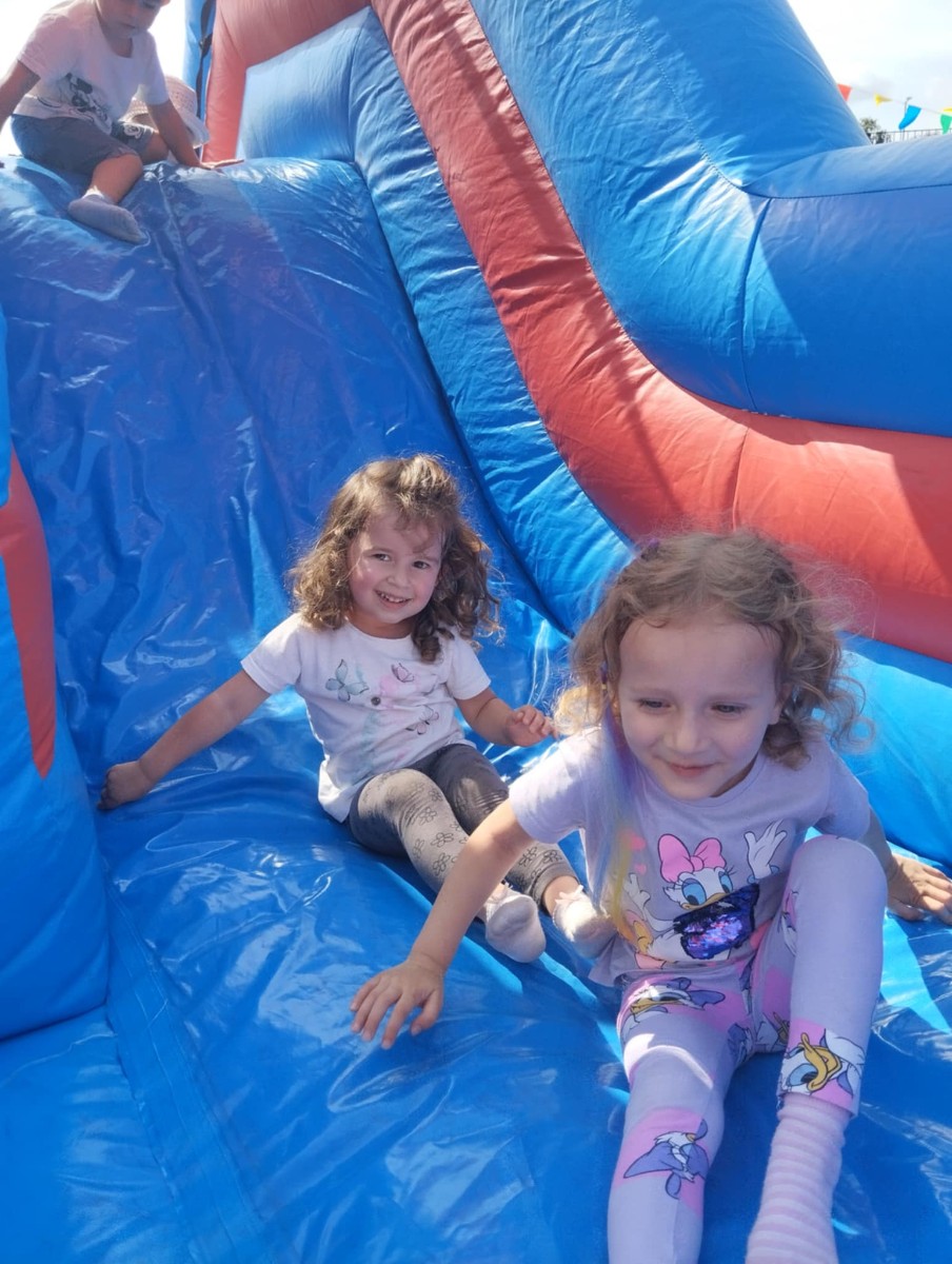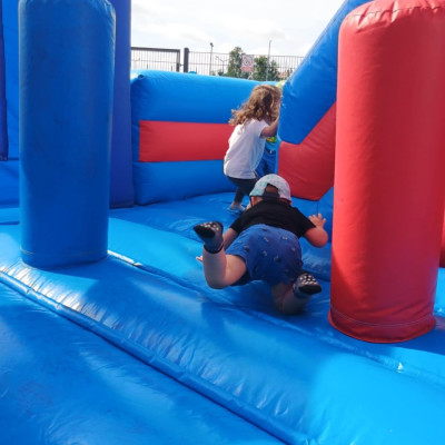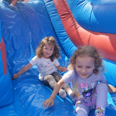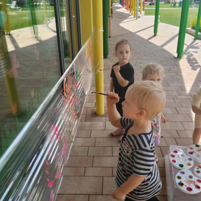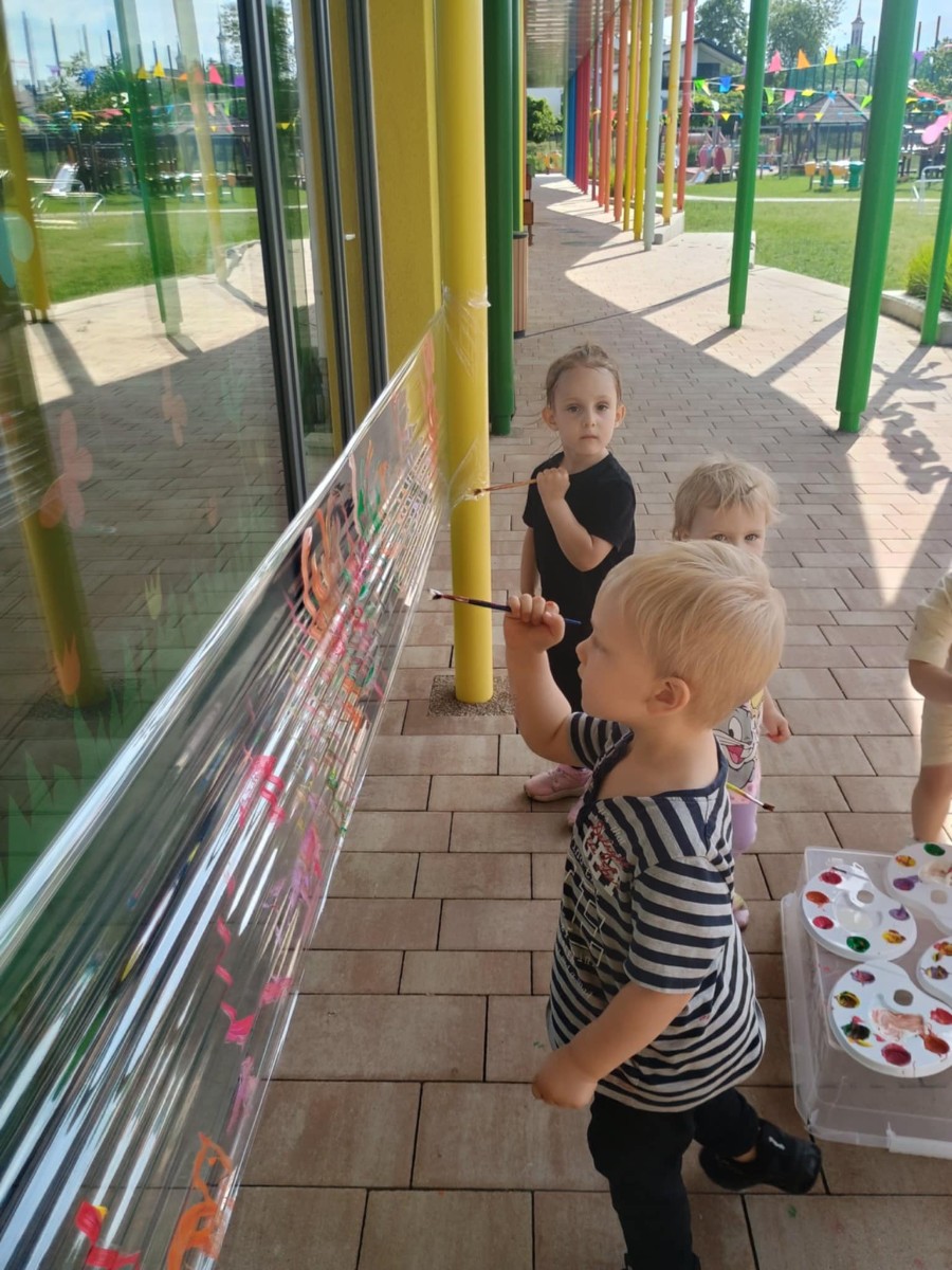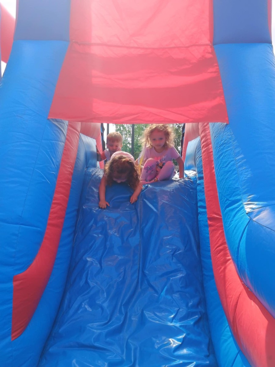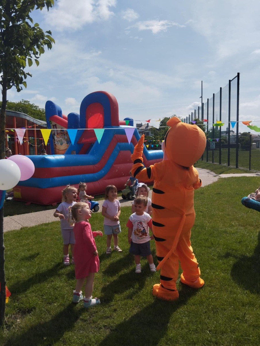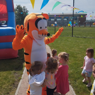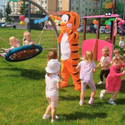 Od samego rana dzieci bawiły się tańcząc przy muzyce oraz śpiewając piosenki. Zaraz po śniadaniu dzieci wyruszyły na spacer do ogródka, w którym czekały ich atrakcje. Dmuchaniec, skakaniec Mickey był główną atrakcją dnia. Dzieci skakały, wspinały się, ślizgały ze zjeżdżalni, turlały. Każda grupa miała swój czas na zabawy, radości było co nie miara. Na naszej zabawie nie mogło zabraknąć starych znajomych Tygryska i Rekinka, którzy przybyli powygłupiać się z dziećmi.